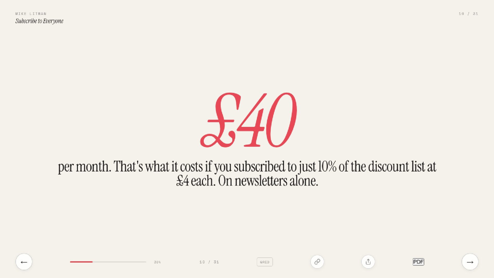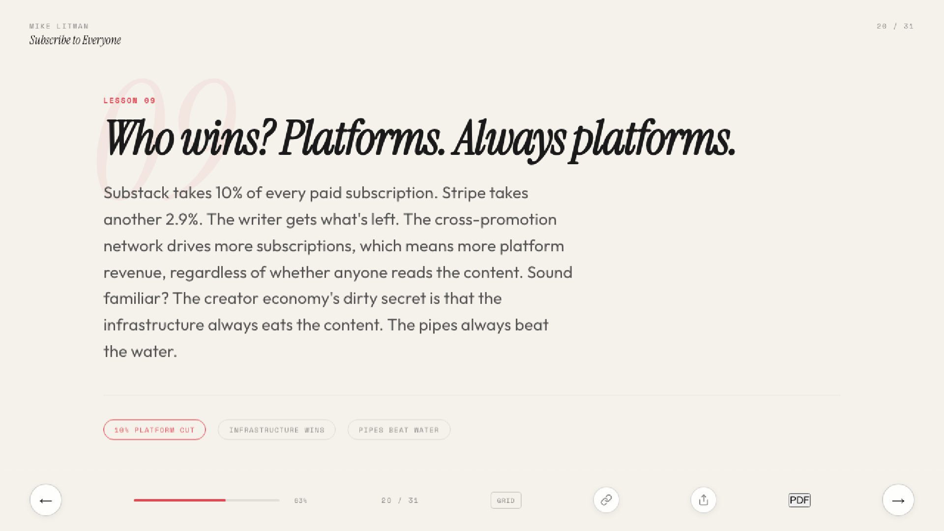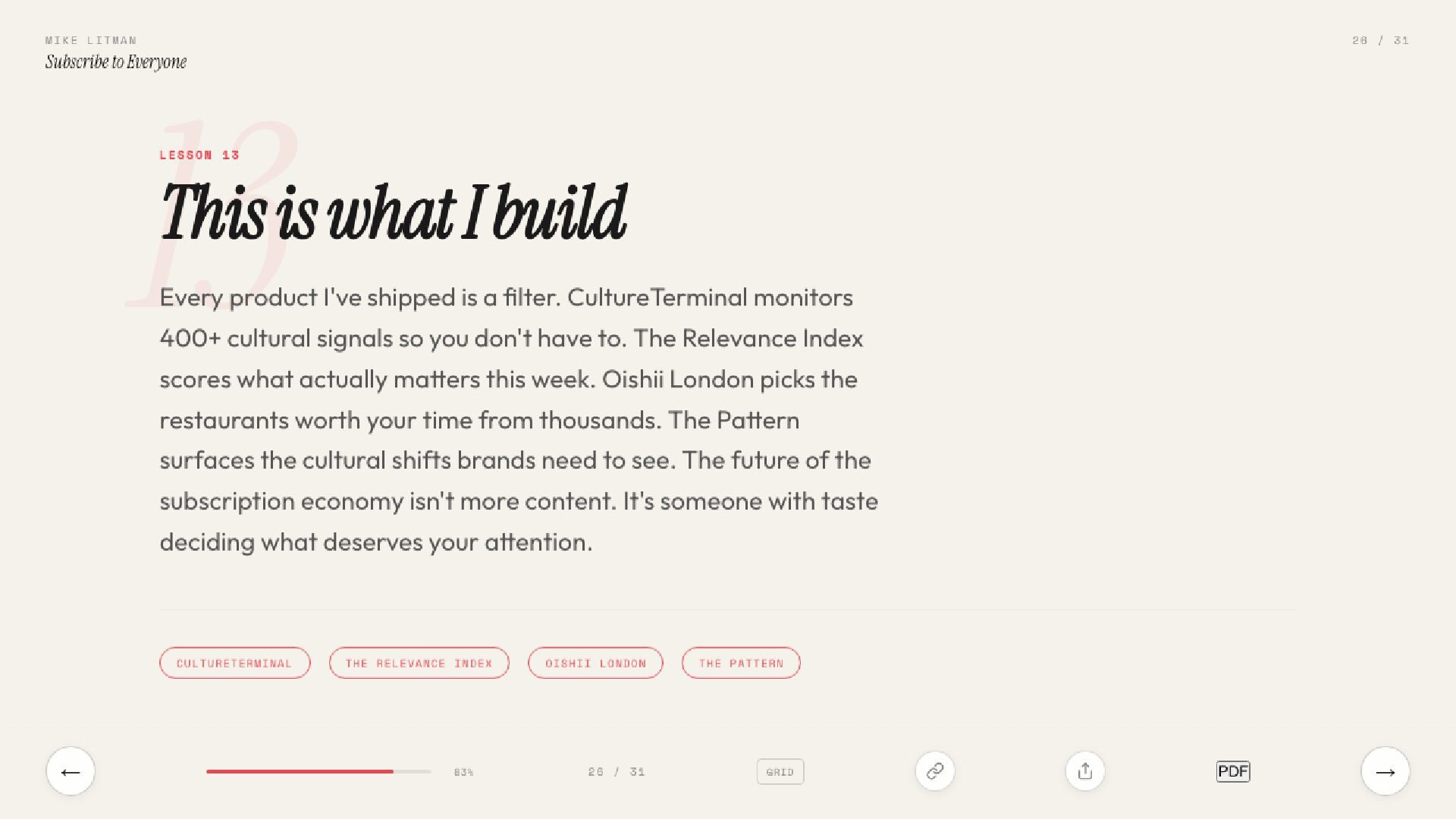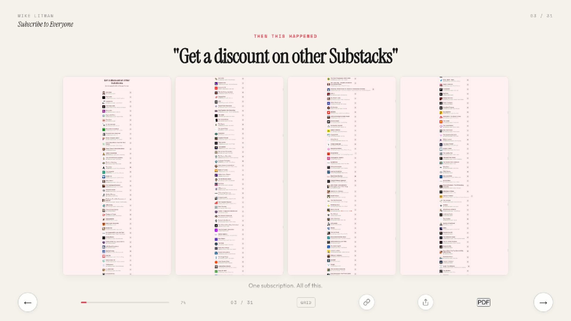 Is everything a subscription now? Is everyone? 29 slides on how we got here, why the discount wall is the new cable bundle, and where the subscription-to-people economy goes next.