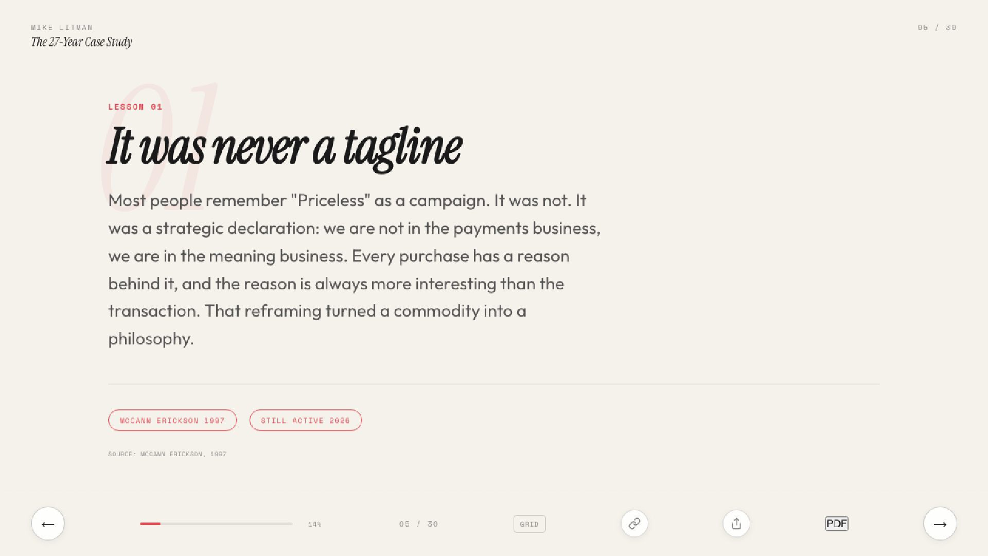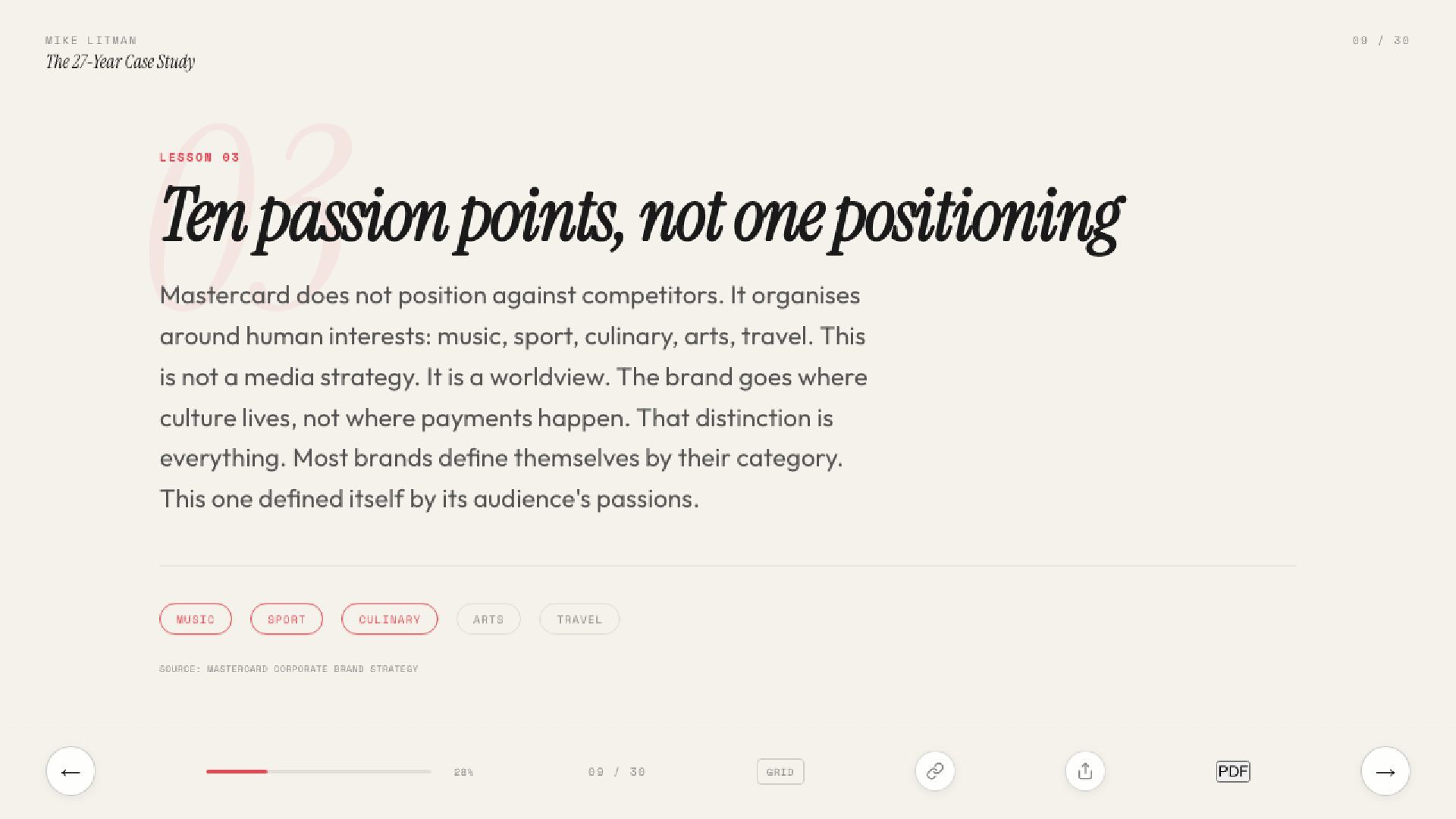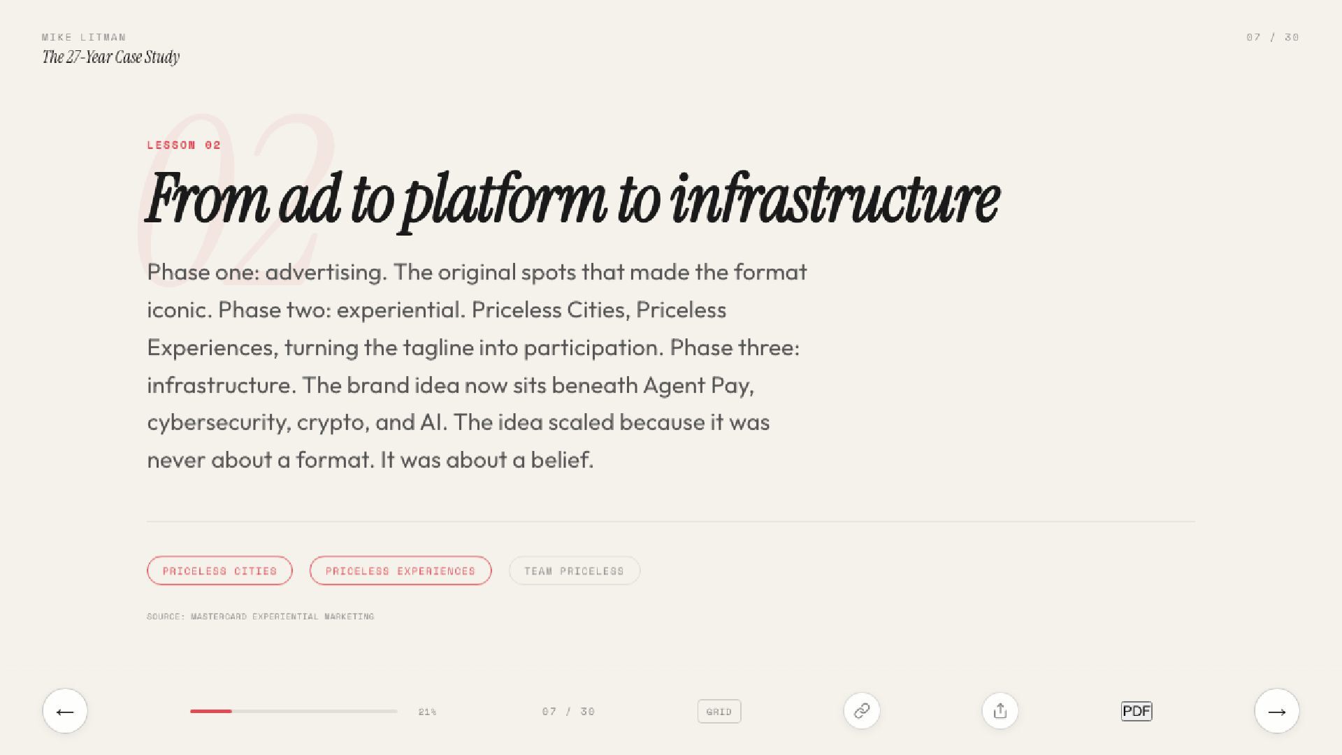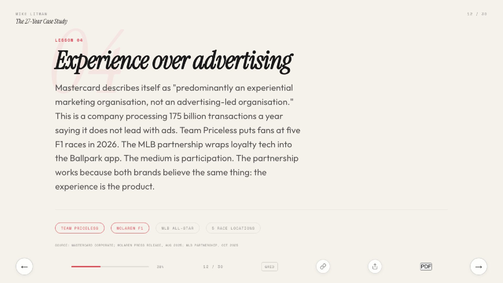 The 27-year case study in experience over product. 28 slides on why Mastercard's Priceless campaign is the longest-running proof that emotional value outlasts transactional value.