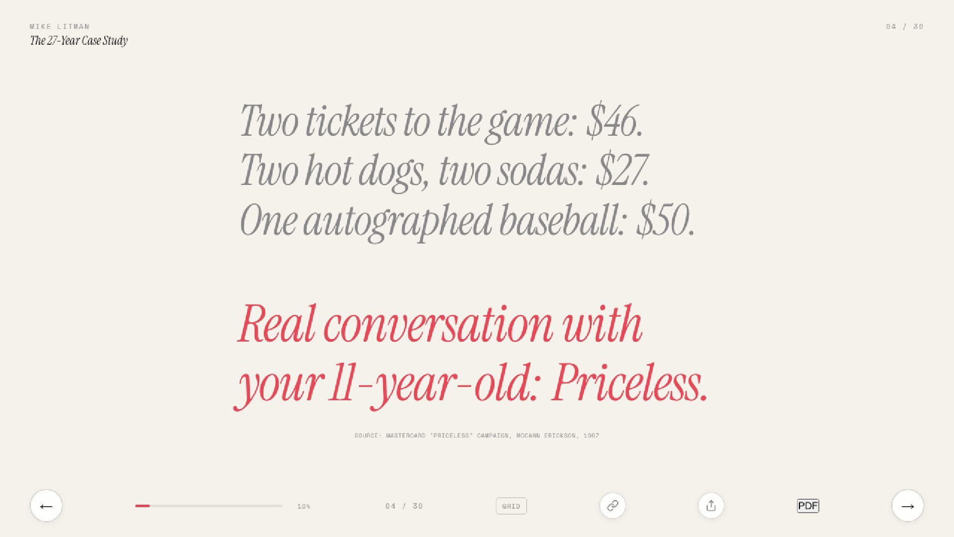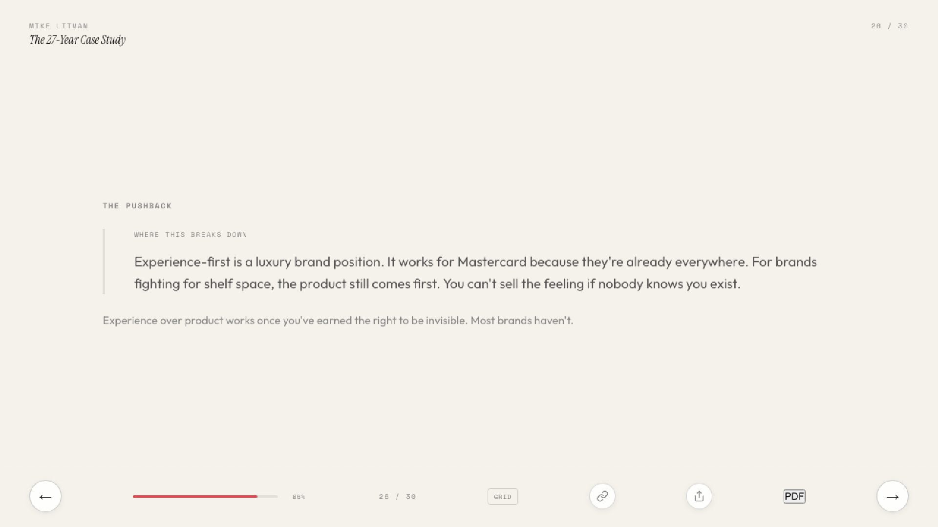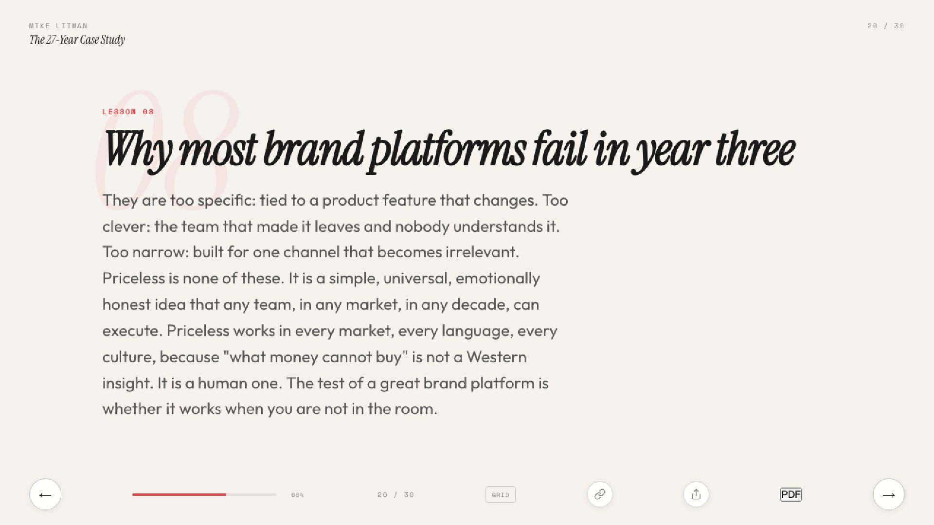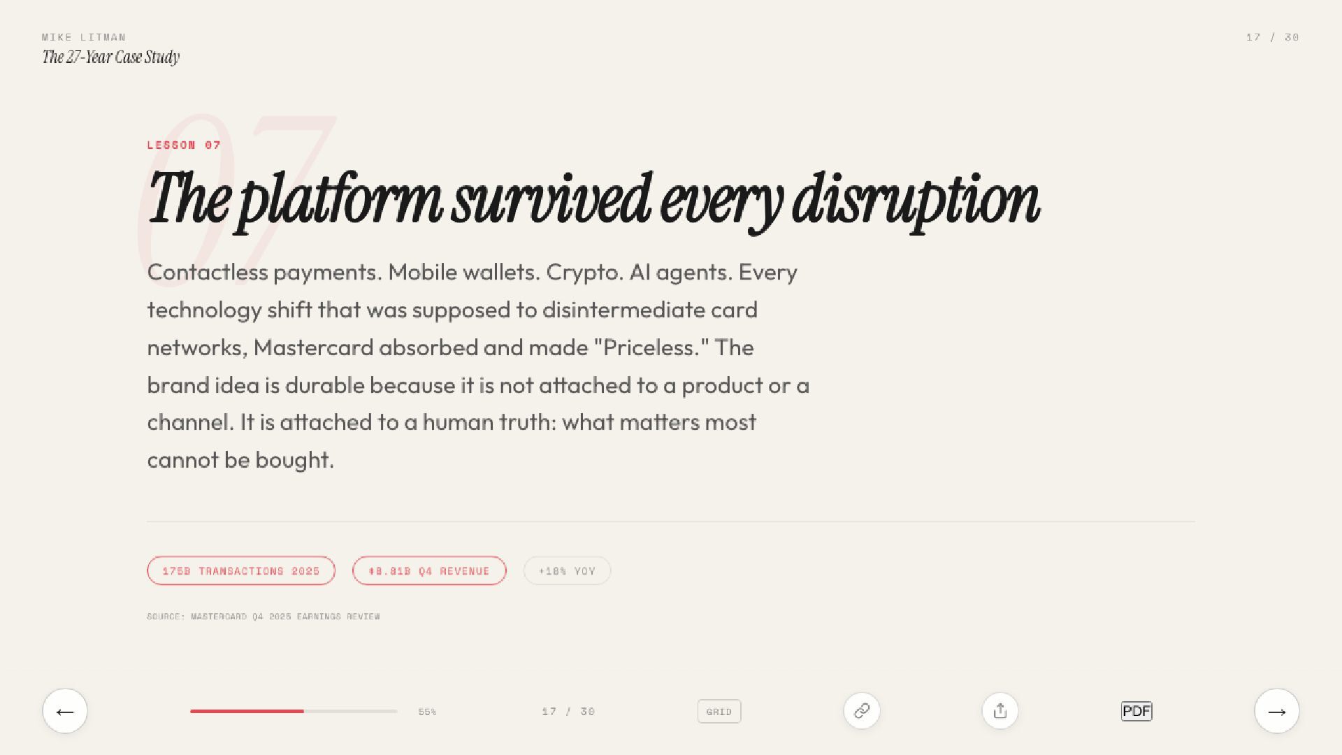 The 27-year case study in experience over product. 28 slides on why Mastercard's Priceless campaign is the longest-running proof that emotional value outlasts transactional value.