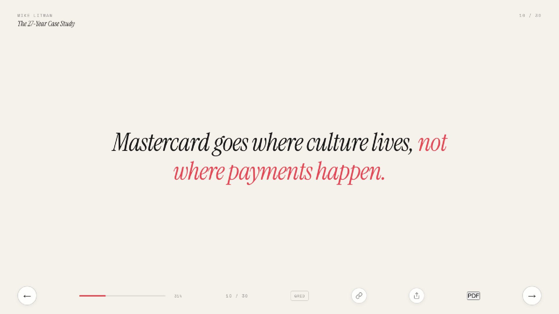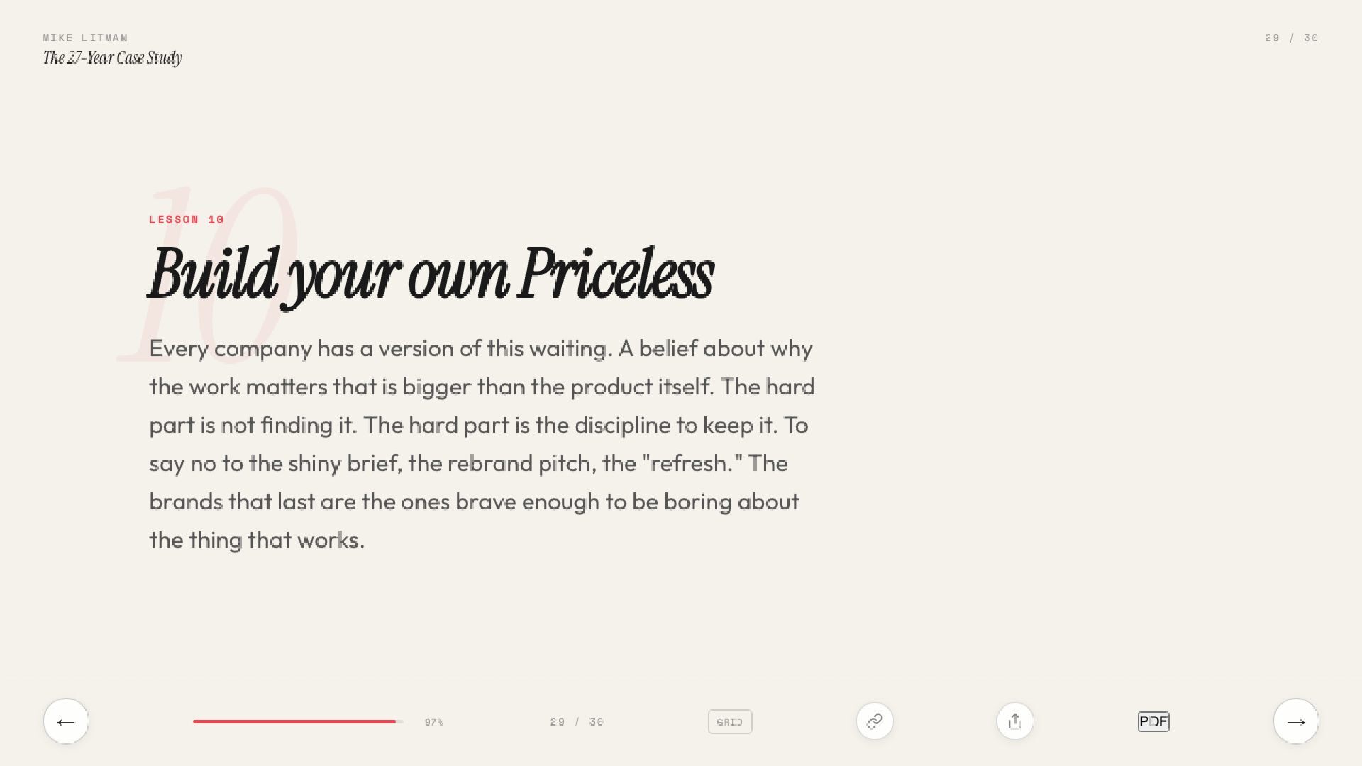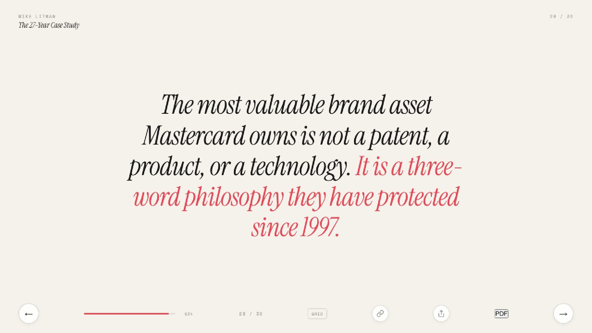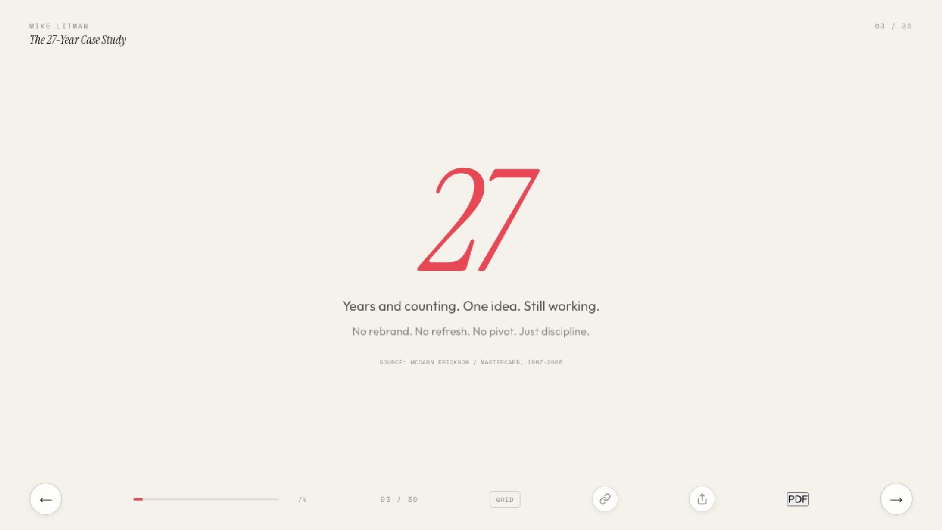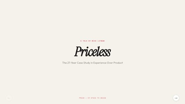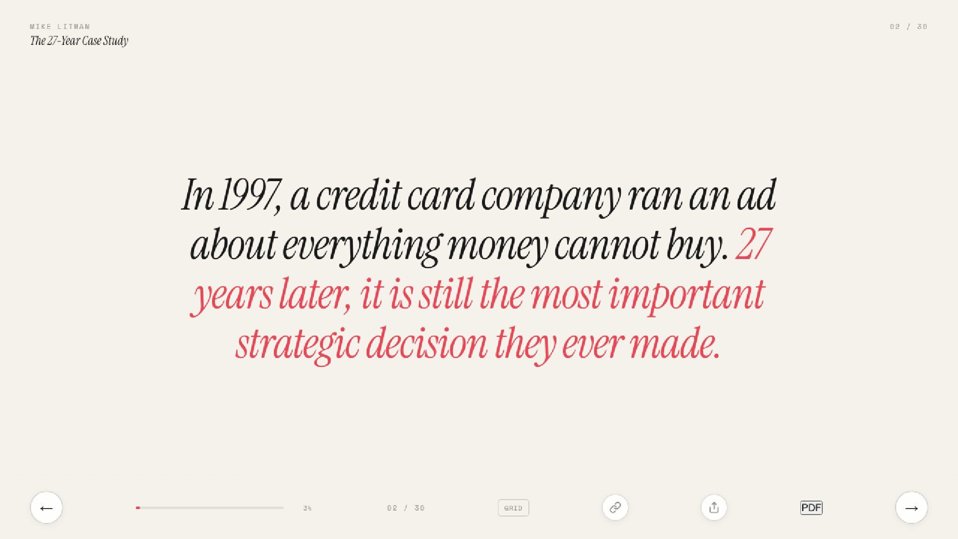 The 27-year case study in experience over product. 28 slides on why Mastercard's Priceless campaign is the longest-running proof that emotional value outlasts transactional value.