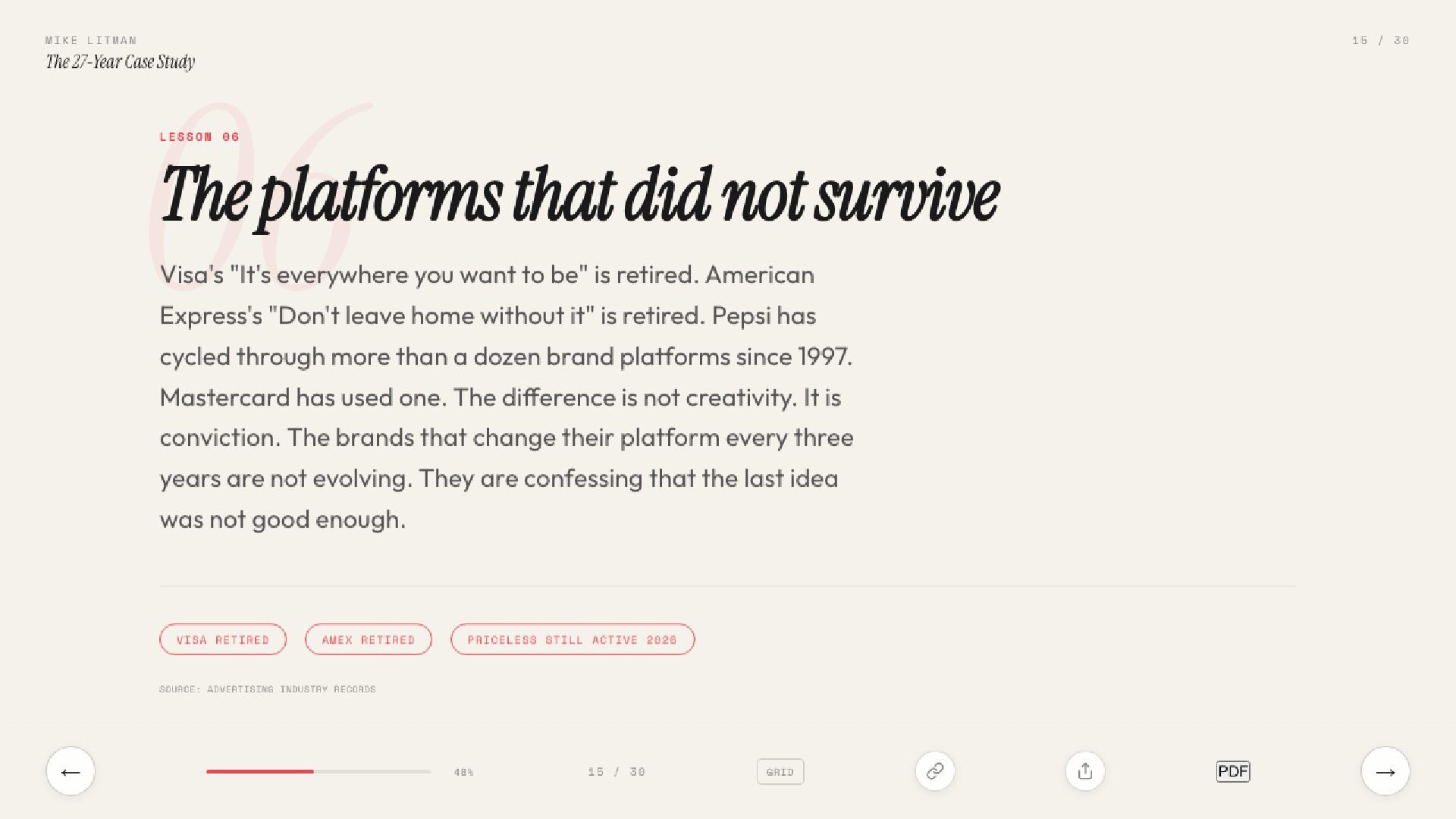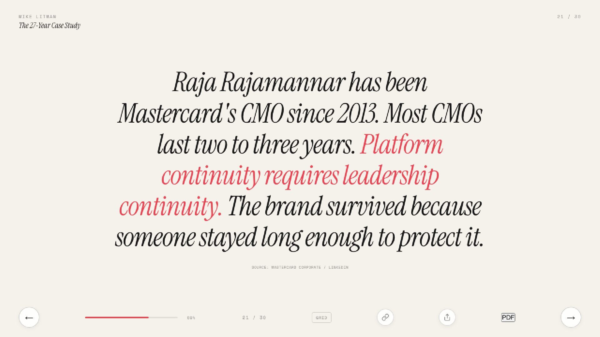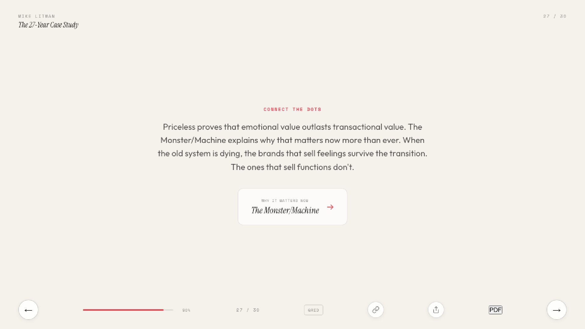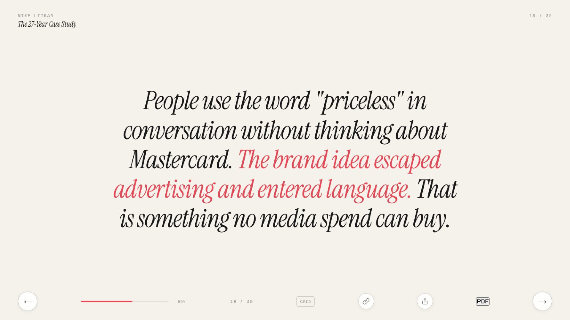 The 27-year case study in experience over product. 28 slides on why Mastercard's Priceless campaign is the longest-running proof that emotional value outlasts transactional value.