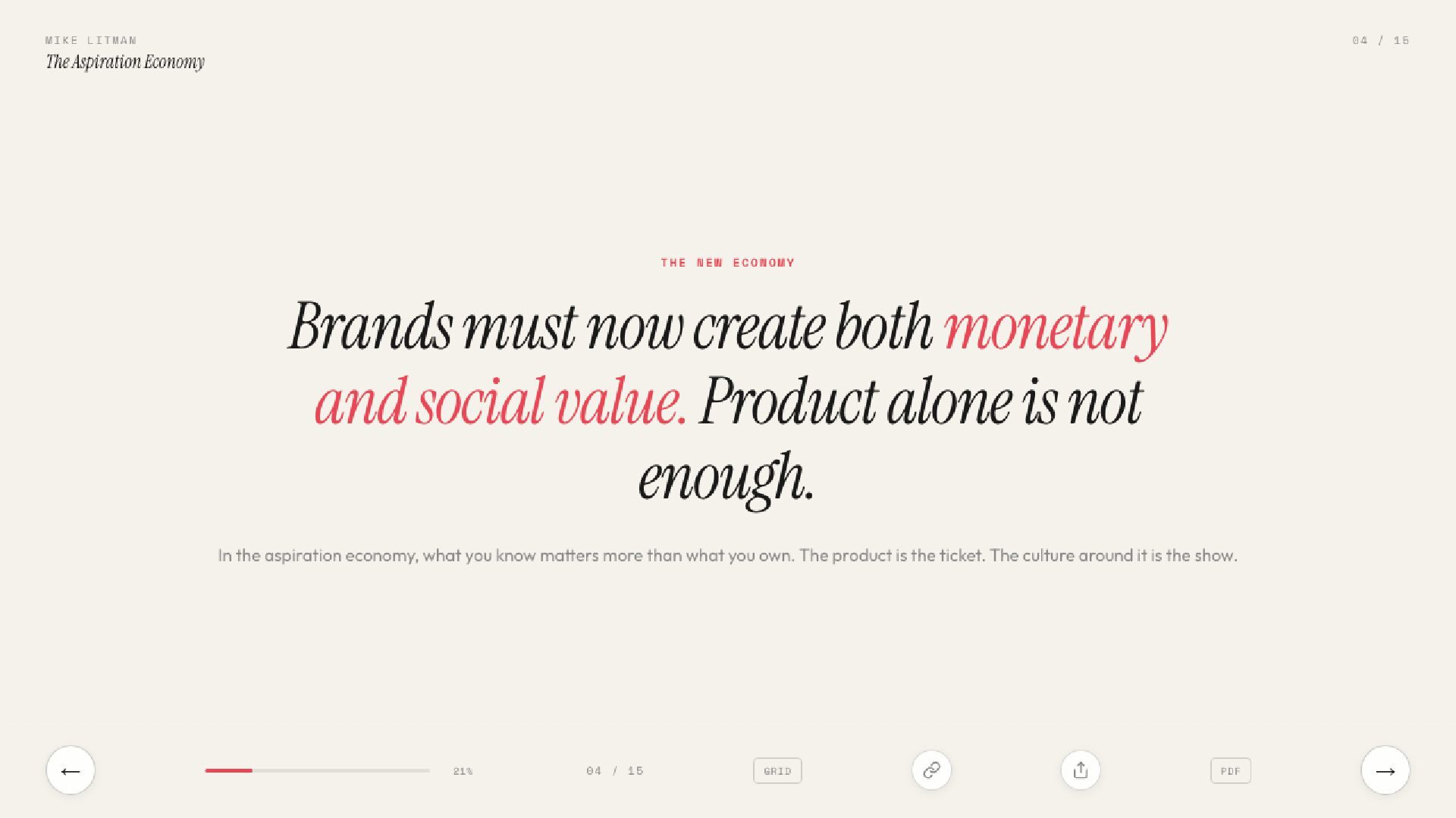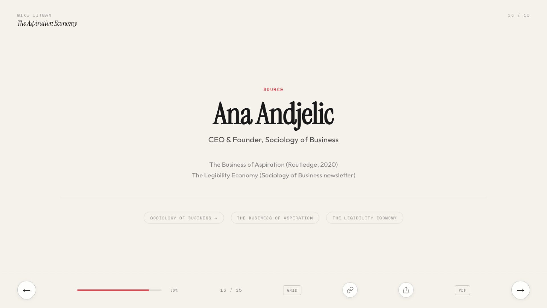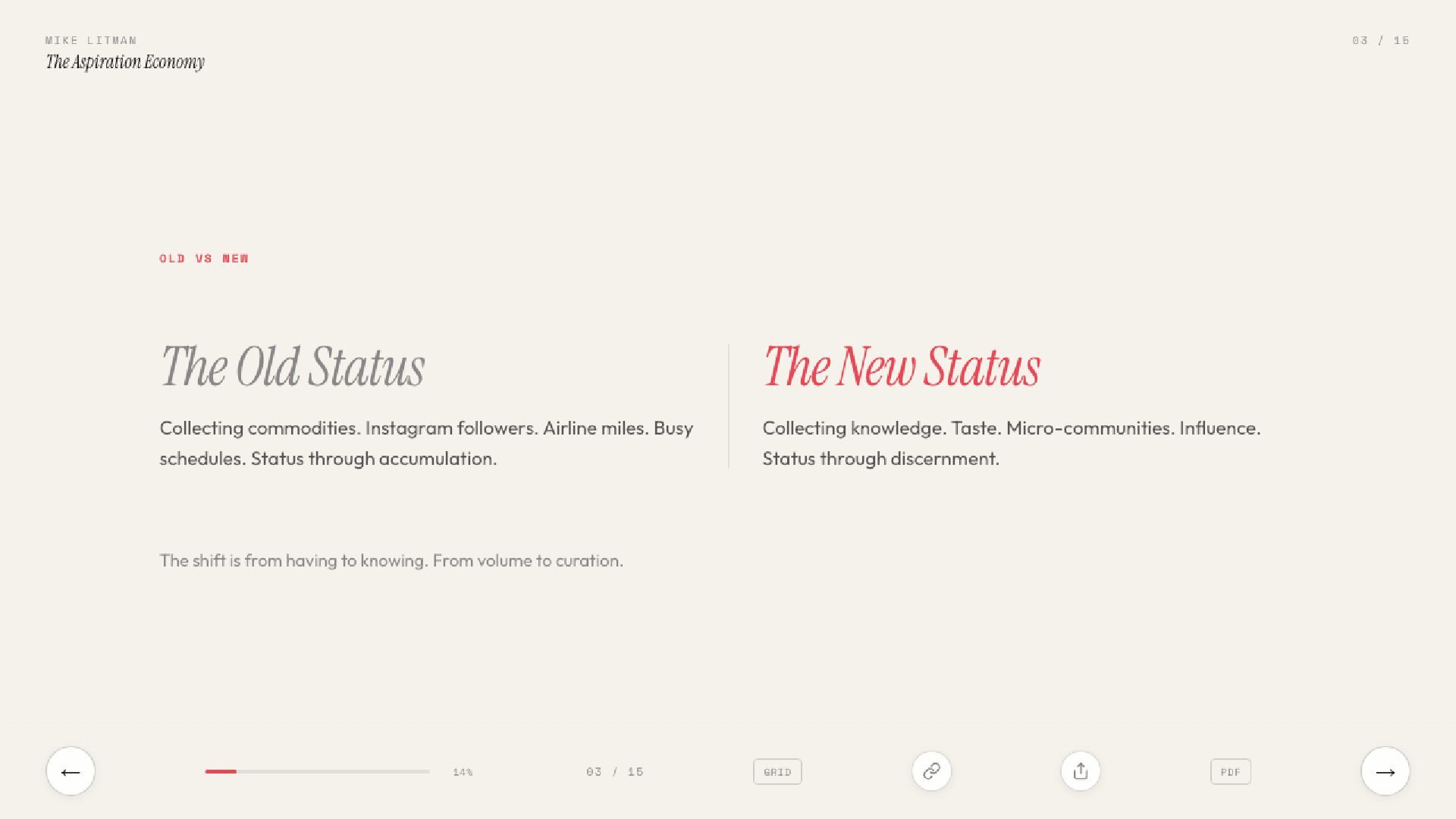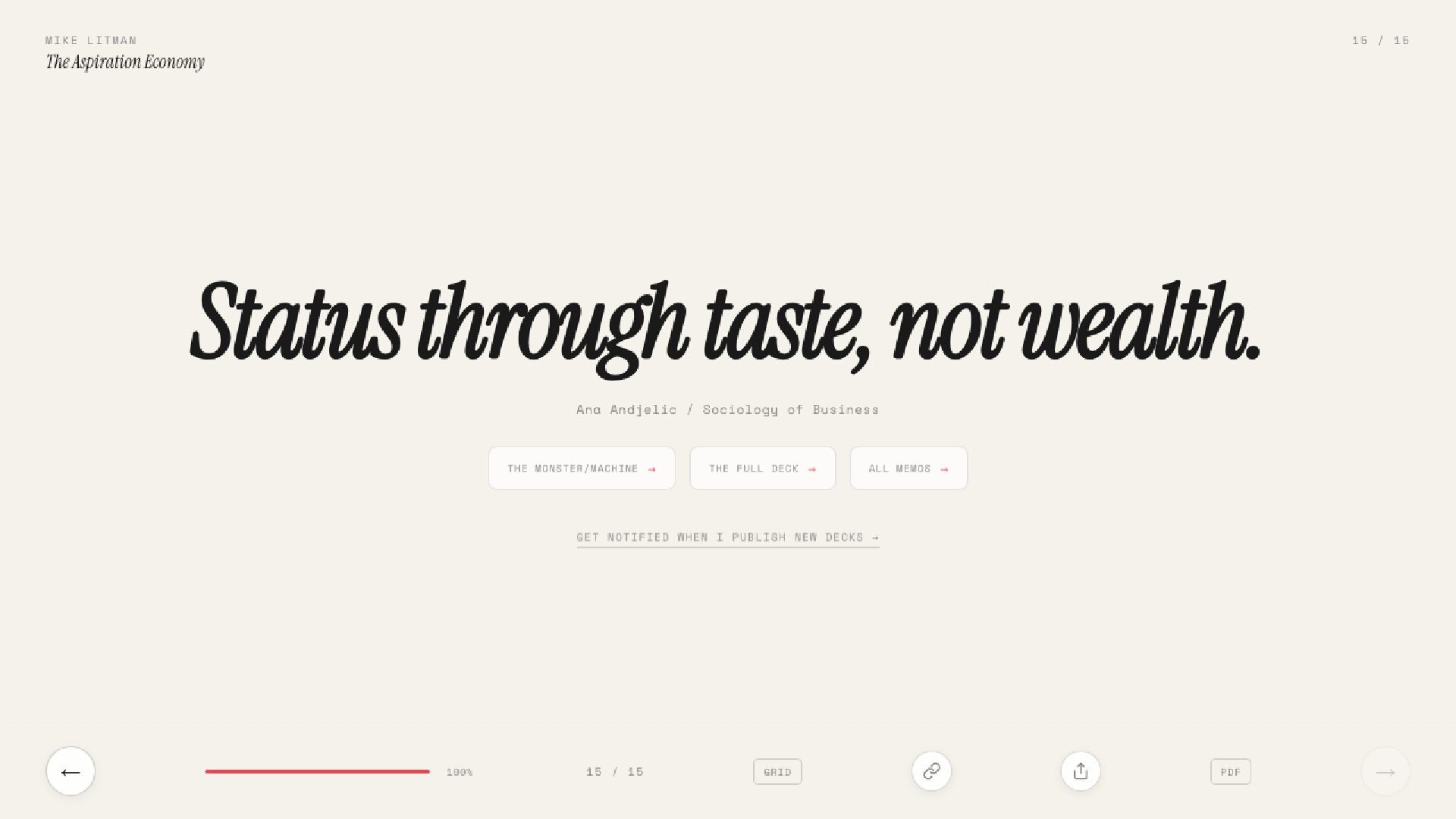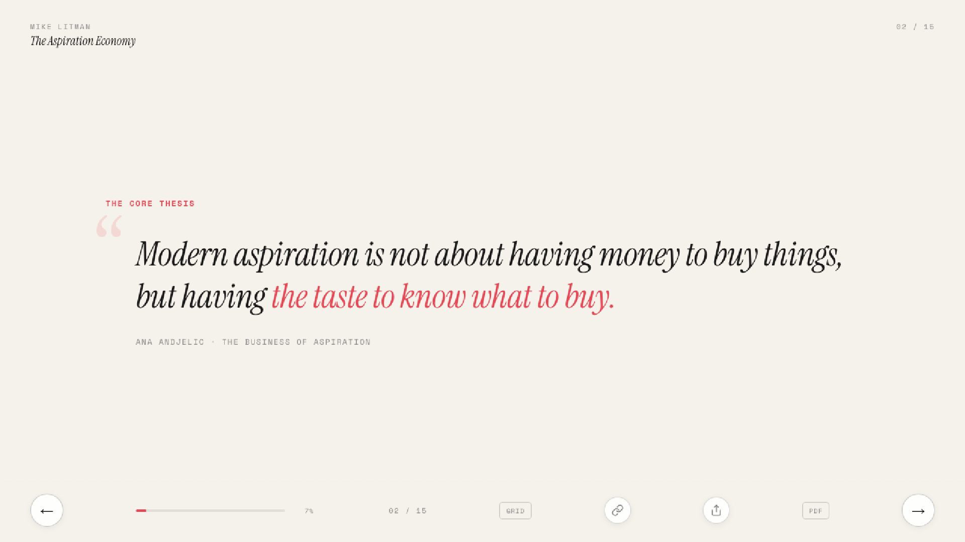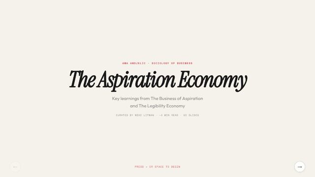 Key learnings from Ana Andjelic's The Business of Aspiration. Modern aspiration is not about having money to buy things, but having the taste to know what to buy.