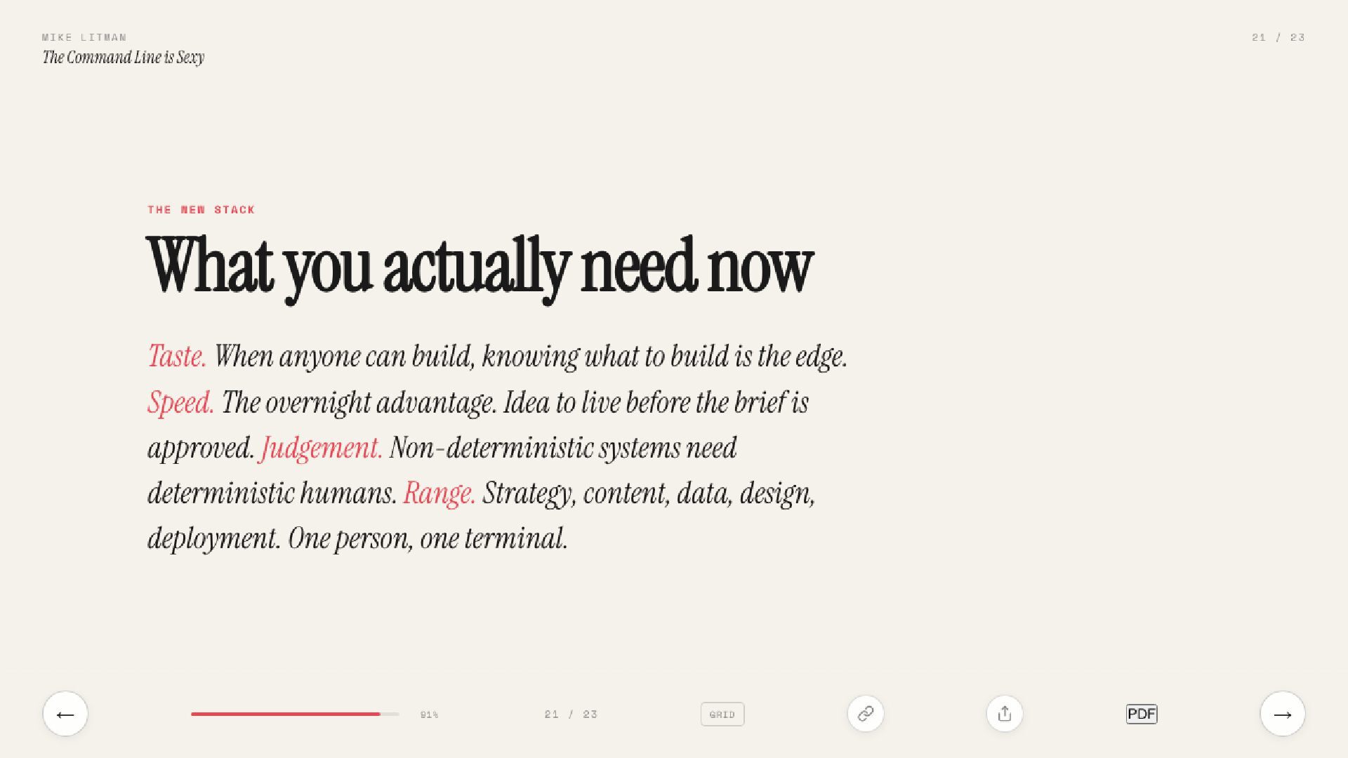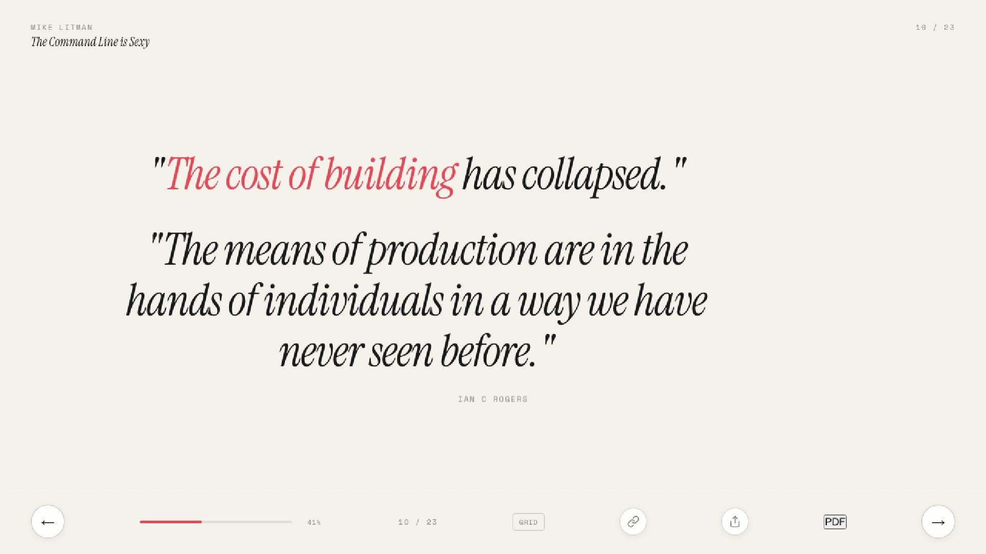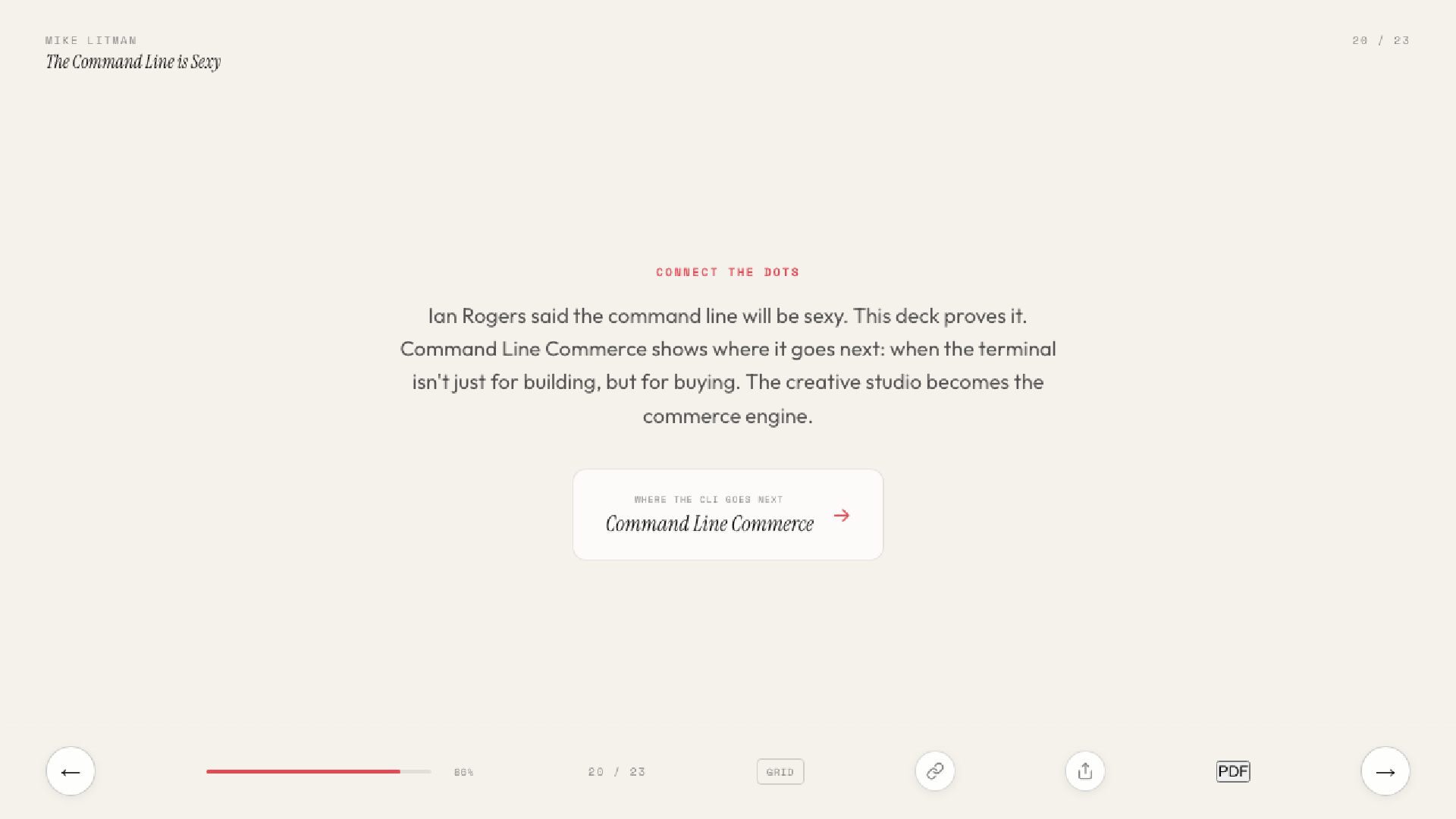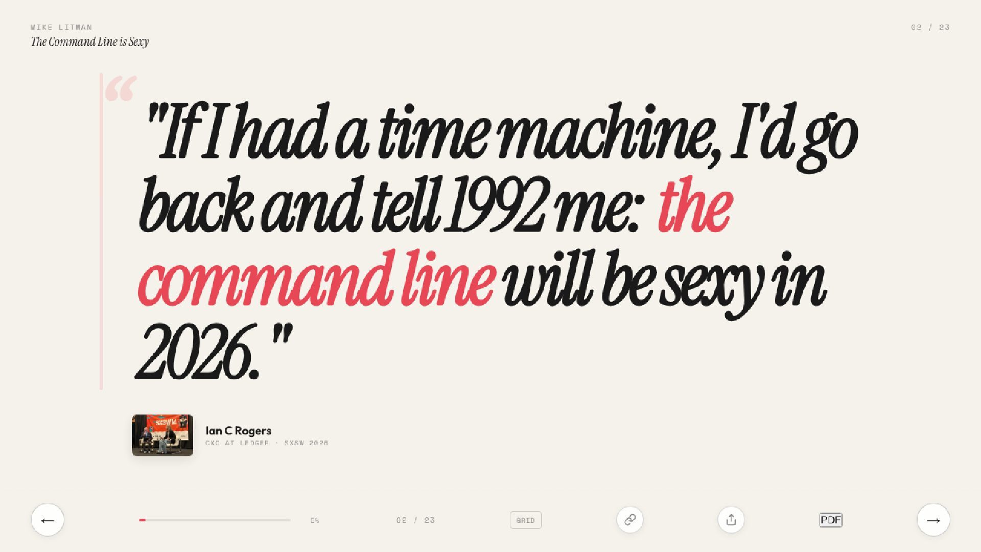 Ian C Rogers told SXSW 2026 the command line will be sexy. This deck is the proof. 21 slides on why the terminal is the new creative studio.