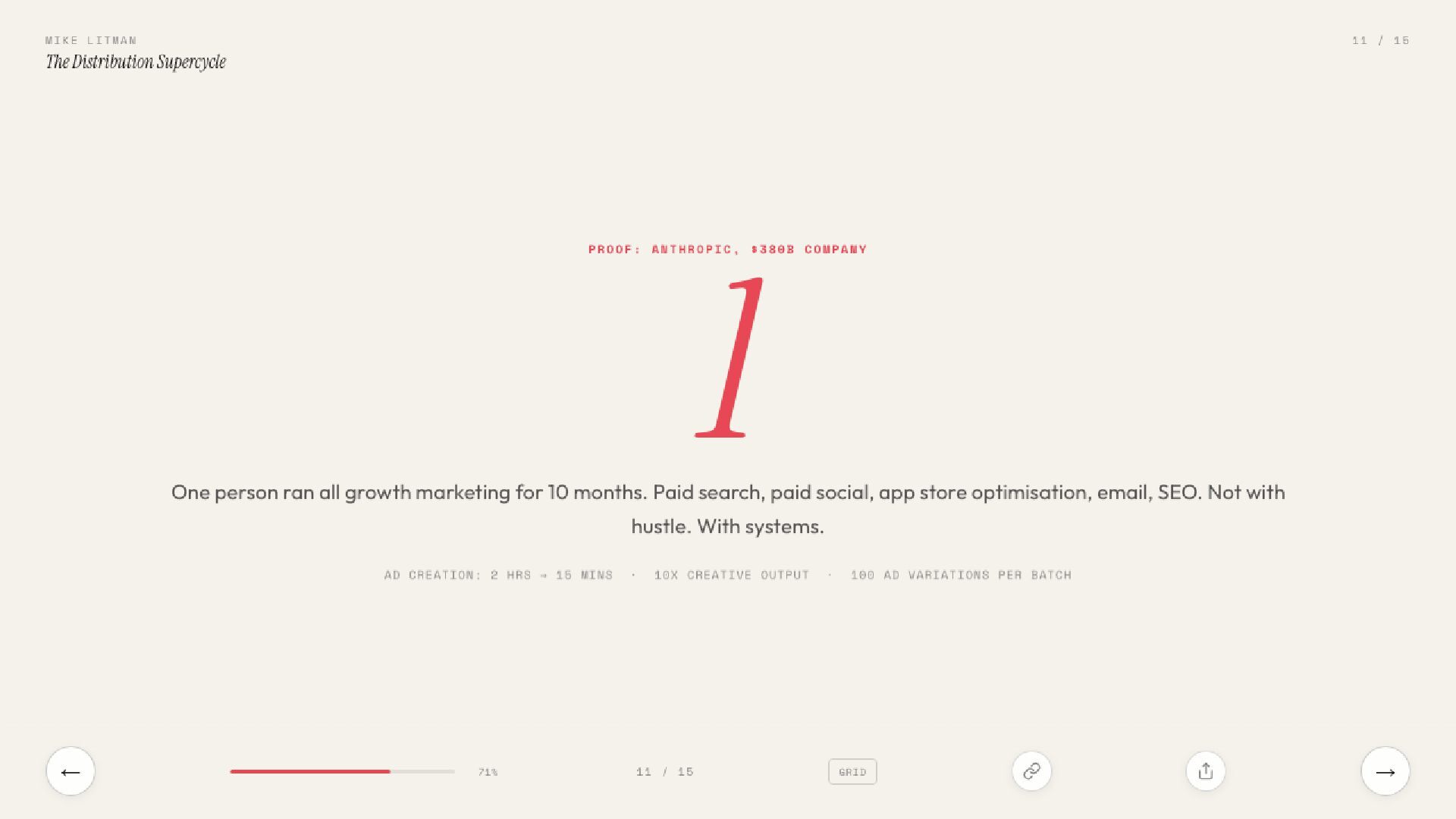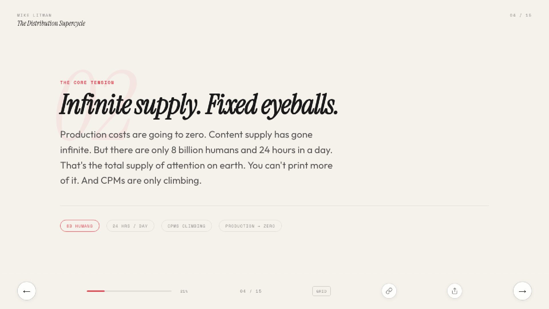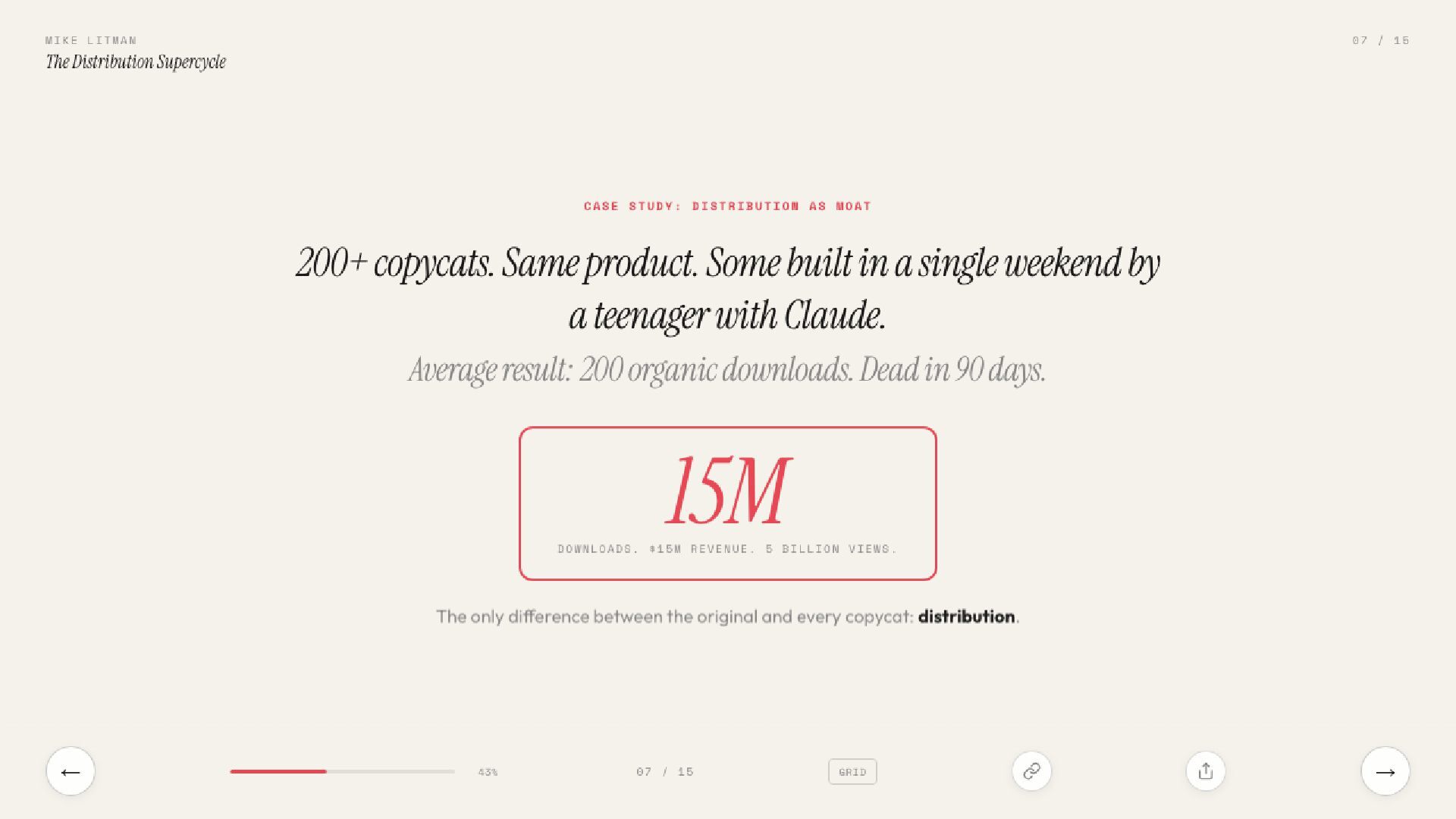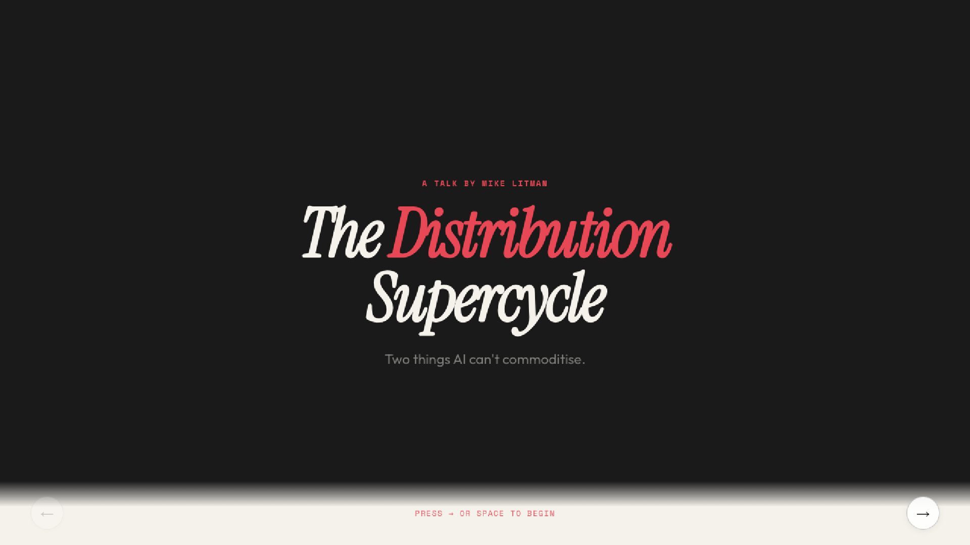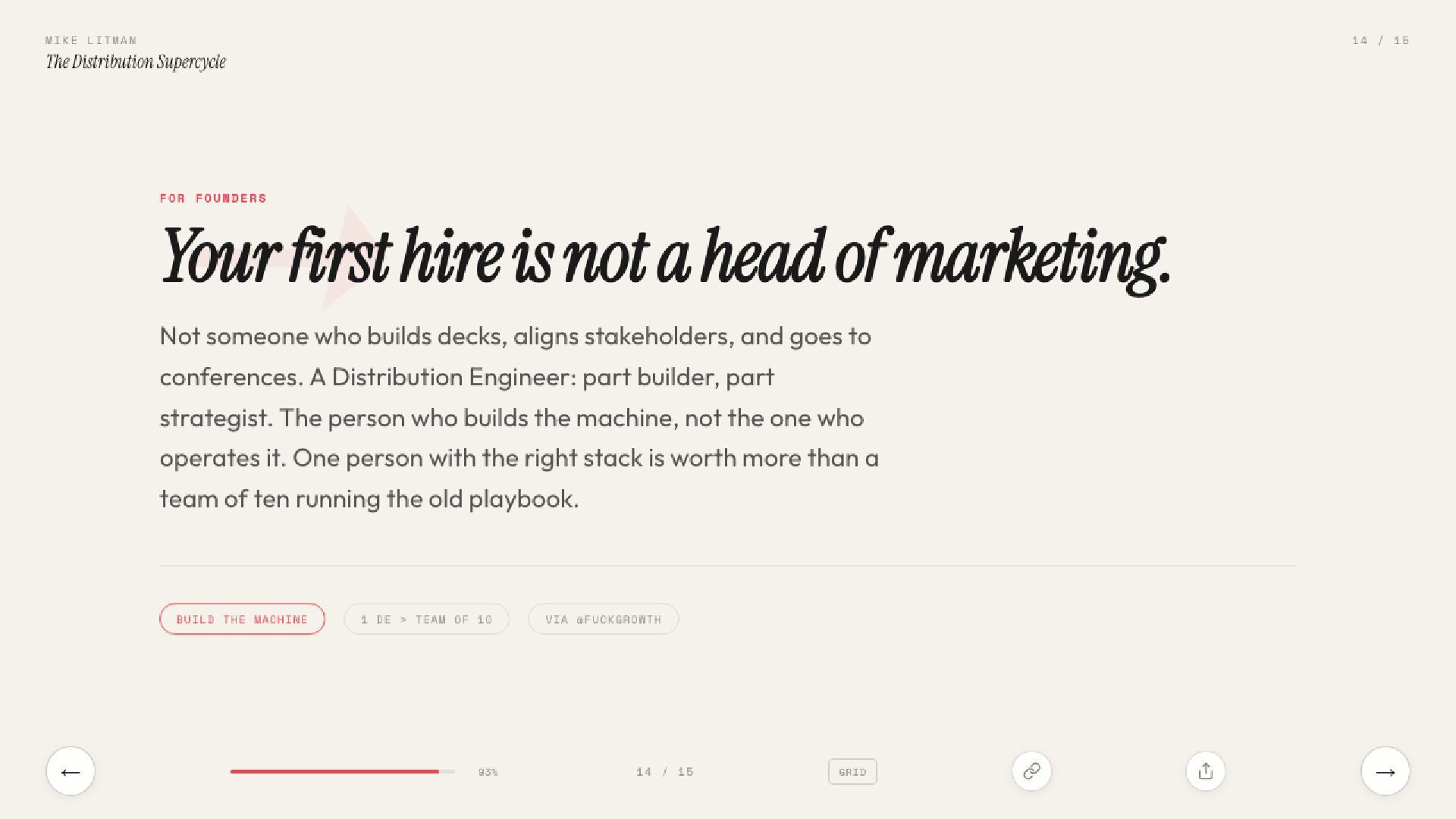 15 slides on the distribution supercycle: why production costs are going to zero, why CPMs keep climbing, and why the Distribution Engineer — part builder, part strategist — is the most valuable hire of 2026. Includes the Anthropic one-person proof, the four-levels framework, and a direct prescription for founders.
