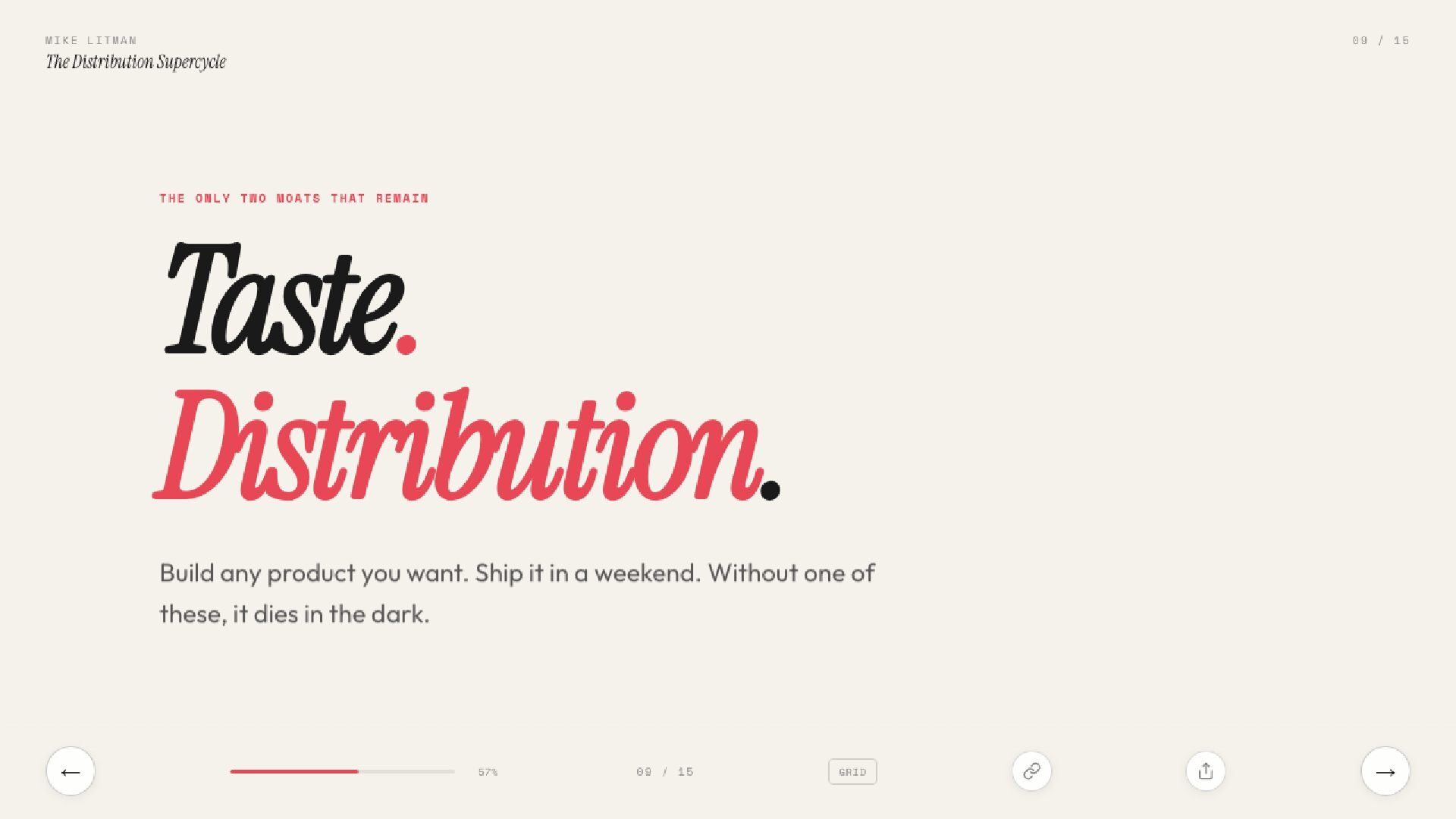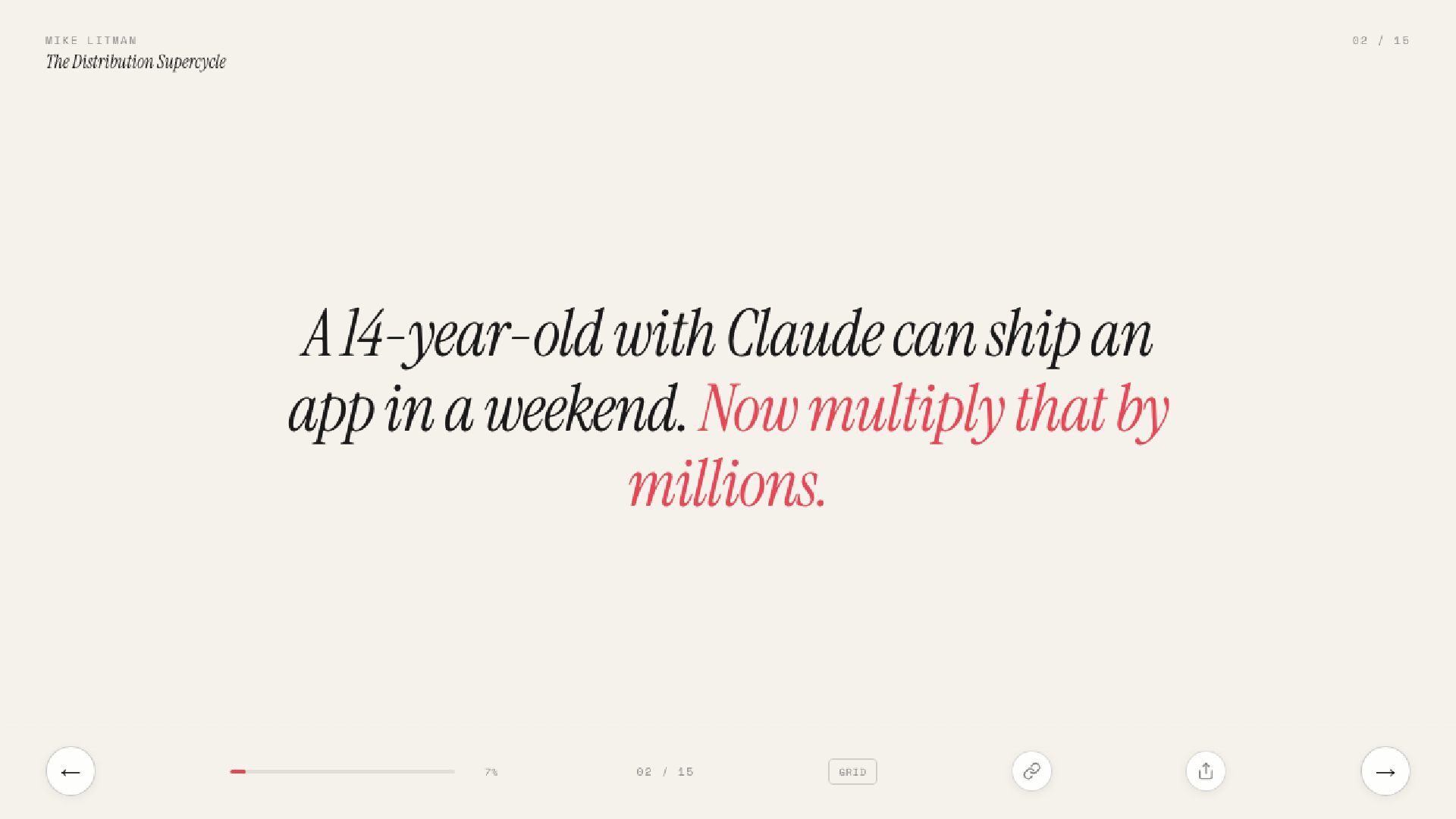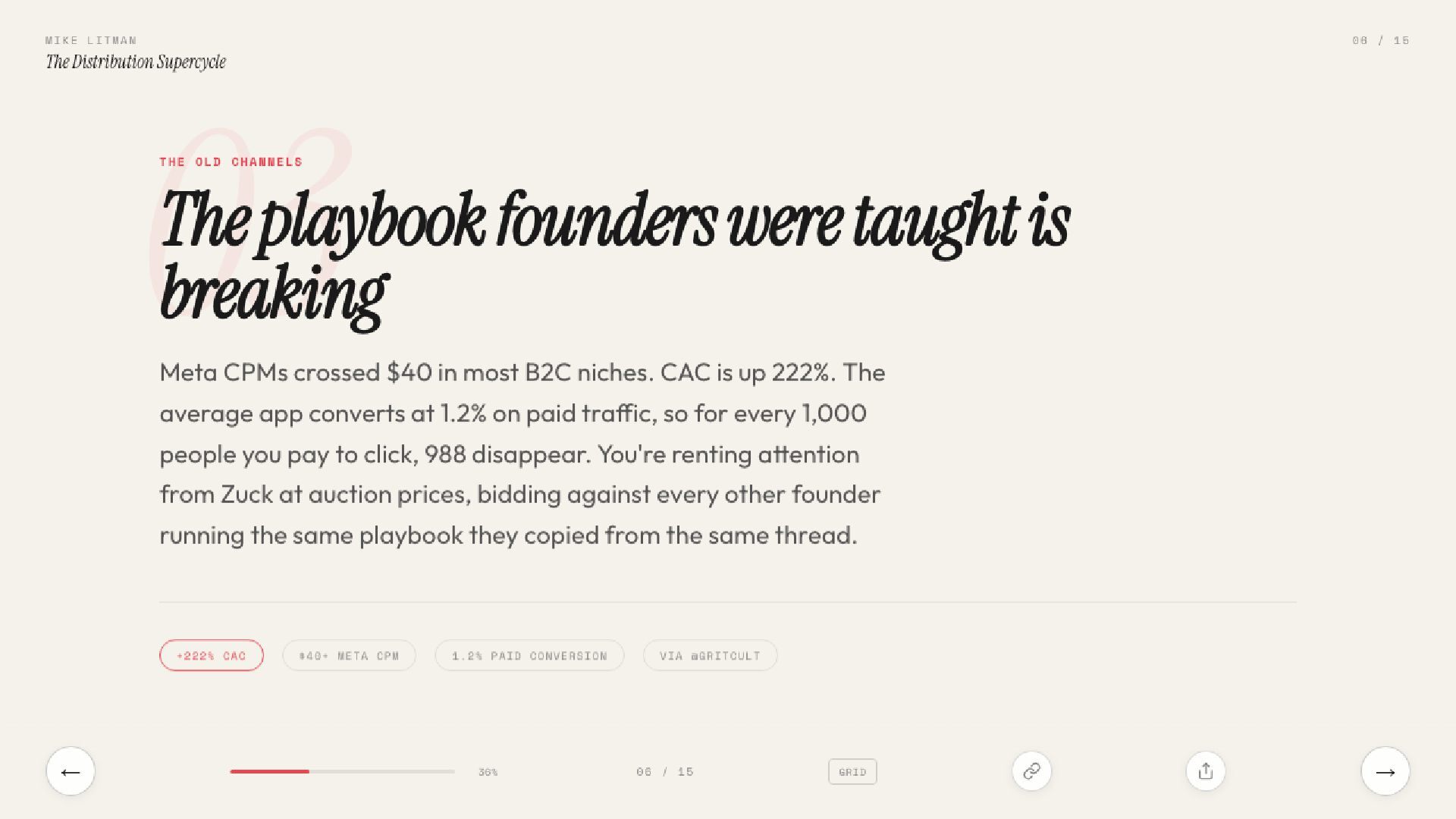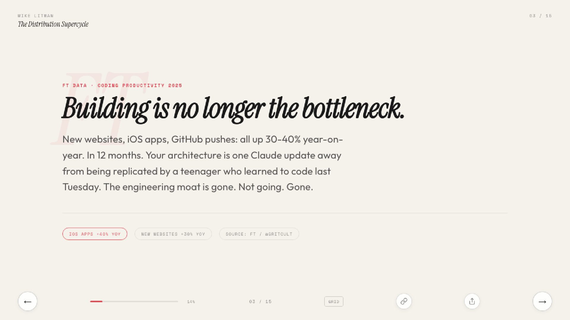 15 slides on the distribution supercycle: why production costs are going to zero, why CPMs keep climbing, and why the Distribution Engineer — part builder, part strategist — is the most valuable hire of 2026. Includes the Anthropic one-person proof, the four-levels framework, and a direct prescription for founders.