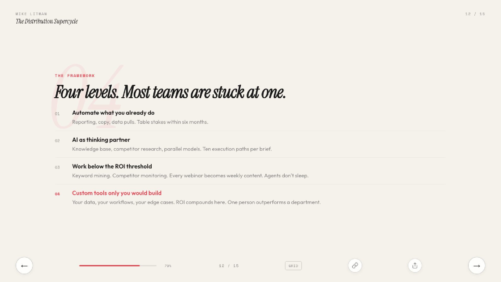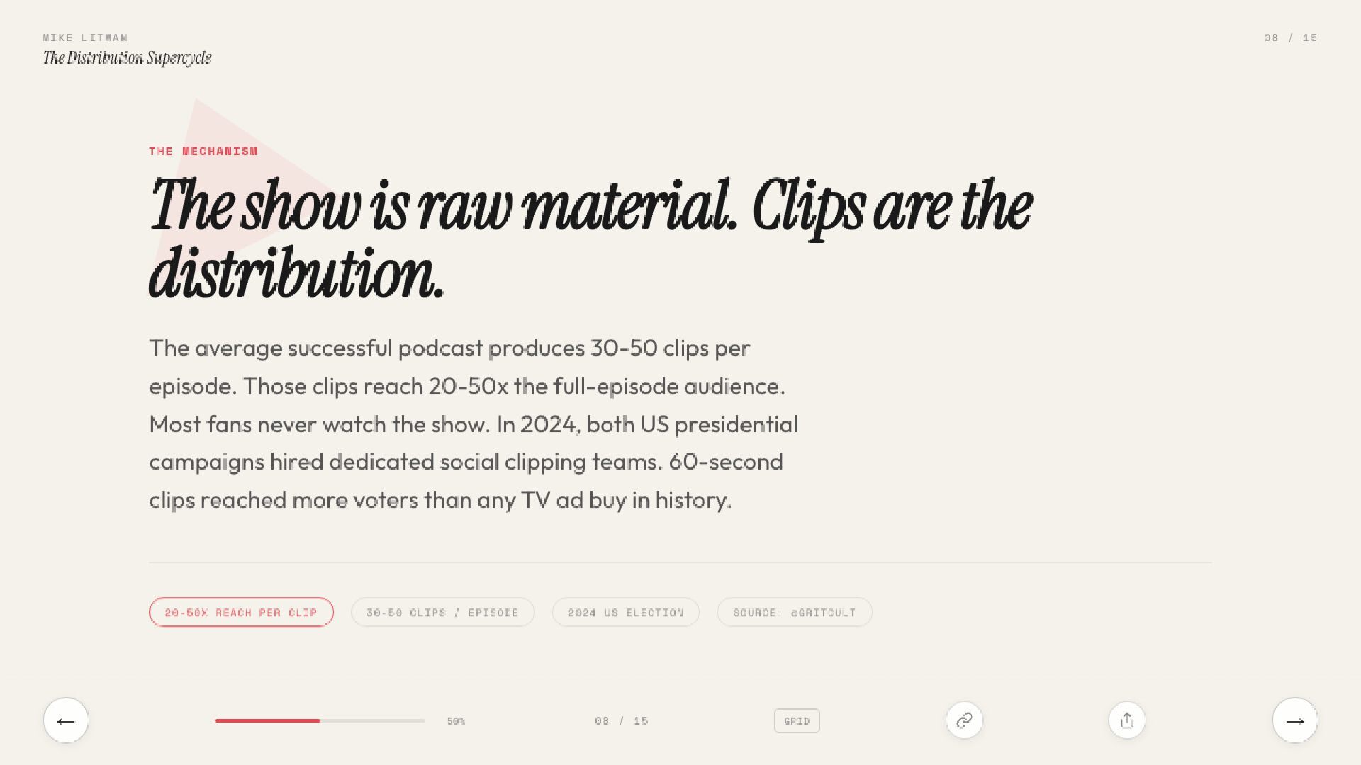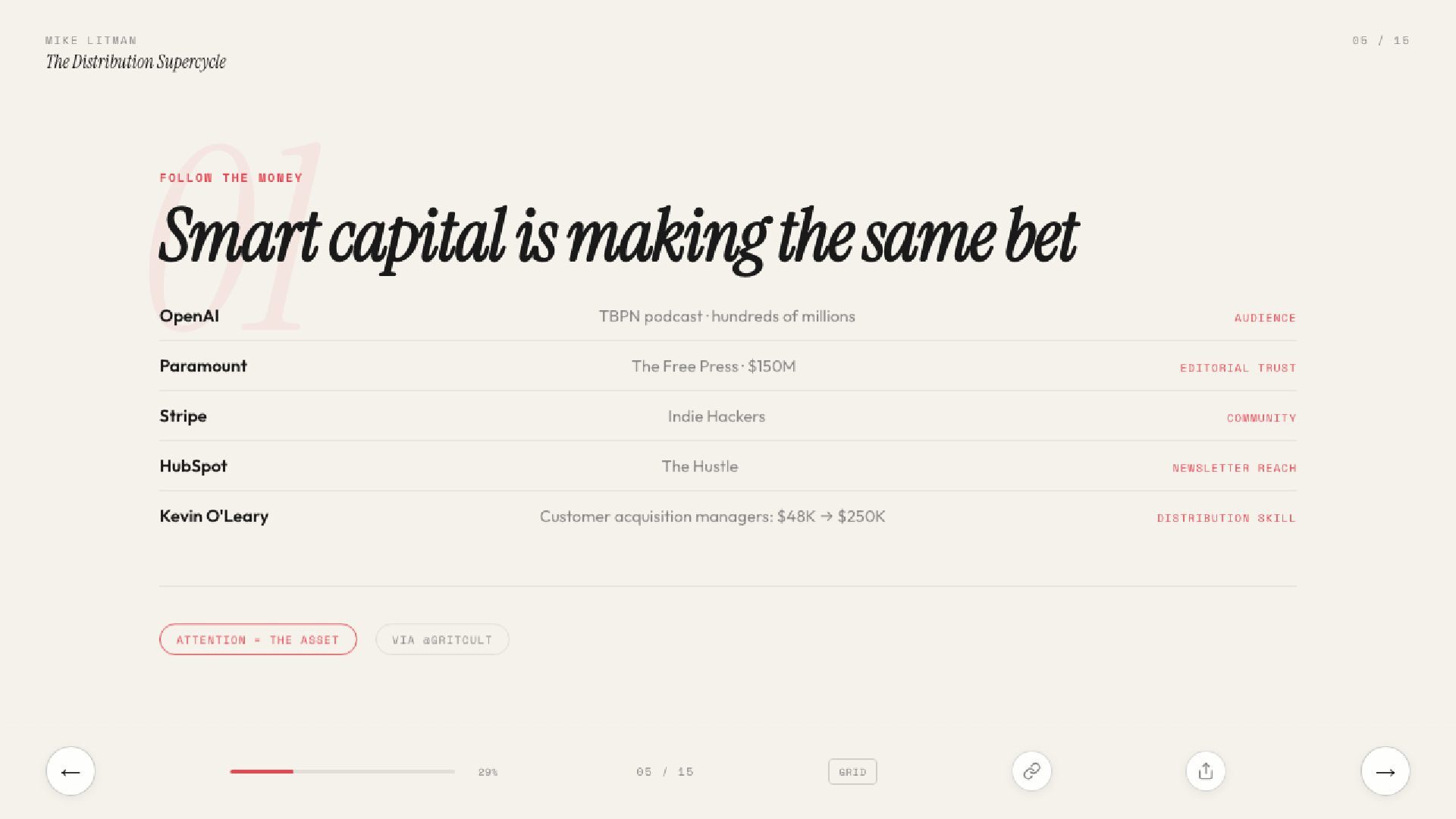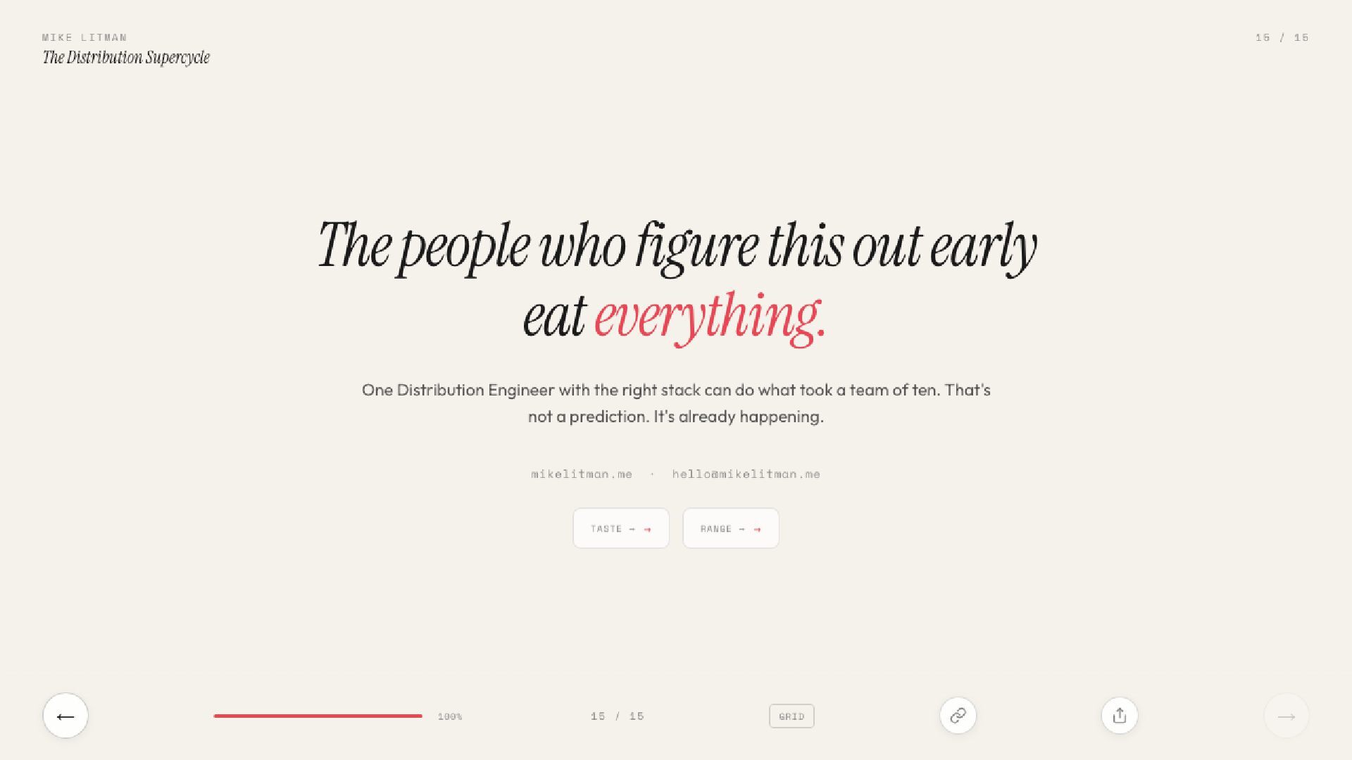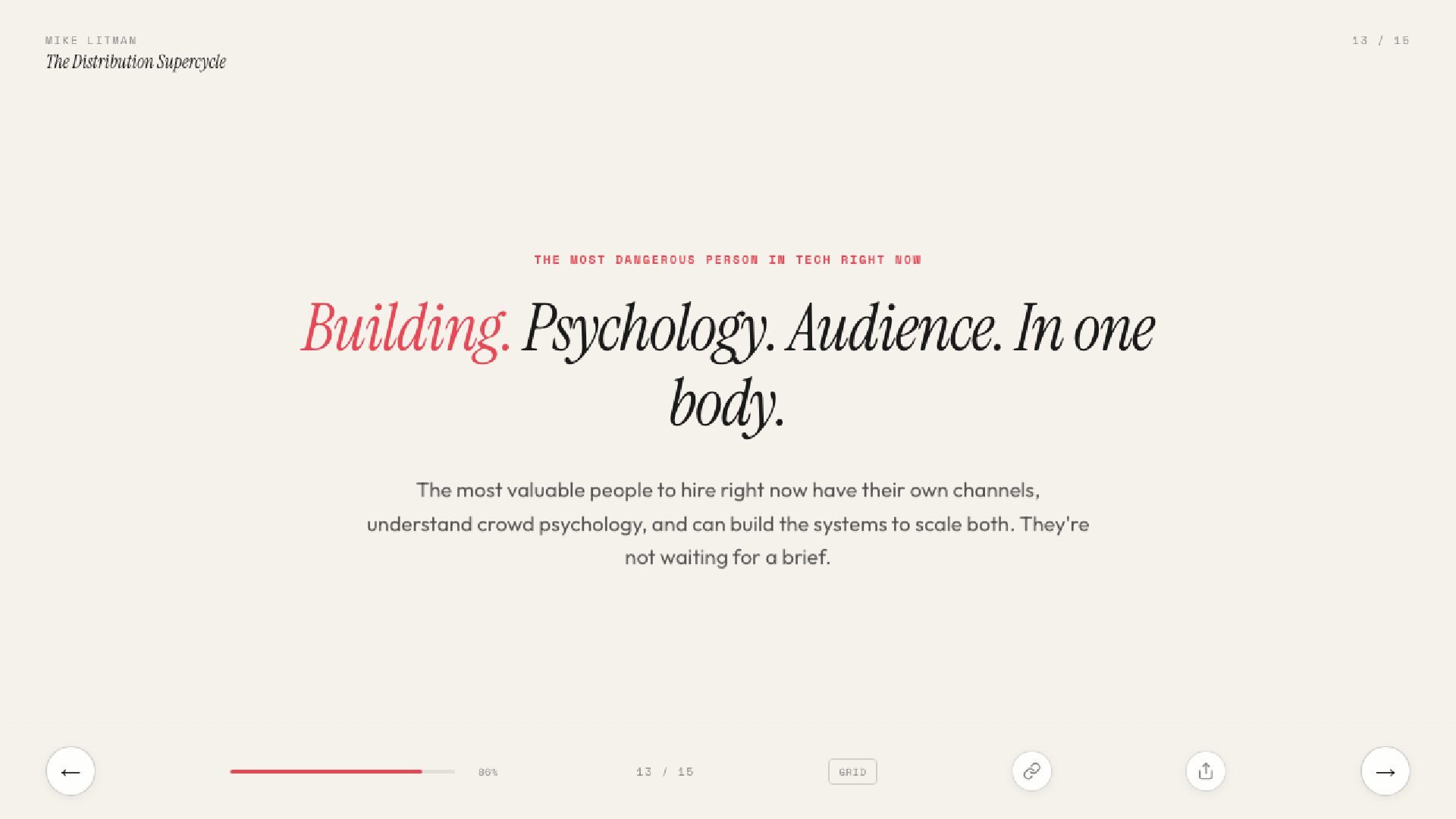 15 slides on the distribution supercycle: why production costs are going to zero, why CPMs keep climbing, and why the Distribution Engineer — part builder, part strategist — is the most valuable hire of 2026. Includes the Anthropic one-person proof, the four-levels framework, and a direct prescription for founders.