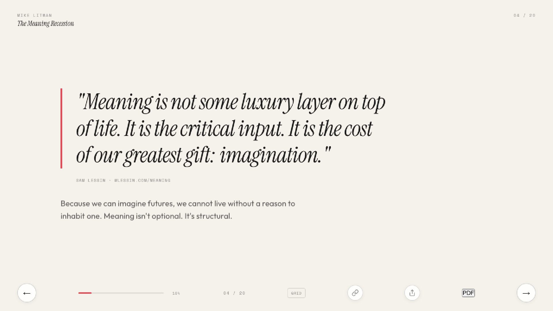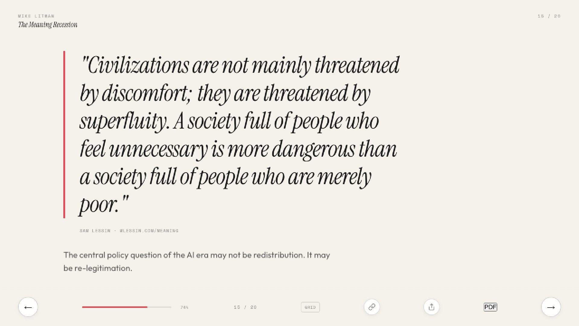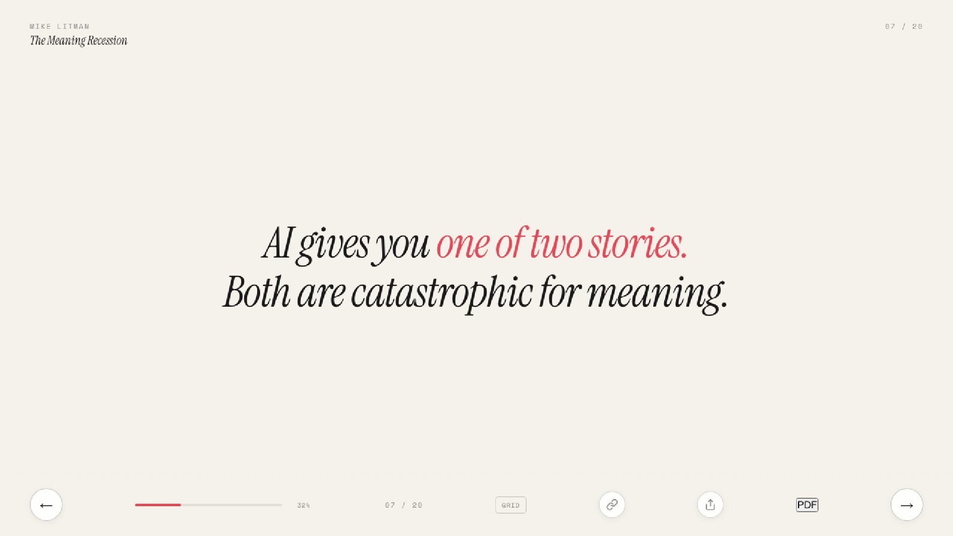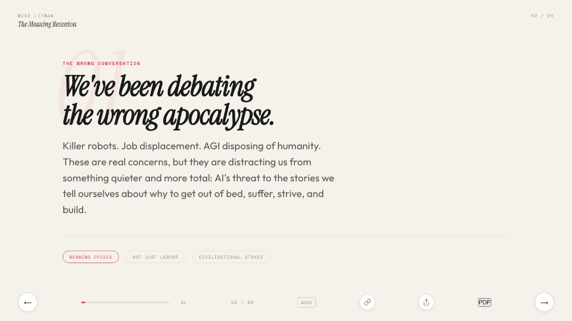The real AI crisis isn’t about jobs. It’s about why we get out of bed. Inspired by Sam Lessin’s essay on meaning, this talk argues that AI’s deepest threat is to the stories civilisations run on.
