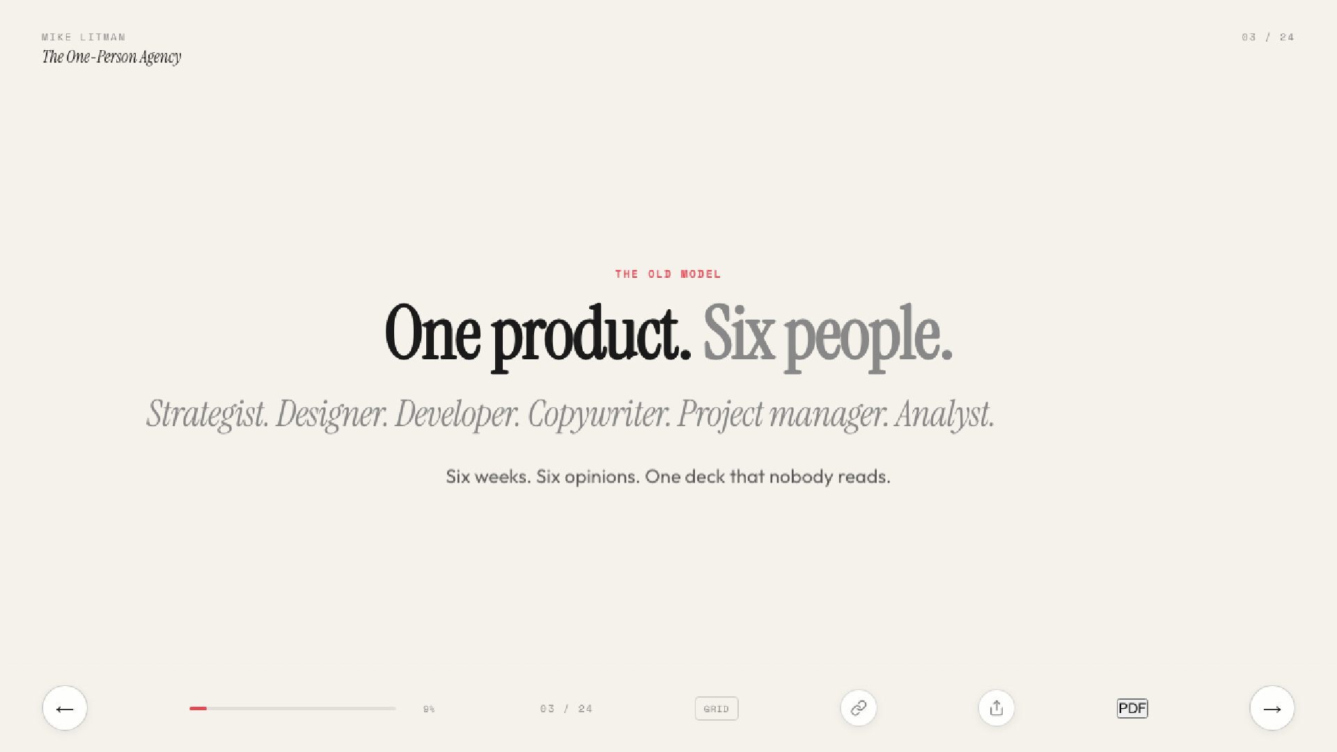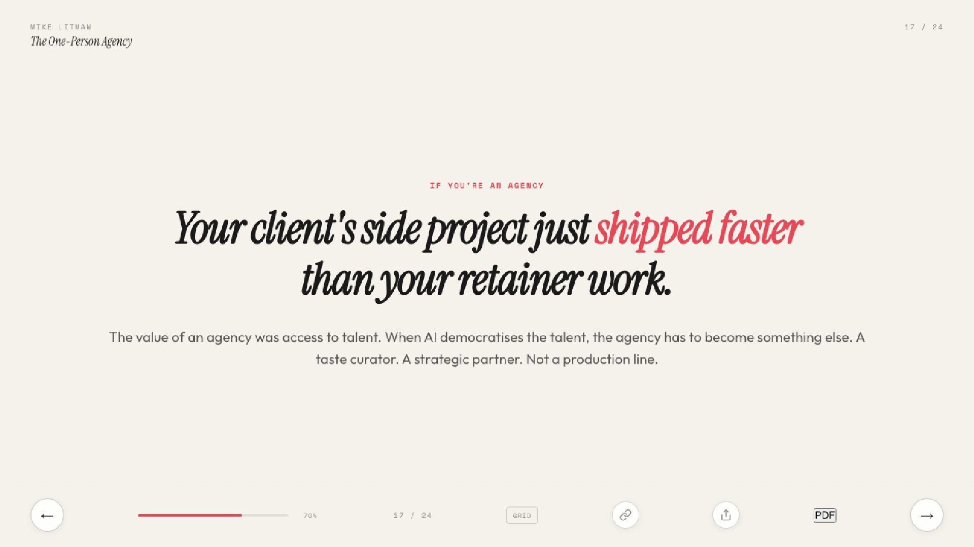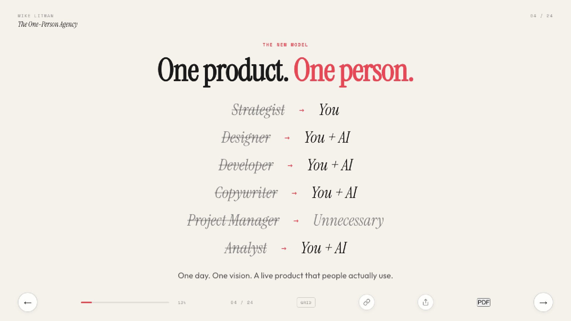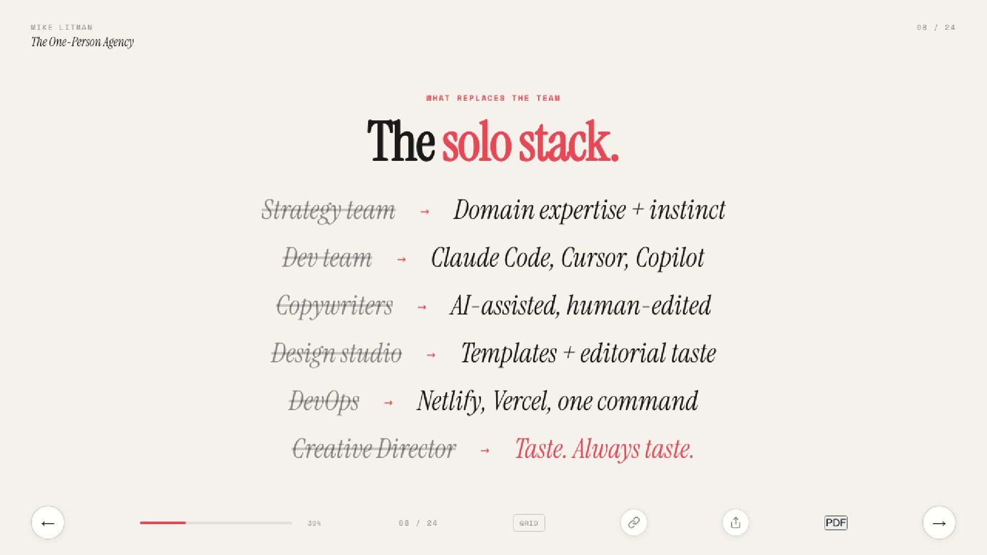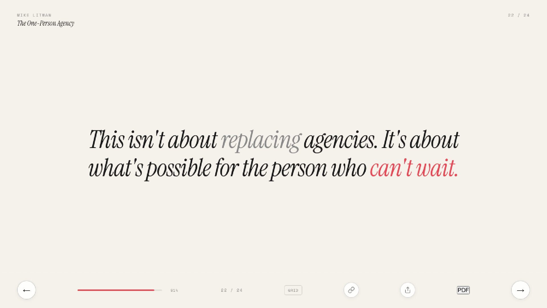 One person with AI can replace an entire agency team. 22 slides on what that means for individuals and for agencies.