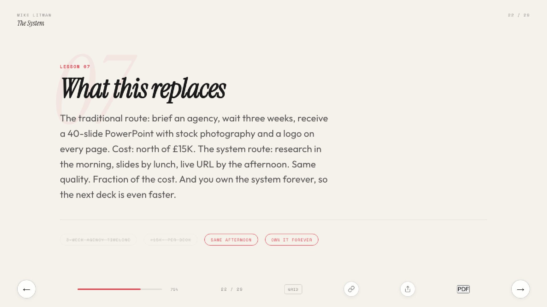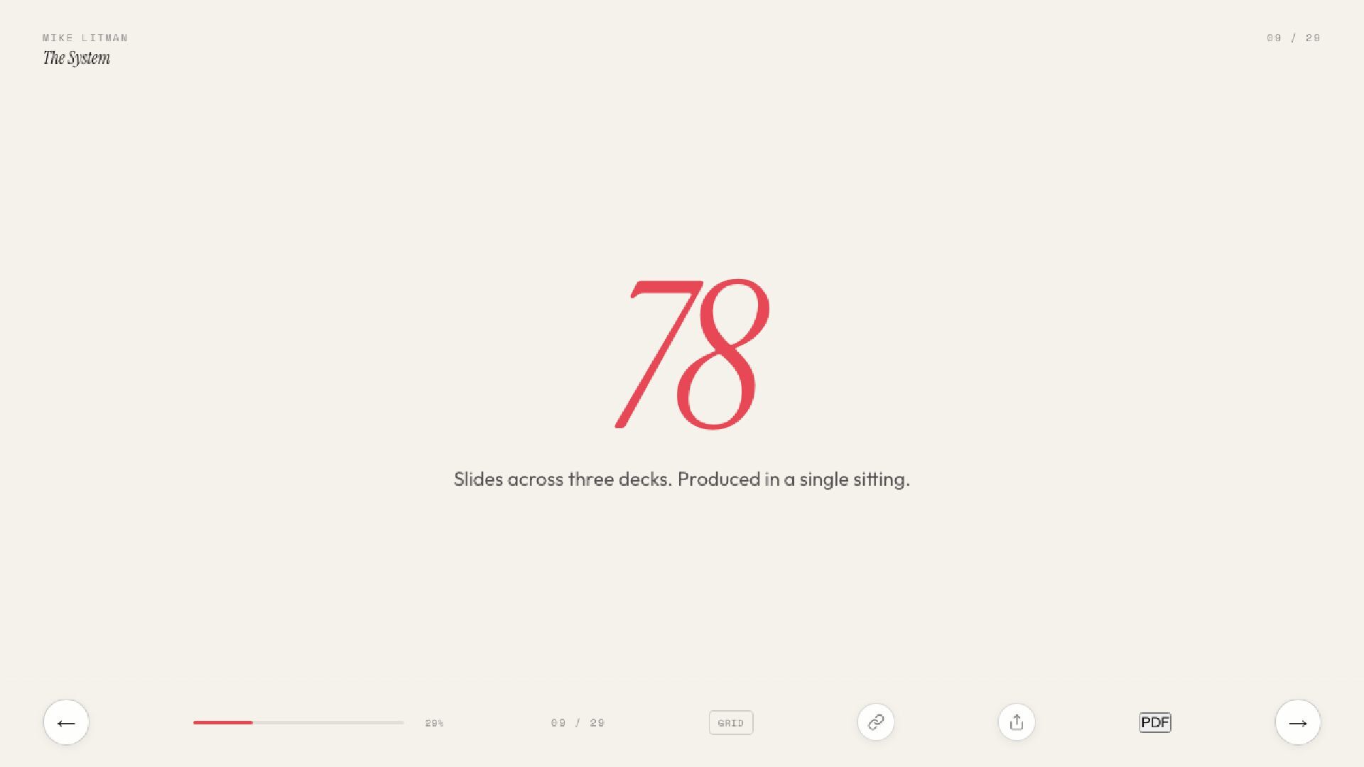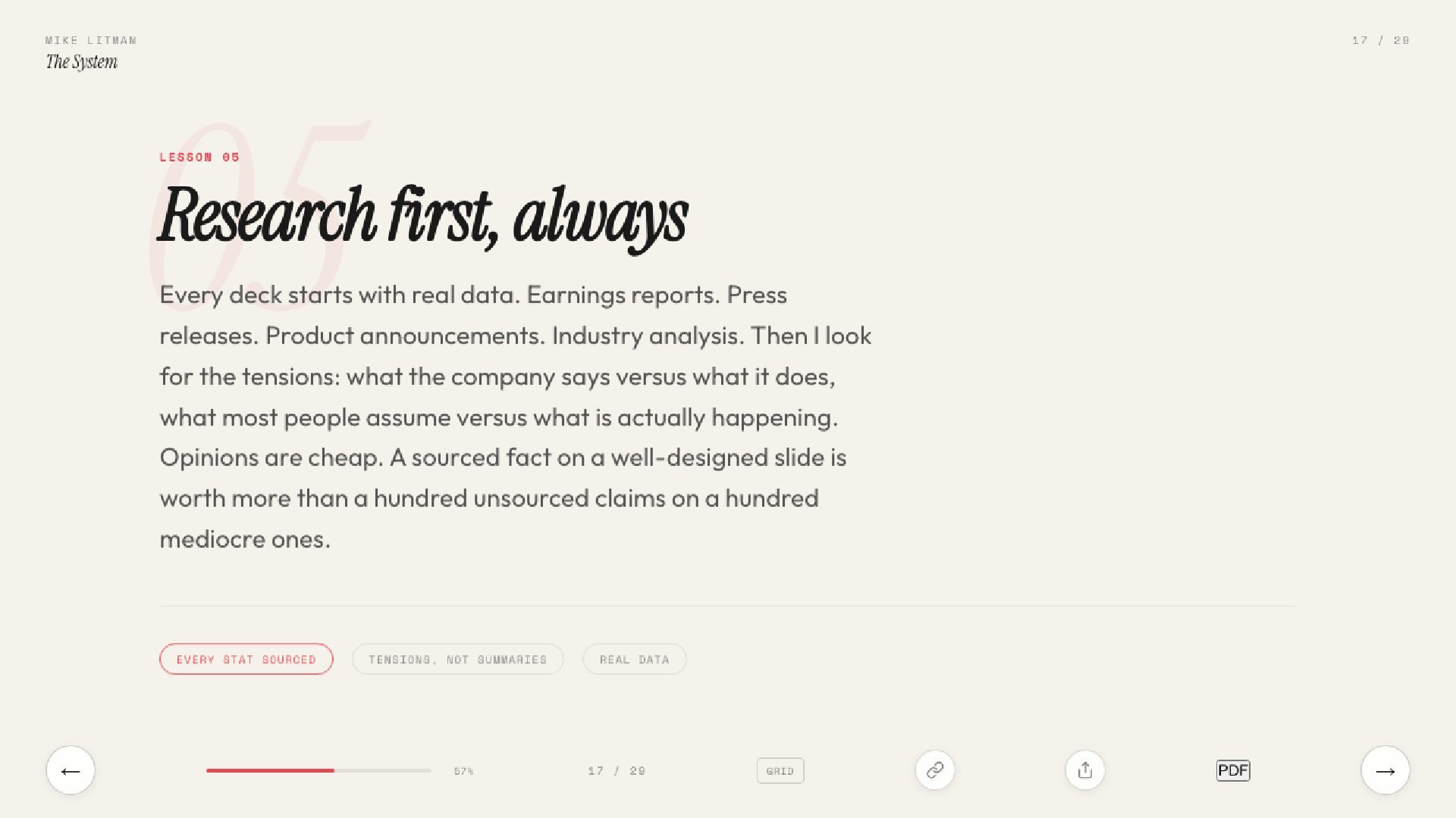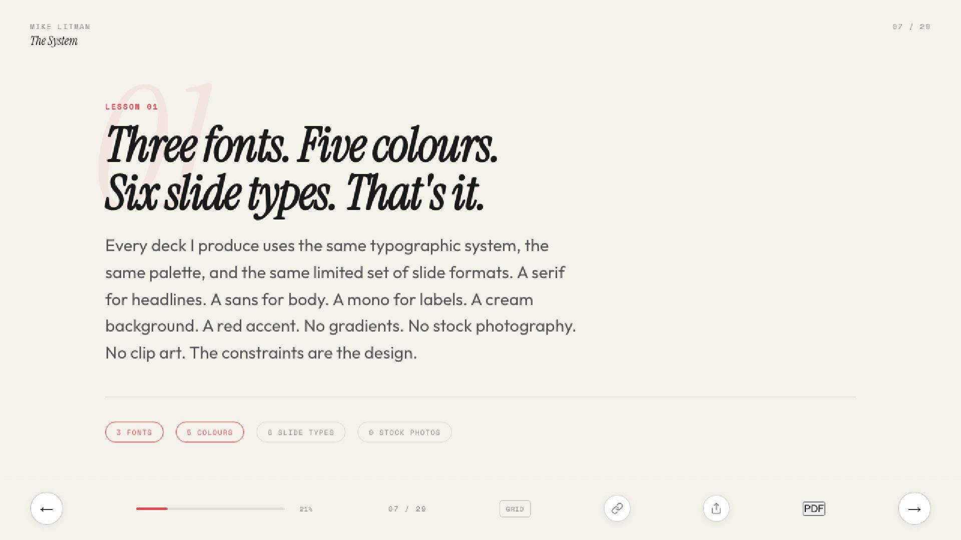 How I produce editorial-quality decks at speed. Three fonts, five colours, six slide types, and a system that makes every decision before I start. 24 slides on the method behind the output.
