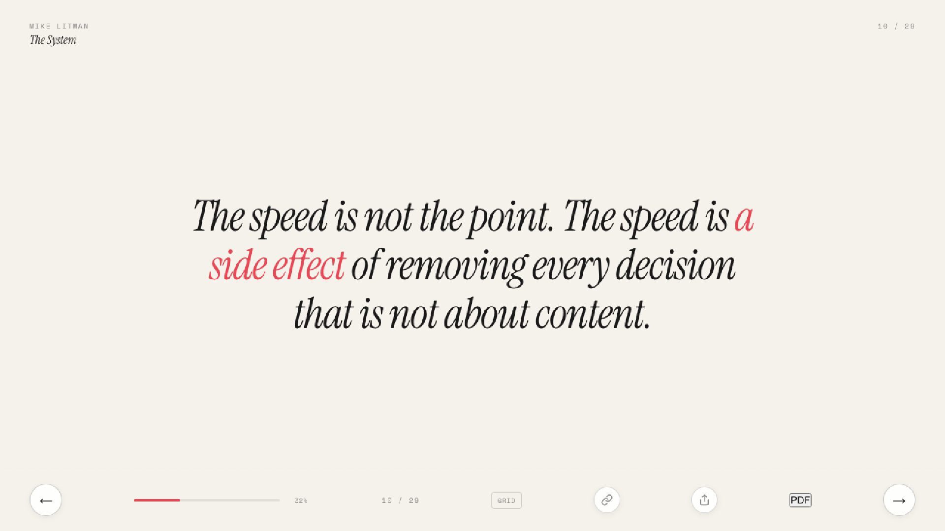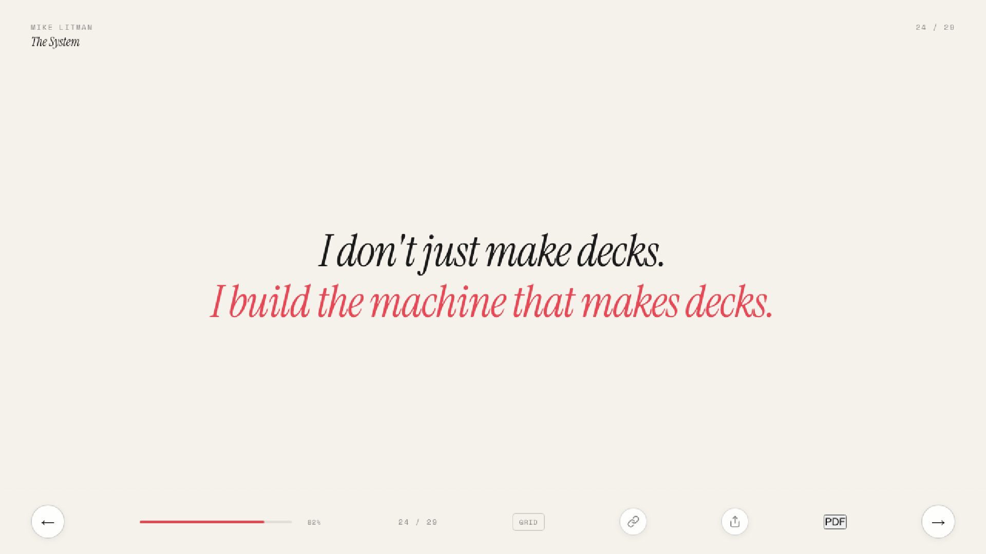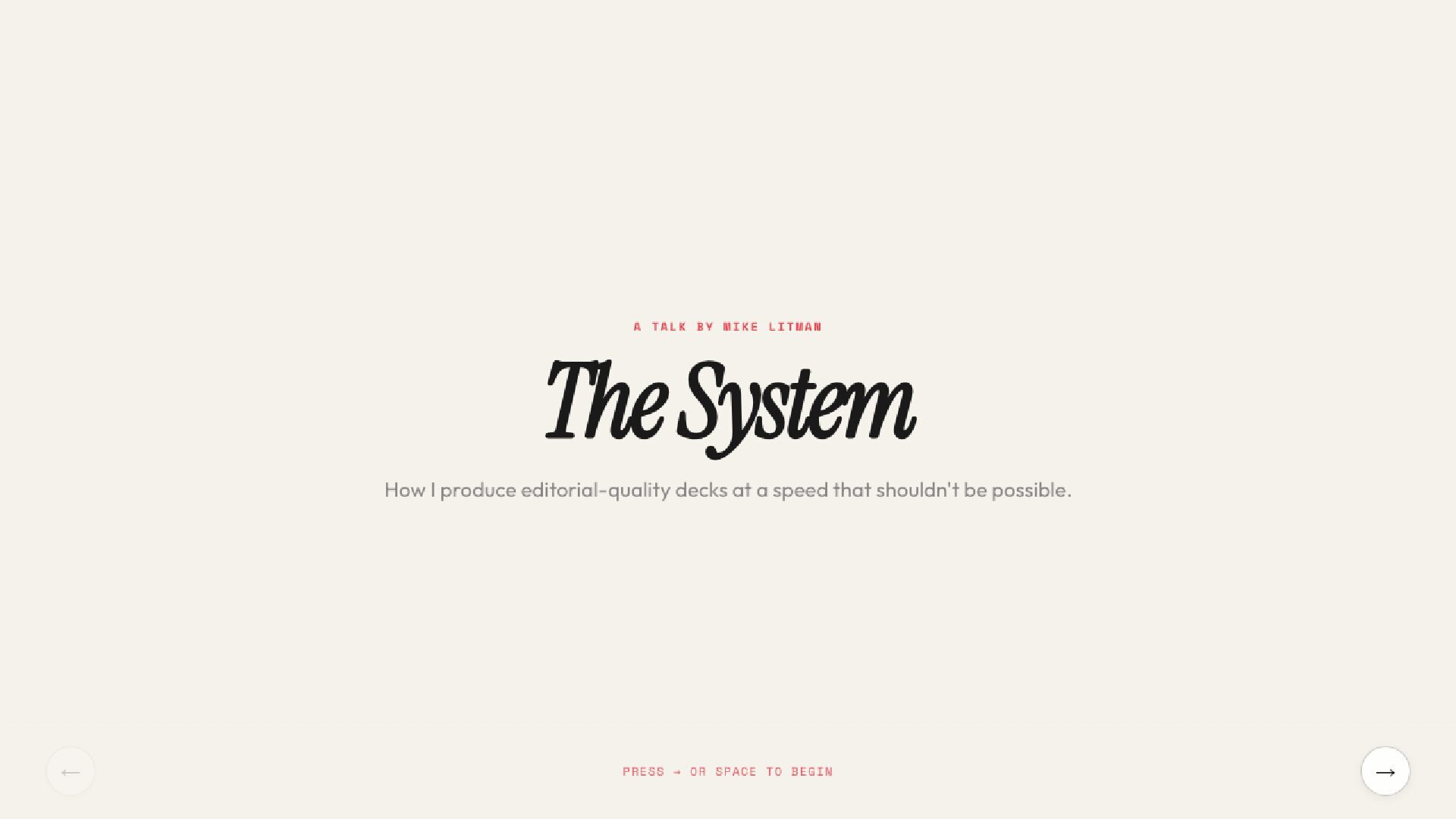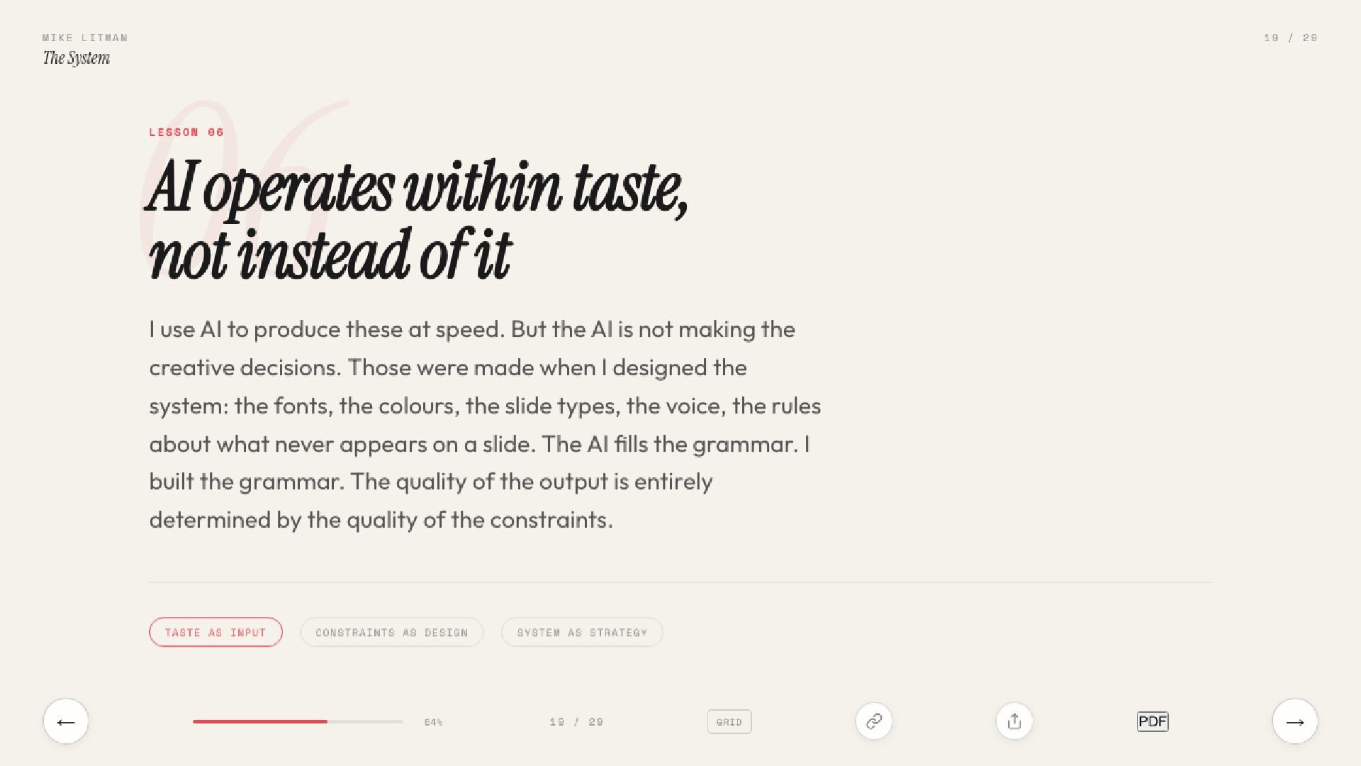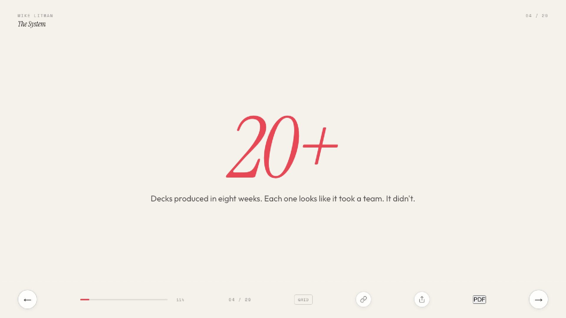 How I produce editorial-quality decks at speed. Three fonts, five colours, six slide types, and a system that makes every decision before I start. 24 slides on the method behind the output.