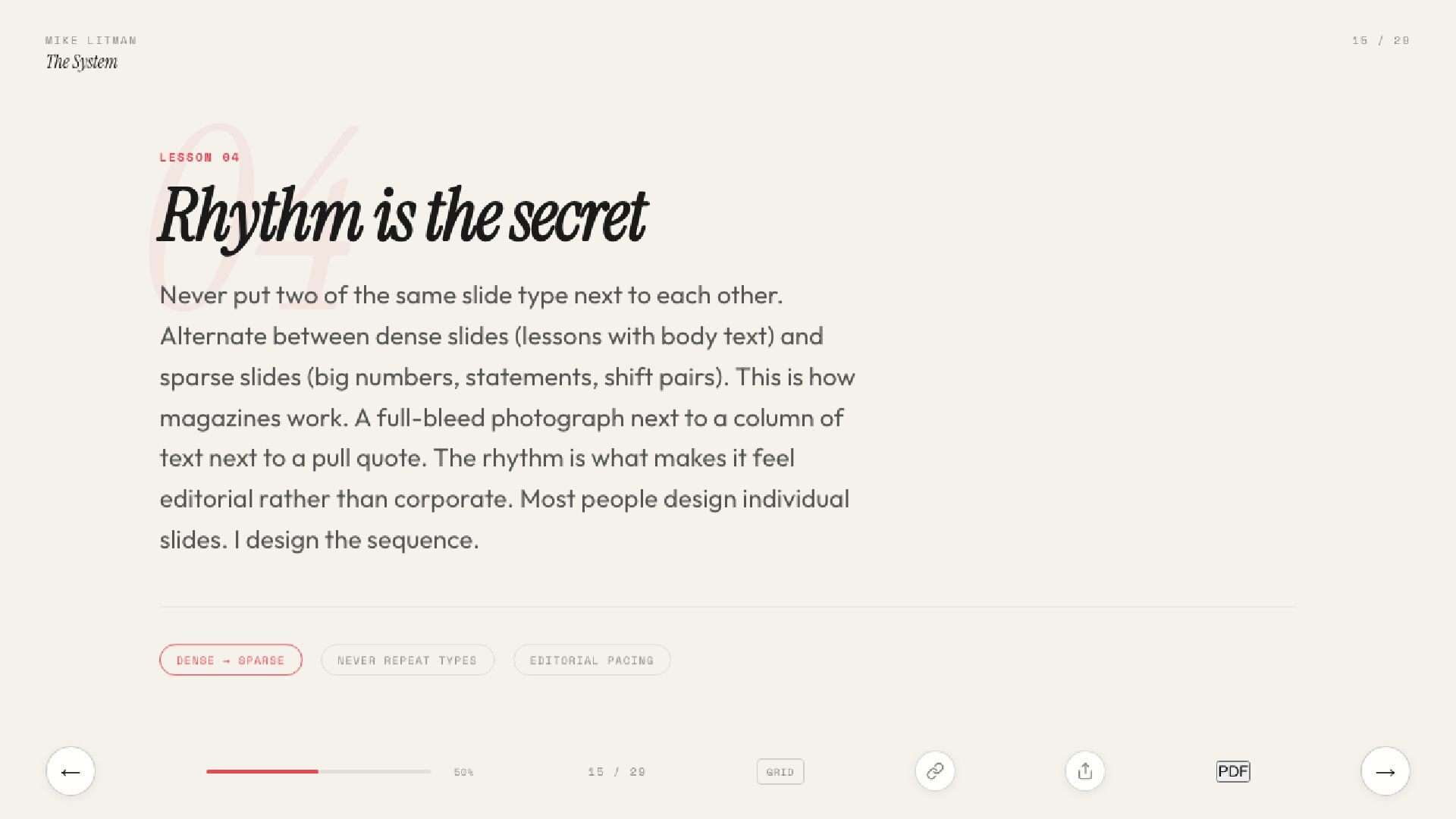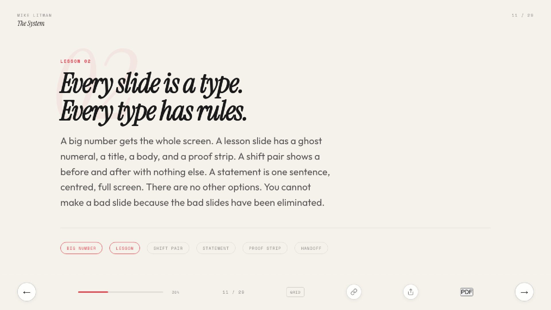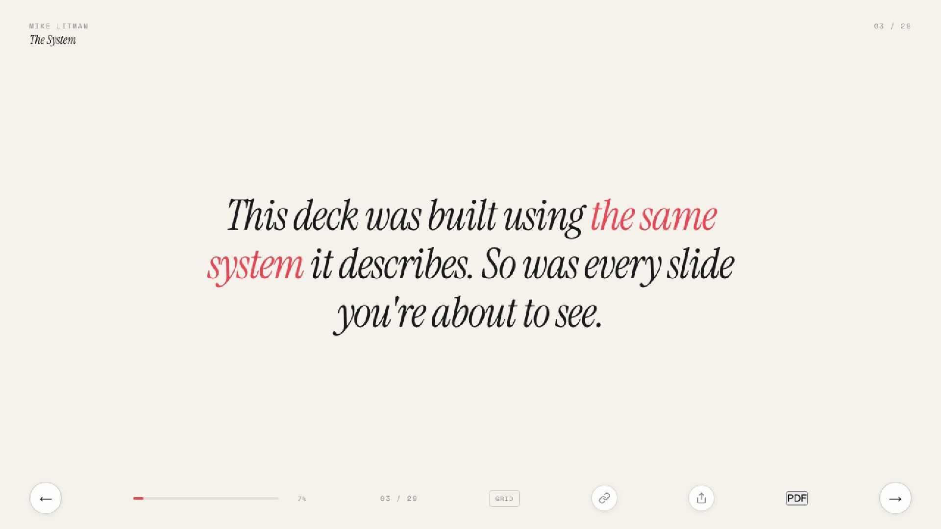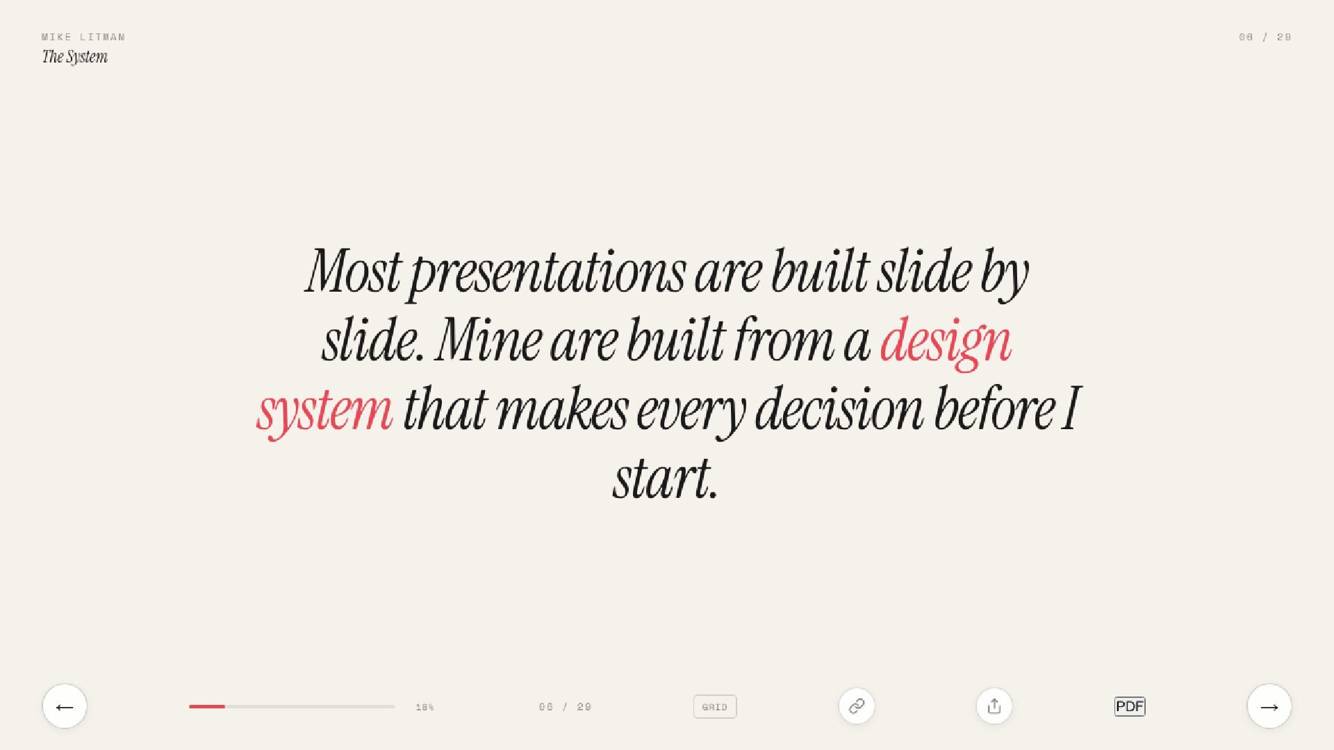 How I produce editorial-quality decks at speed. Three fonts, five colours, six slide types, and a system that makes every decision before I start. 24 slides on the method behind the output.