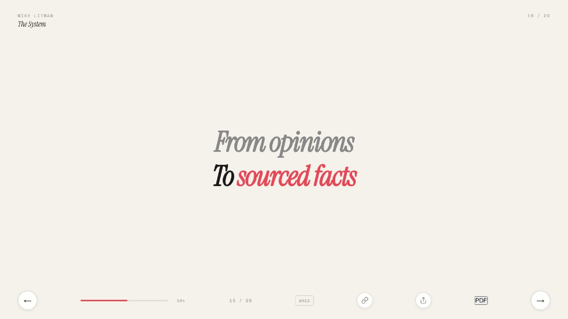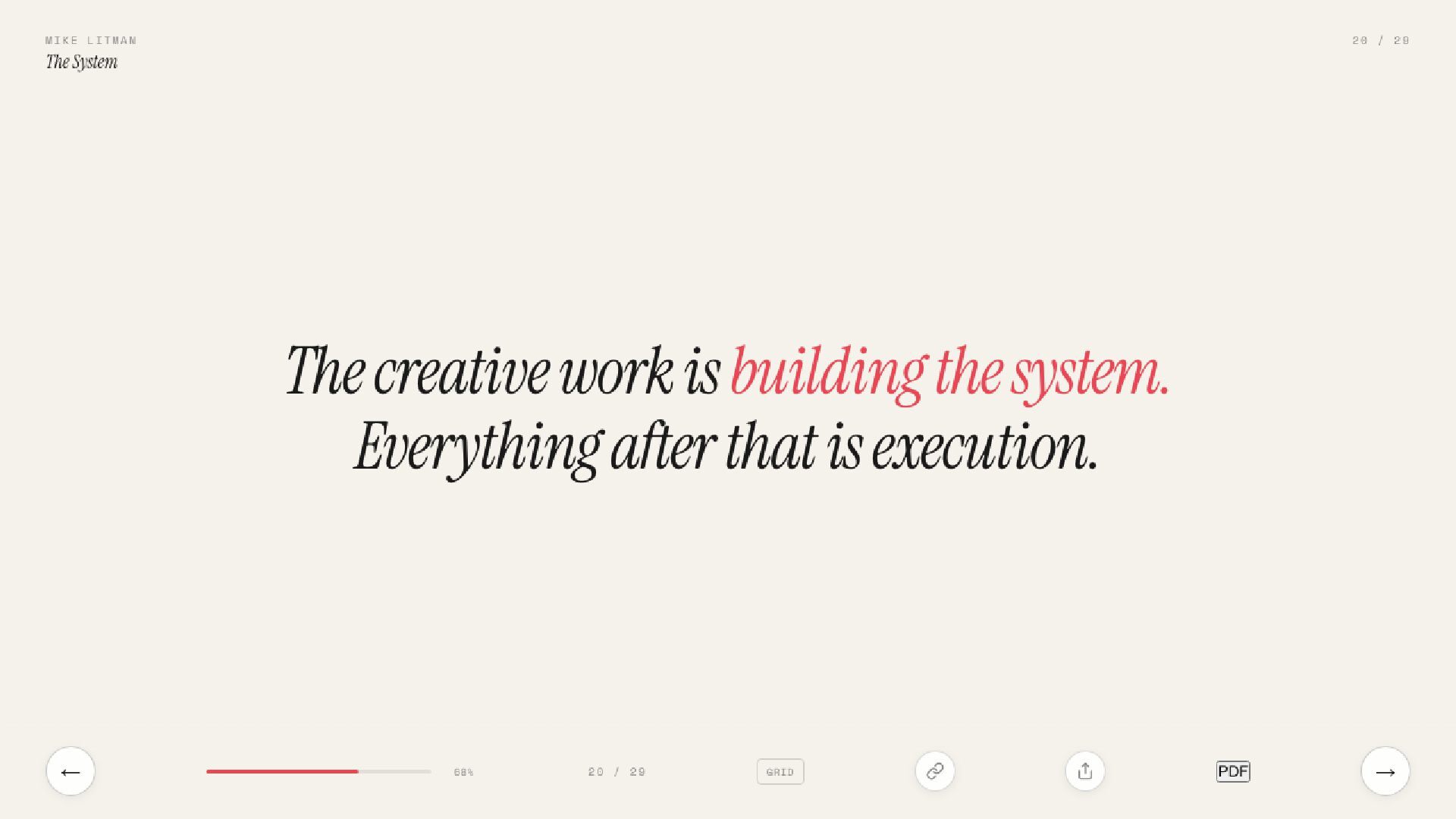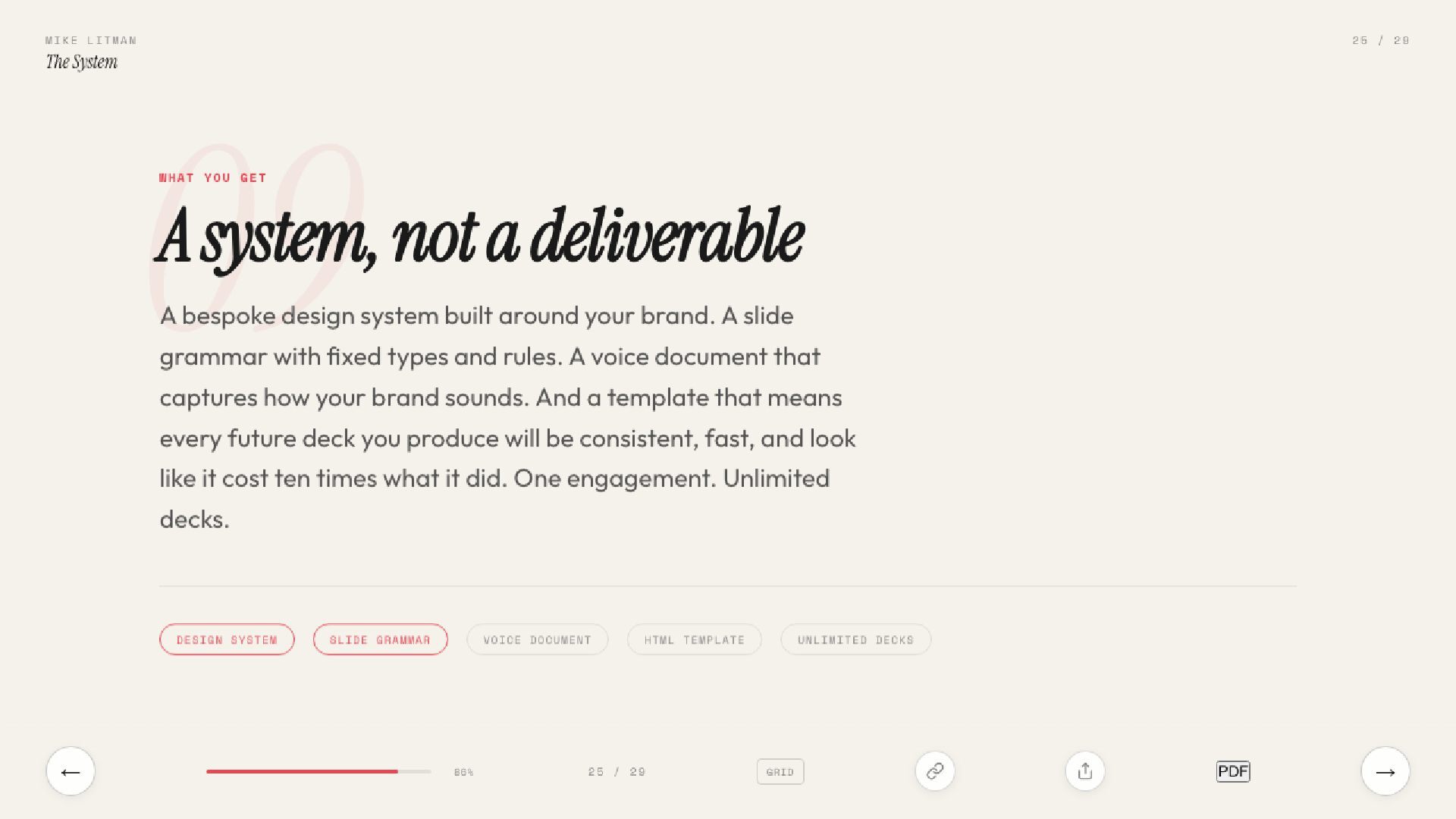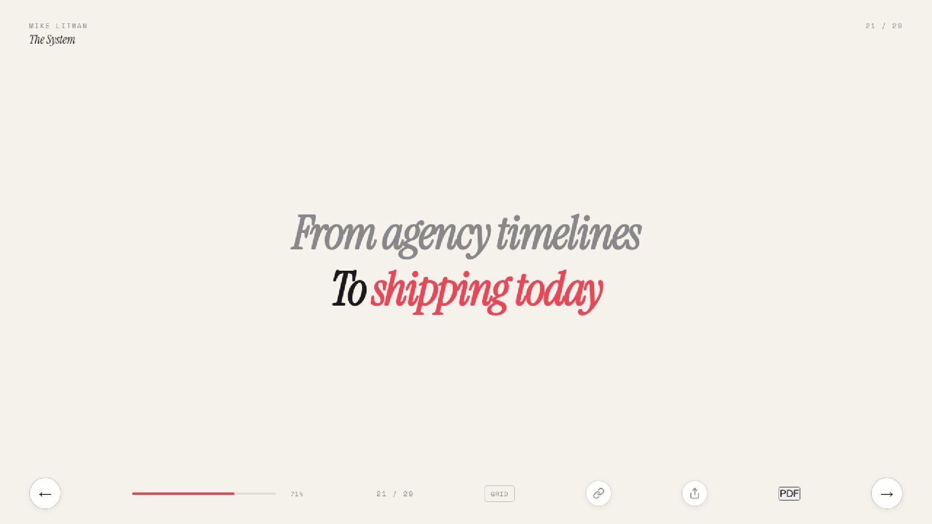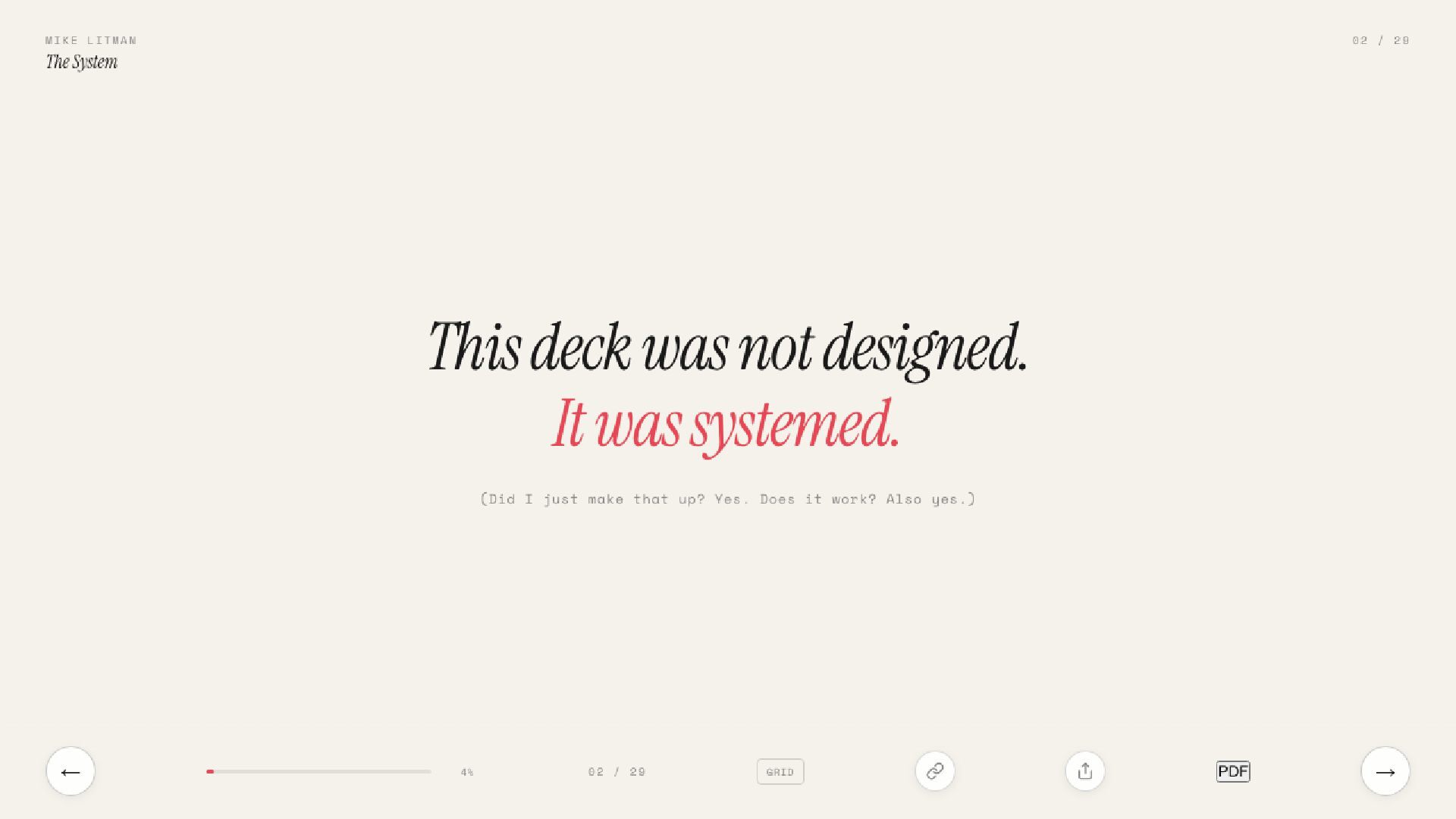 How I produce editorial-quality decks at speed. Three fonts, five colours, six slide types, and a system that makes every decision before I start. 24 slides on the method behind the output.