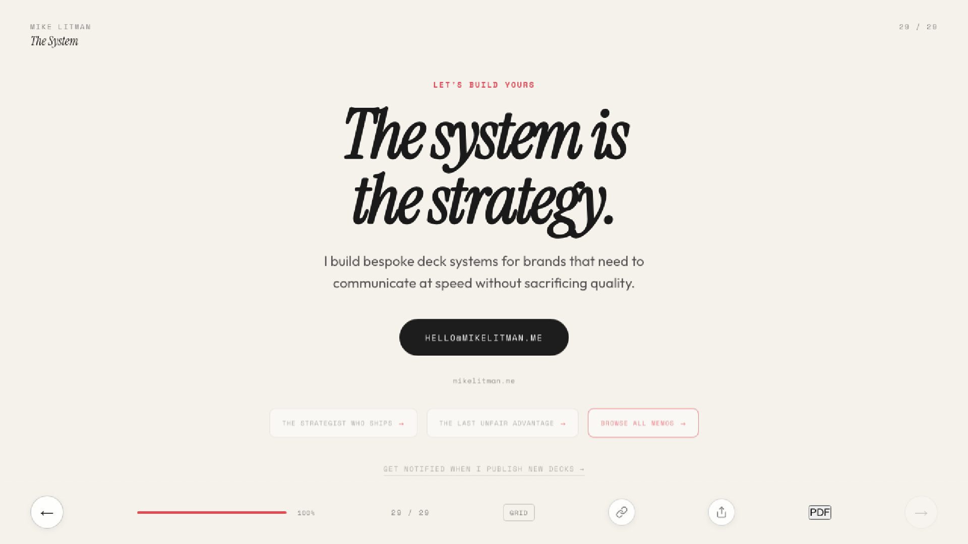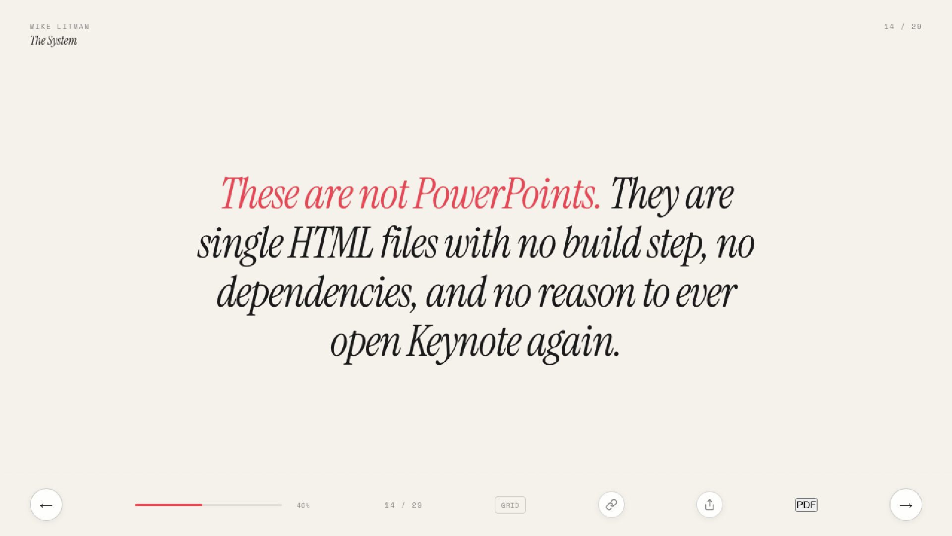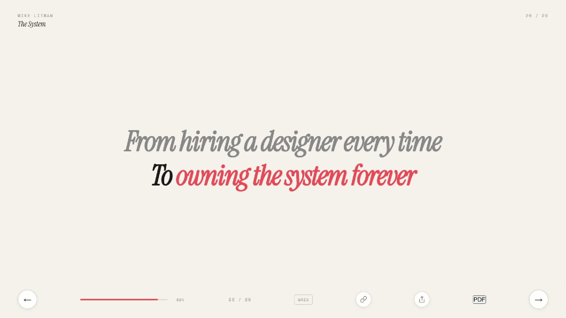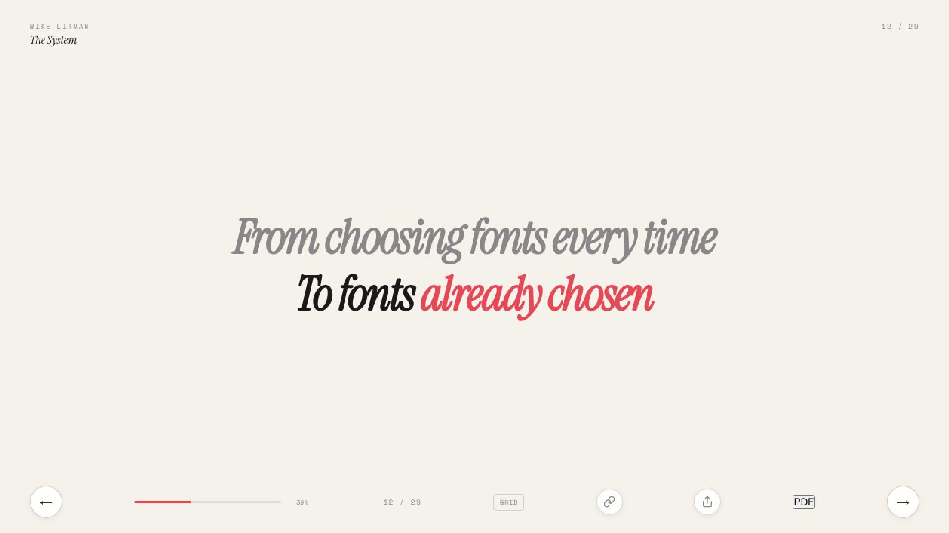 How I produce editorial-quality decks at speed. Three fonts, five colours, six slide types, and a system that makes every decision before I start. 24 slides on the method behind the output.