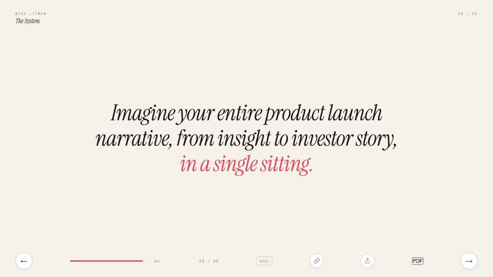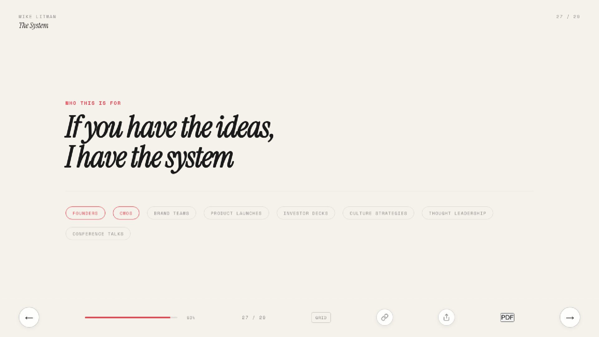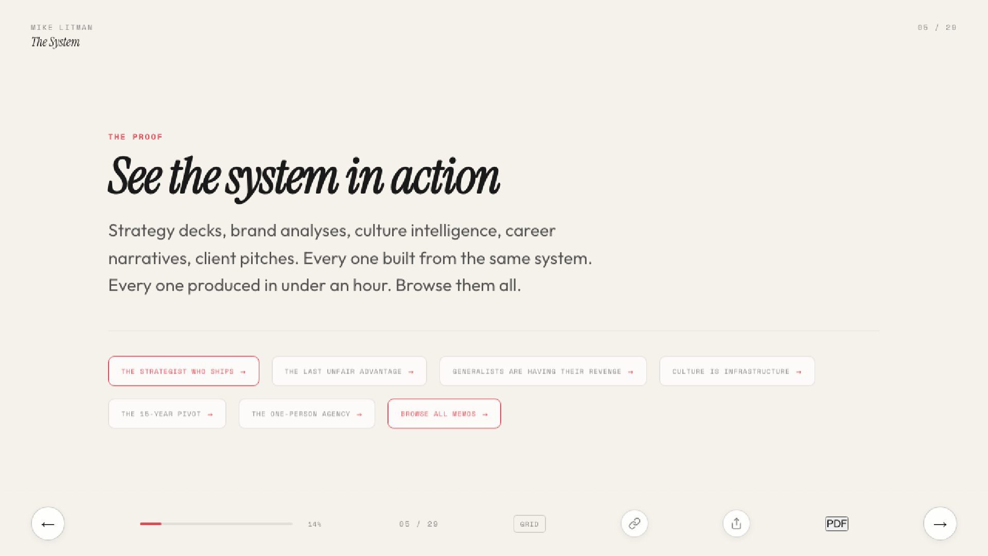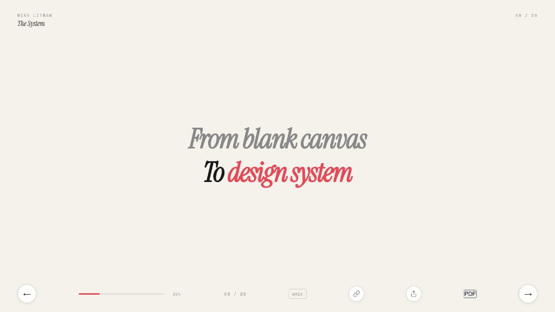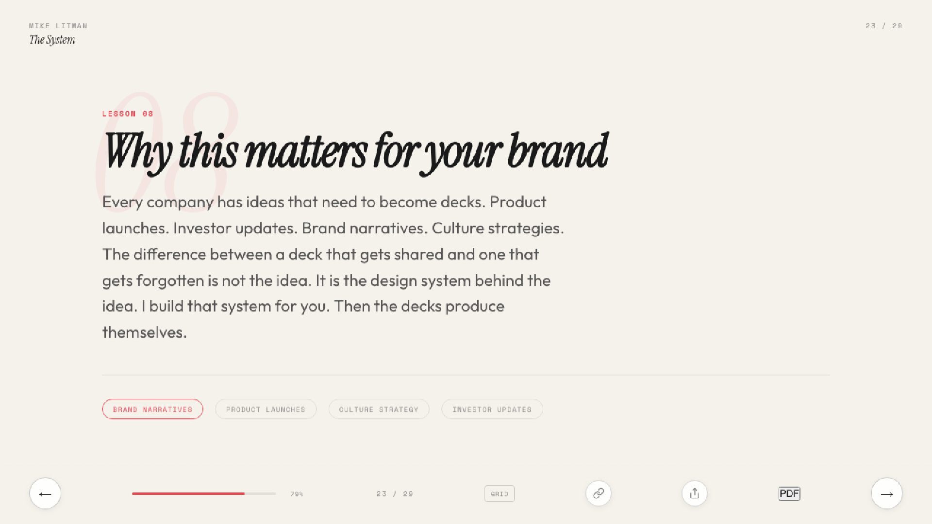 How I produce editorial-quality decks at speed. Three fonts, five colours, six slide types, and a system that makes every decision before I start. 24 slides on the method behind the output.