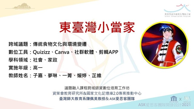 ASK愛思客團隊開發設計2021 東臺灣小當家 跨域議題:傳統食物文化與環境變遷 數位工具:Quizizz、Canva、社群軟體、剪輯APP 學科領域:社會、家政 實施年級:高一 教師姓名:子嘉、夢琳、一菁、媛婷、芷維 議題融入課程跨域師資數位培育工作坊 資策會教育研究所&國家文化記憶庫2.0專案推動中心 臺灣師大教育系陳佩英教授&