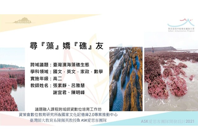 ASK愛思客團隊開發設計2021 尋『藻』嬌『礁』友 跨域議題:臺灣濱海藻礁生態 學科領域:國文.英文.家政.數學 實施年級:高二 教師姓名:張素靜、呂雅慧 謝宜君、陳明峰 議題融入課程跨域師資數位培育工作坊 資策會數位教育研究所&國家文化記憶庫2.0專案推動中心 臺灣師大教育系陳佩英教授&