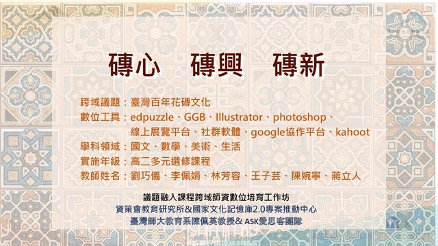 ASK愛思客團隊開發設計2021 跨域議題:臺灣百年花磚文化 數位工具:edpuzzle、GGB、Illustrator、photoshop、 線上展覽平台、社群軟體、google協作平台、kahoot 學科領域:國文、數學、美術、生活 實施年級:高二多元選修課程 教師姓名:劉巧儀、李佩娟、林芳容、王子芸、陳婉寧、蔣立人 議題融入課程跨域師資數位培育工作坊 資策會教育研究所&國家文化記憶庫2.0專案推動中心 臺灣師大教育系陳佩英教授&