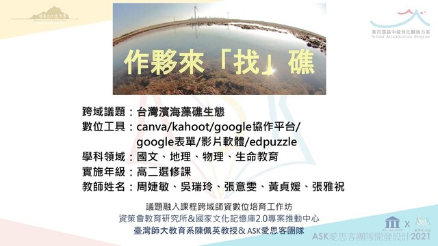ASK愛思客團隊開發設計2021 跨域議題:台灣濱海藻礁生態 數位工具:canva/kahoot/google協作平台/ google表單/影片軟體/edpuzzle 學科領域:國文、地理、物理、生命教育 實施年級:高二選修課 教師姓名:周婕敏、吳瑞玲、張意雯、黃貞媛、張雅祝 議題融入課程跨域師資數位培育工作坊 資策會教育研究所&國家文化記憶庫2.0專案推動中心 臺灣師大教育系陳佩英教授&