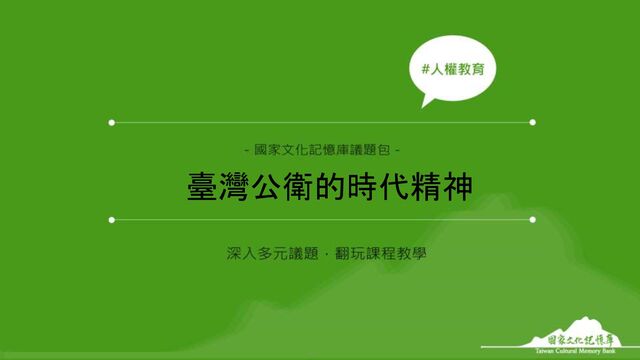 國家文化記憶庫議題包 2 關於臺灣這片土地的一切,國家文化記憶庫希望透過公眾共筆、開放的數位文化資源,以共 享、傳承與學習的了解,邀請大眾一起關注當代社會議題,透過社會不分你我,一起參與、互 動,達到多元族群對話、多元文化與其價值共存的願景,讓每個人深刻體認自身文化的重要性, 朝向知識共享、共創的數位博物館前進,讓臺灣成為在教育文化平權上的典範。 國家文化記憶庫呼應108課綱提出的19項重點及聯合國永續發展目標(SDGs),聚焦於多元文 化、環境海洋、人權教育之議題主軸,進而規劃「國家文化記憶庫議題包」,從真實社會的問 題出發,培育下一代以數位工具為媒介,進行當代議題探究與反思,導引產出多元觀點數位敘 事的精彩學習成效!