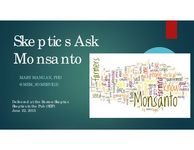 At Boston Skeptics "Skeptics in the Pub" on June 22, 2015, skeptics' questions for a Monsanto scientist provided a productive discussion. Larry Gilbertson of Monsanto answered.