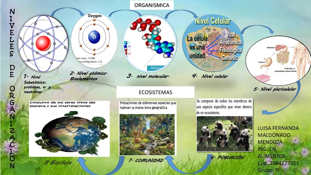 R G A N I Z A C I O N ORGANISMICA ECOSISTEMAS 1. Nivel Subatómico: protones, e- y neutrones 2. Nivel atómico. Bioelementos 3. nivel molecular. 4. Nivel celular 5. Nivel pluricelular 6. POBLACIÓN 7. COMUNIDAD 8.Biosfera LUISA FERNANDA MALDONADO MENDOZA ING. EN ALIMENTOS Cod. 1094277911 Grupo: D