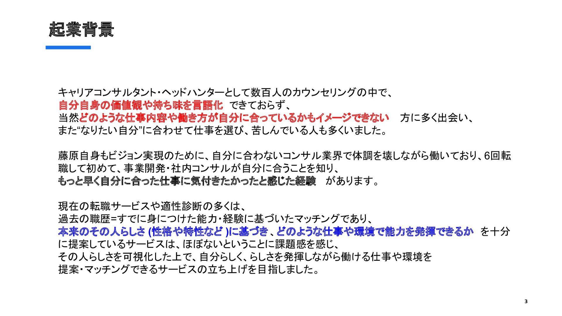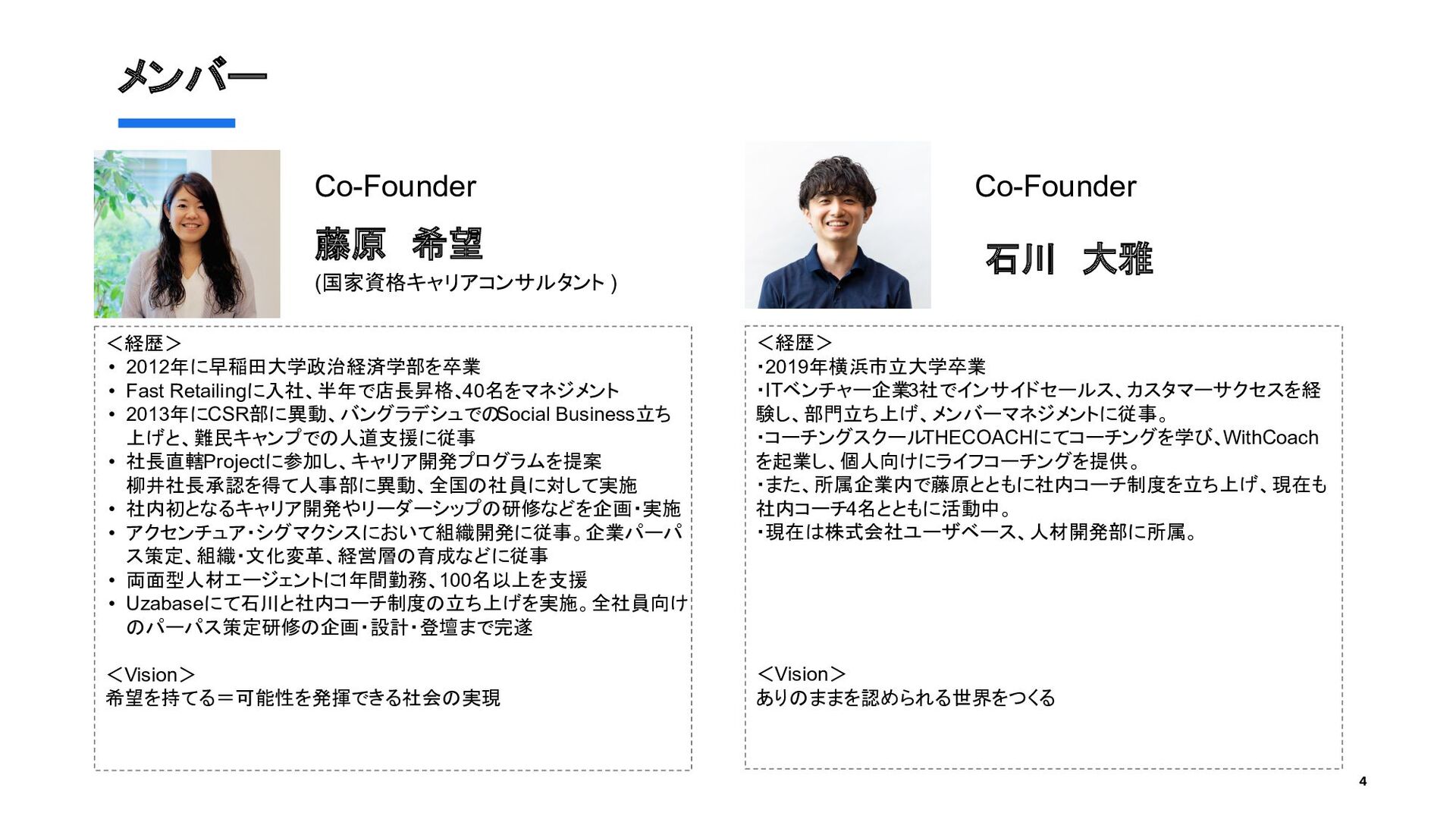 Social Business立ち 上げと、難民キャンプでの人道支援に従事 • 社長直轄Projectに参加し、キャリア開発プログラムを提案 柳井社長承認を得て人事部に異動、全国の社員に対して実施 • 社内初となるキャリア開発やリーダーシップの研修などを企画・実施 • アクセンチュア・シグマクシスにおいて組織開発に従事。企業パーパ ス策定、組織・文化変革、経営層の育成などに従事 • 両面型人材エージェントに 1年間勤務、100名以上を支援 • Uzabaseにて石川と社内コーチ制度の立ち上げを実施。全社員向け のパーパス策定研修の企画・設計・登壇まで完遂 <Vision> 希望を持てる=可能性を発揮できる社会の実現 藤原 希望 (国家資格キャリアコンサルタント ) 石川 大雅 <経歴> ・2019年横浜市立大学卒業 ・ITベンチャー企業3社でインサイドセールス、カスタマーサクセスを経 験し、部門立ち上げ、メンバーマネジメントに従事。 ・コーチングスクールTHECOACHにてコーチングを学び、WithCoach を起業し、個人向けにライフコーチングを提供。 ・また、所属企業内で藤原とともに社内コーチ制度を立ち上げ、現在も 社内コーチ4名とともに活動中。 ・現在は株式会社ユーザベース、人材開発部に所属。 <Vision> ありのままを認められる世界をつくる Co-Founder Co-Founder 4