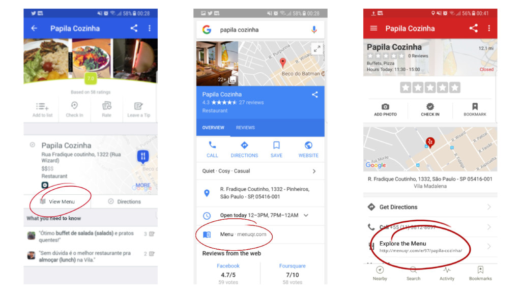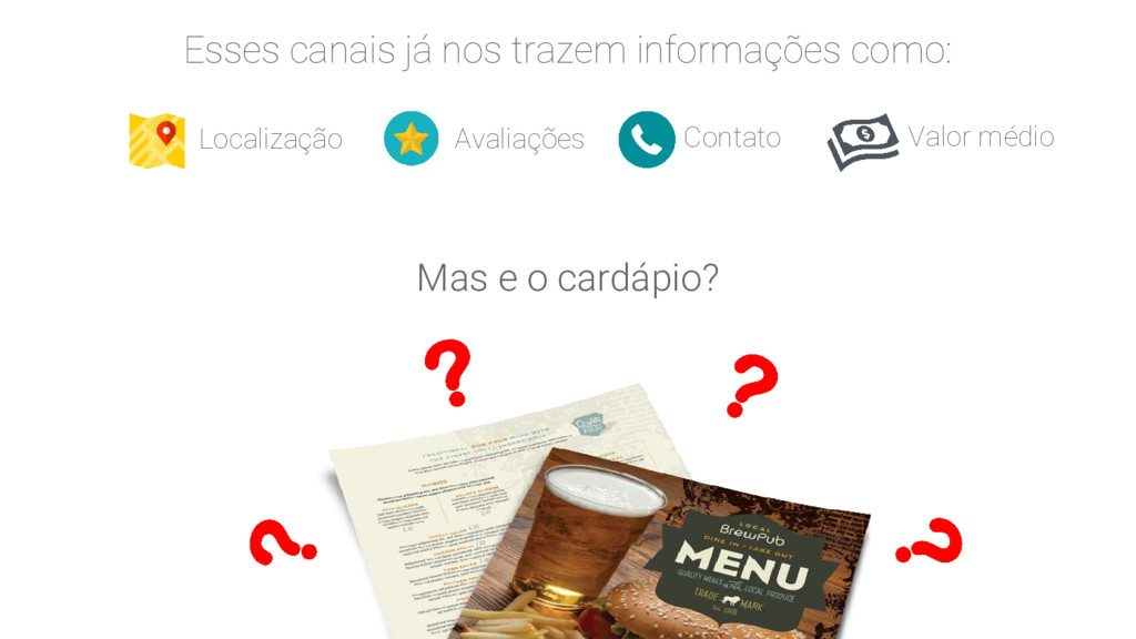 Esses canais fornecem informações como: localização, avaliações, contato, valor médio mas o cardápio raramente está disponível.