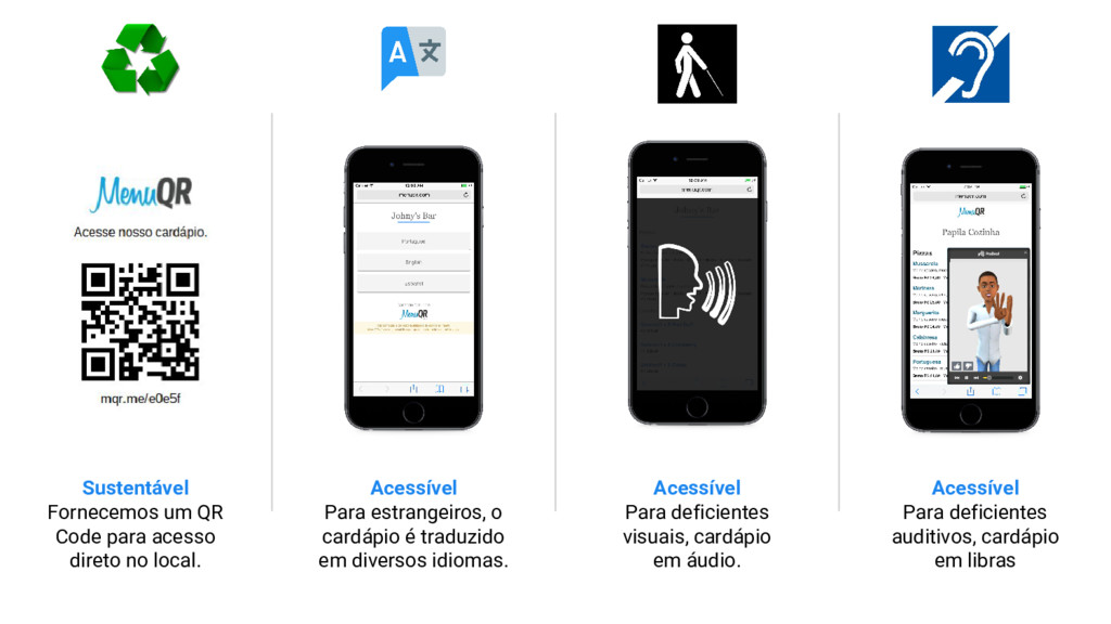 O cardápio digital elimina panfletos e o QR code diminui o numero de cardápios físicos do local, deixamos o cardápio acessível para estrangeiros traduzindo para vários idiomas, tornamos acessível para deficientes visuais adequando para leitores de tela, levamos acessibilidade a deficientes auditivos através de ferramenta com personagem 3D que representa em libras.