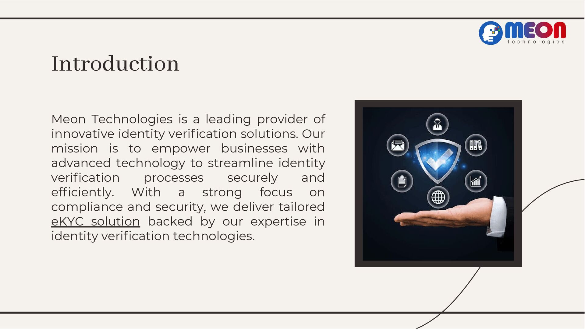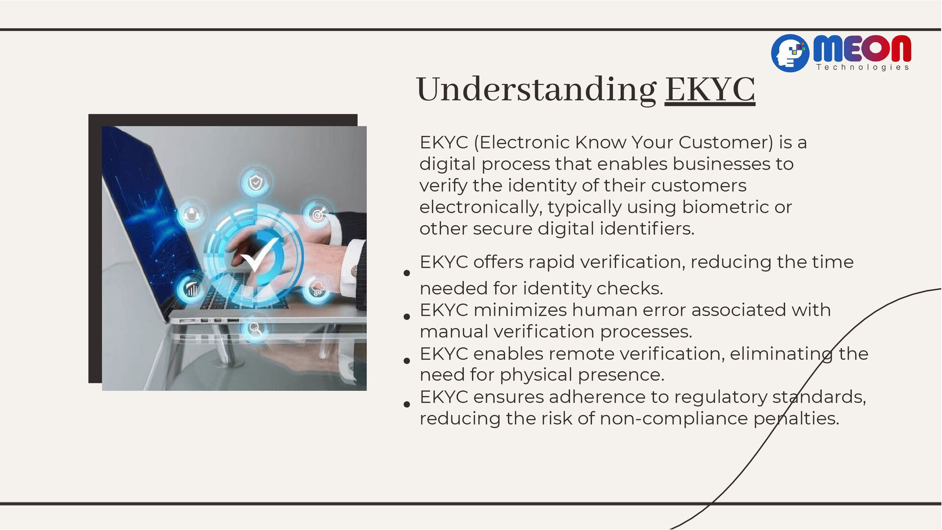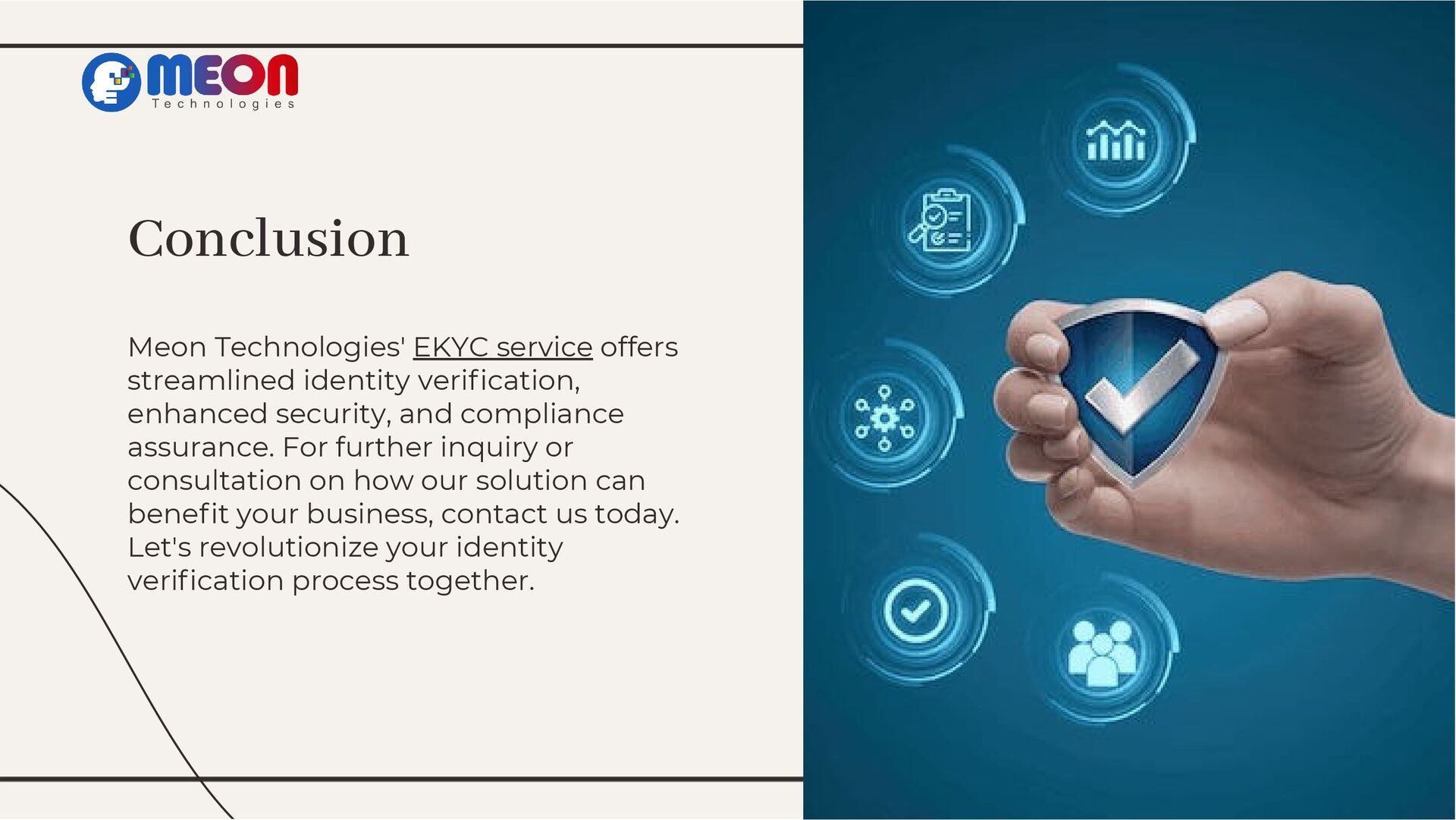 Dive into Meon Technologies' groundbreaking EKYC service, exploring its transformative impact on identity verification. From understanding EKYC's significance to showcasing Meon's tailored features and real-world success stories, this presentation navigates the landscape of streamlined verification. Join the revolution and streamline your identity verification process today.