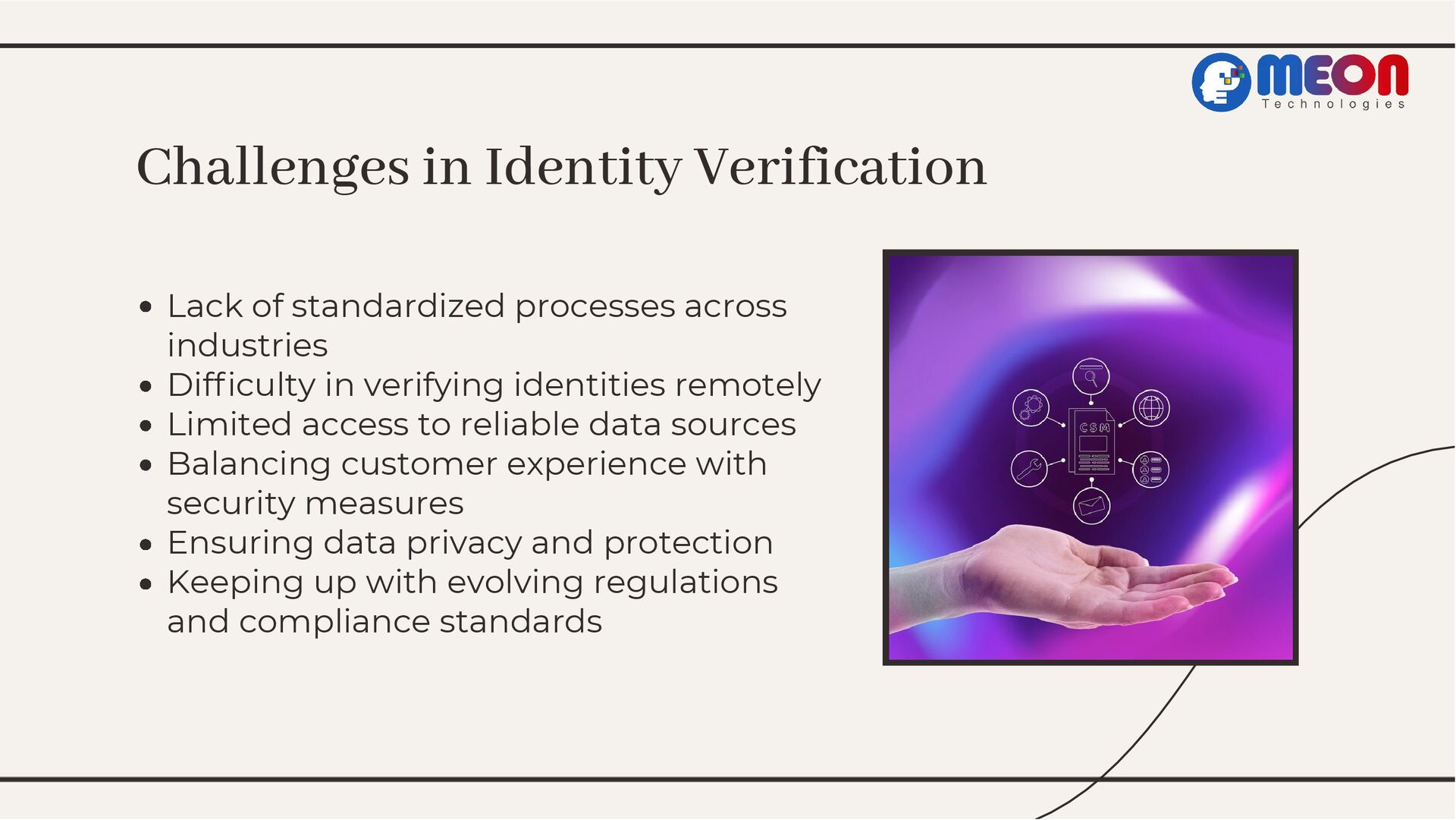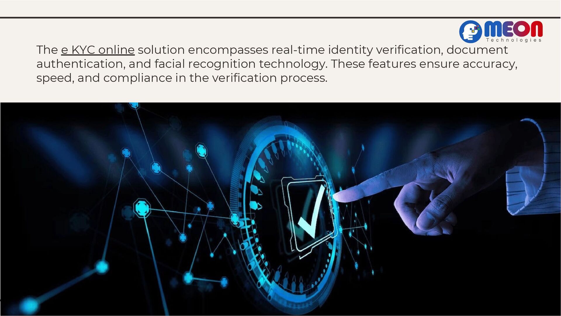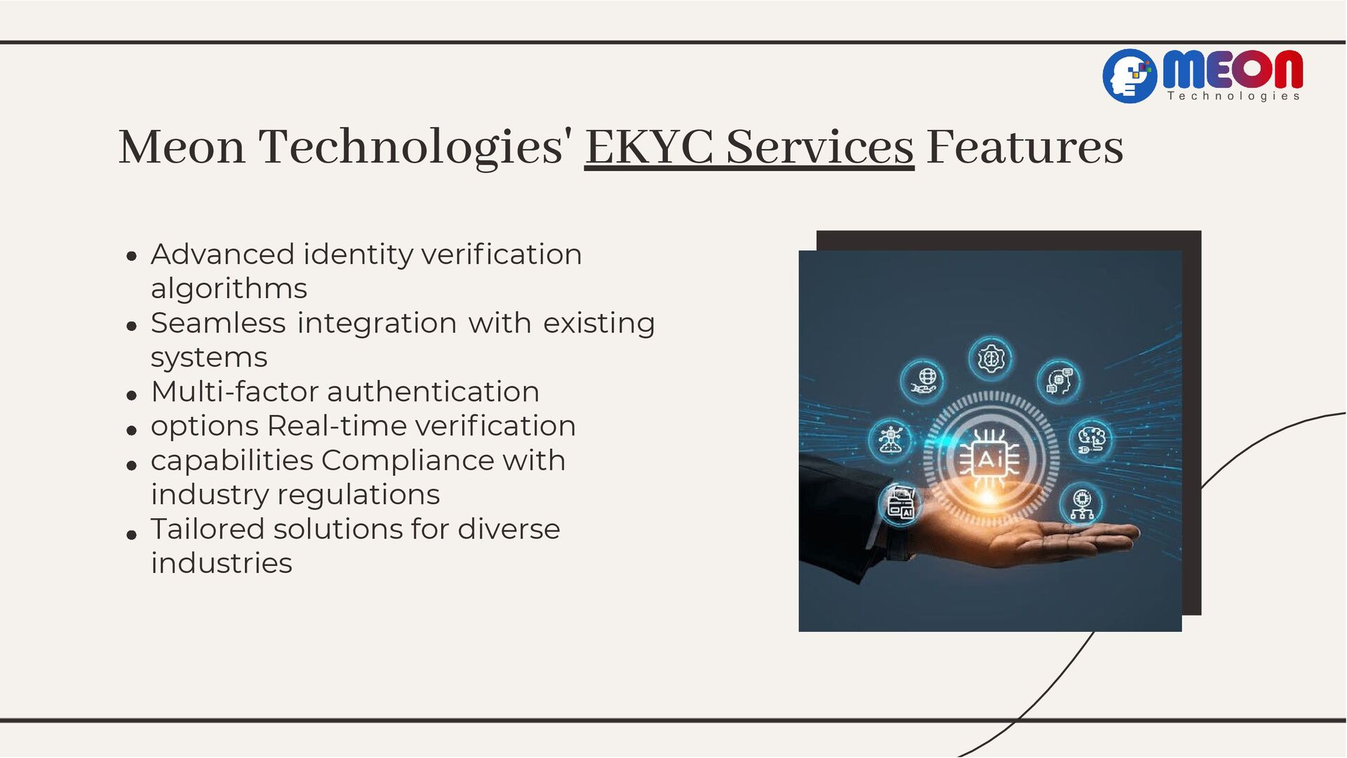 Dive into Meon Technologies' groundbreaking EKYC service, exploring its transformative impact on identity verification. From understanding EKYC's significance to showcasing Meon's tailored features and real-world success stories, this presentation navigates the landscape of streamlined verification. Join the revolution and streamline your identity verification process today.