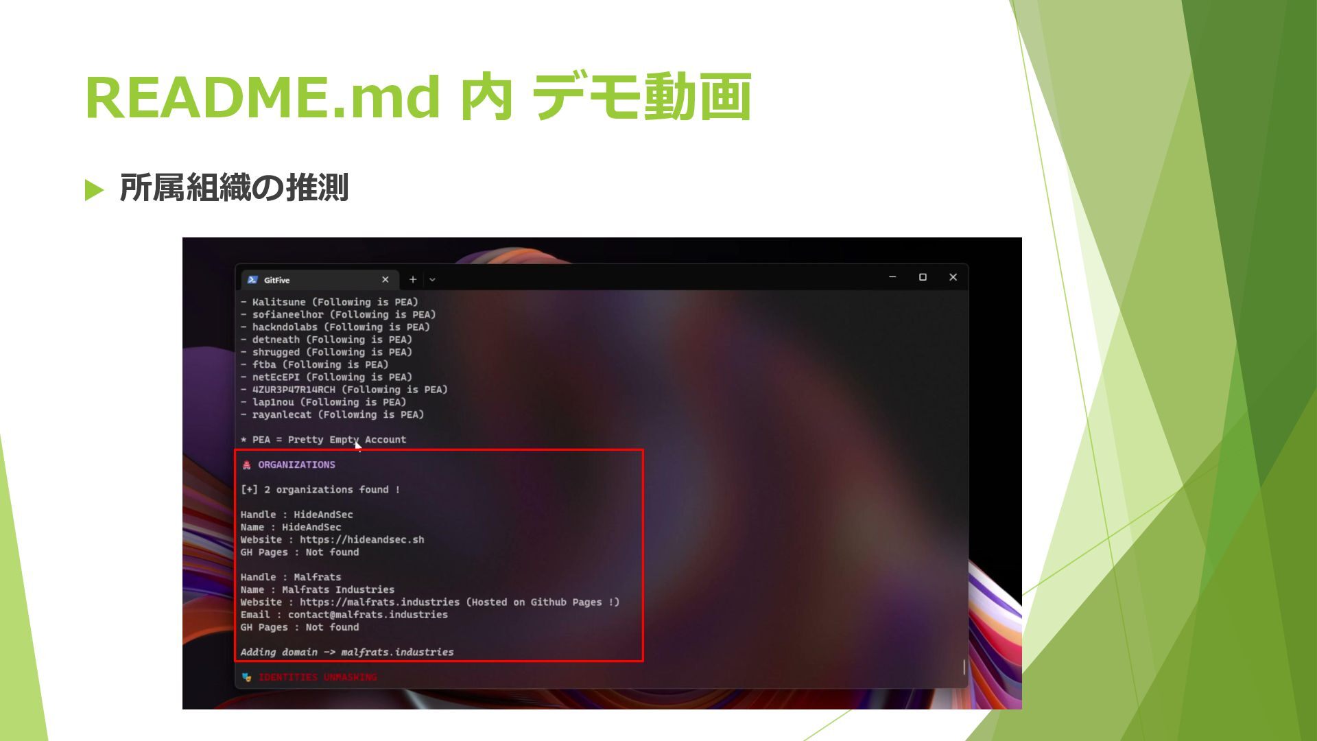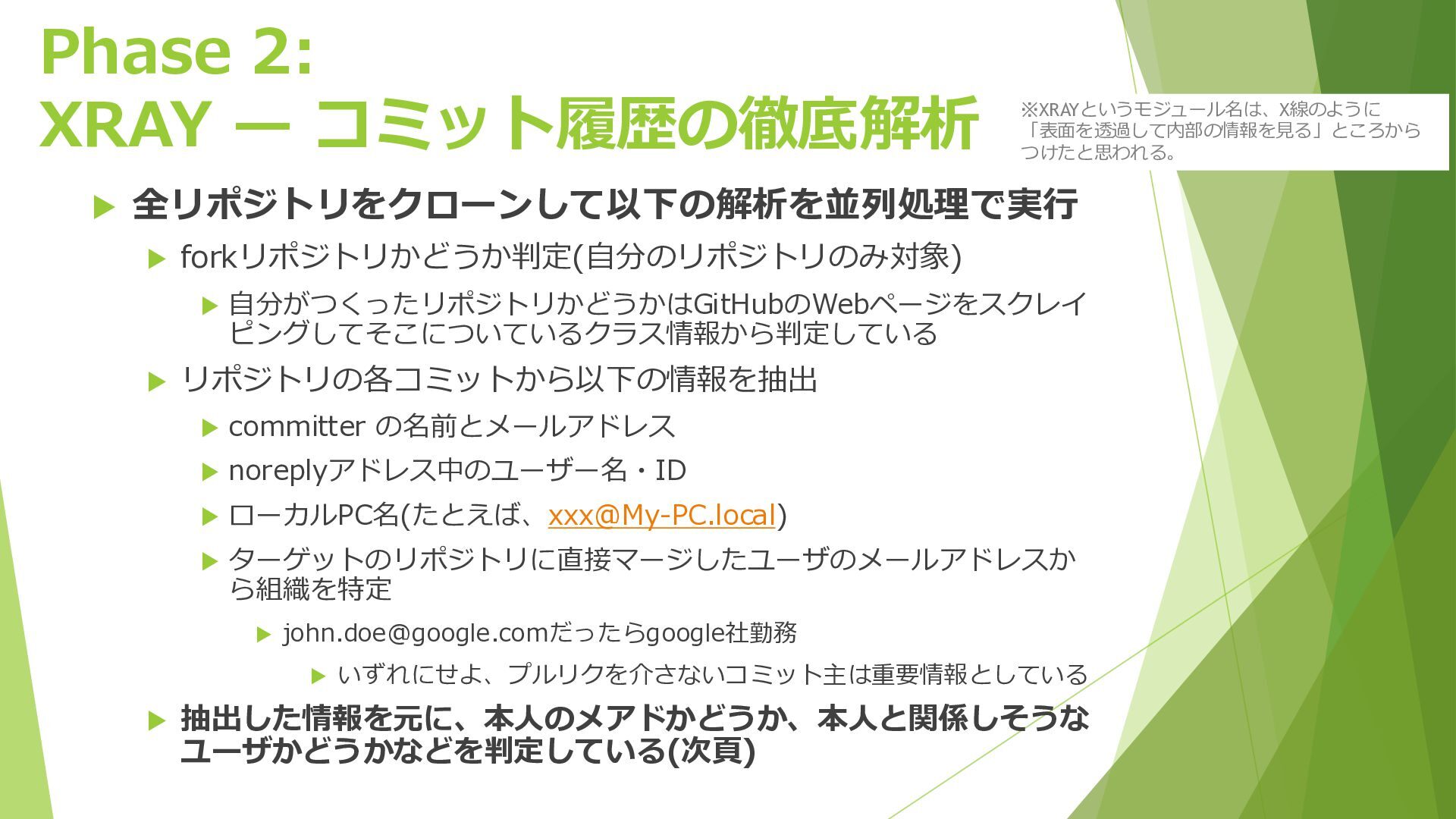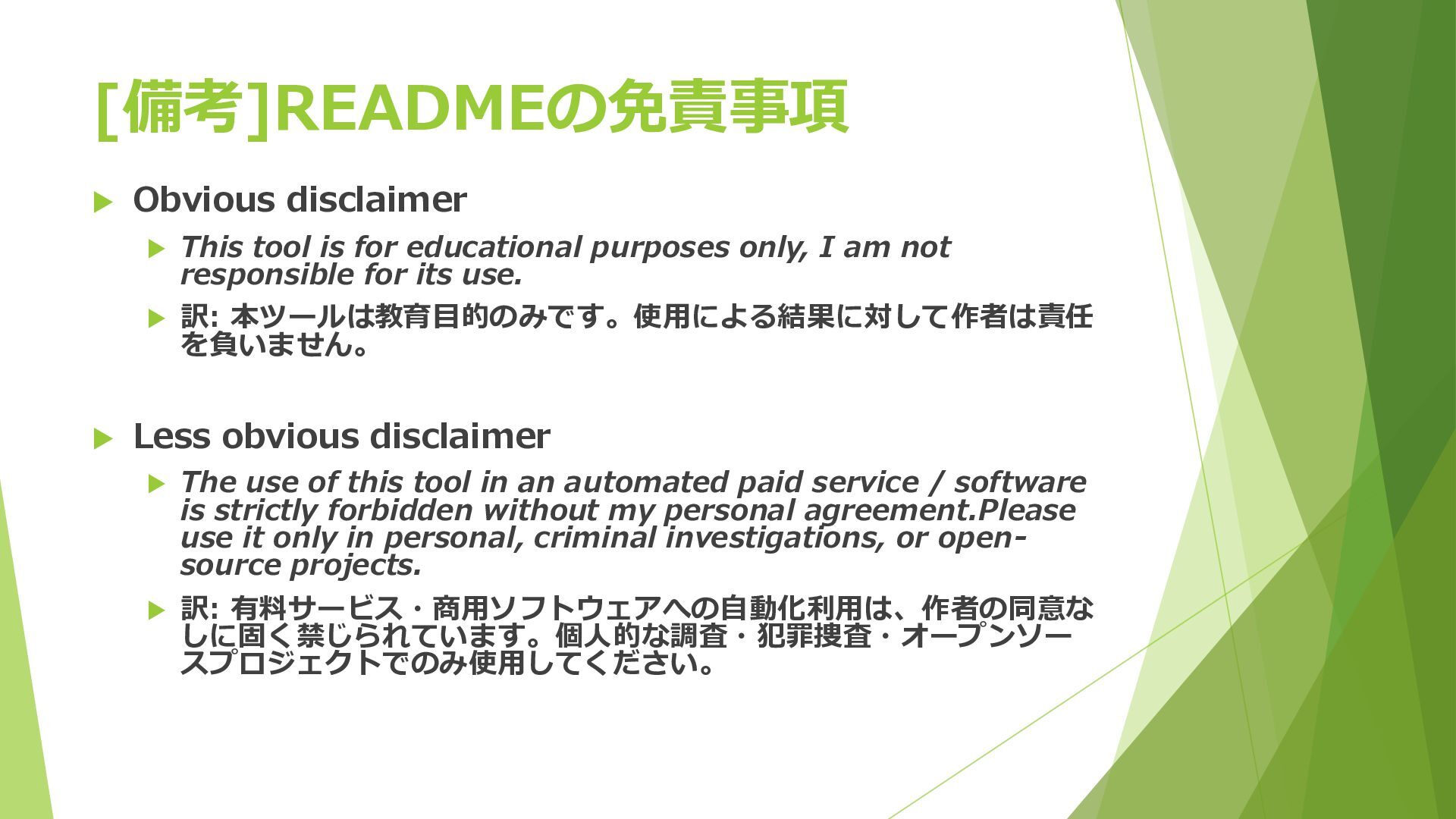 purposes only, I am not responsible for its use. 訳: 本ツールは教育目的のみです。使用による結果に対して作者は責任 を負いません。 Less obvious disclaimer The use of this tool in an automated paid service / software is strictly forbidden without my personal agreement.Please use it only in personal, criminal investigations, or open- source projects. 訳: 有料サービス・商用ソフトウェアへの自動化利用は、作者の同意な しに固く禁じられています。個人的な調査・犯罪捜査・オープンソー スプロジェクトでのみ使用してください。