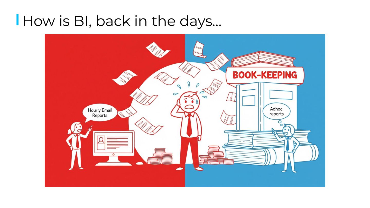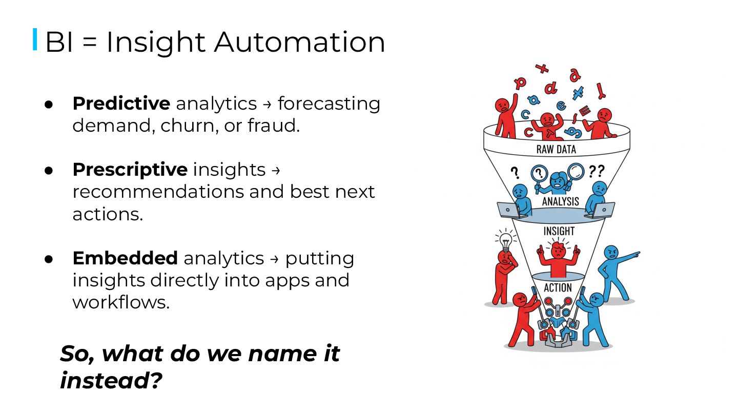 It emphasizes the need for companies to gain insights from their vast amounts of data faster and smarter, and redefines traditional BI not as "business reporting" but as data intelligence for making better data-driven decisions.