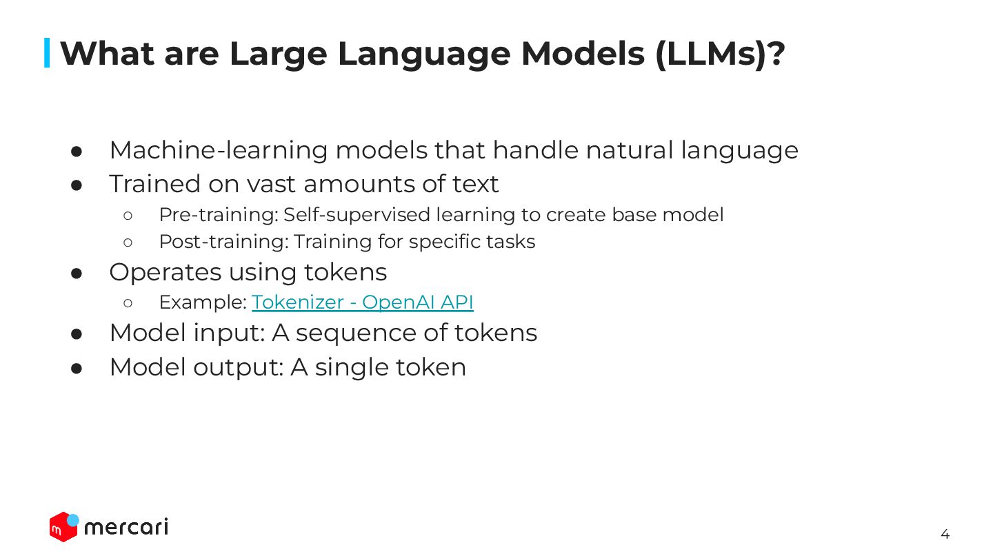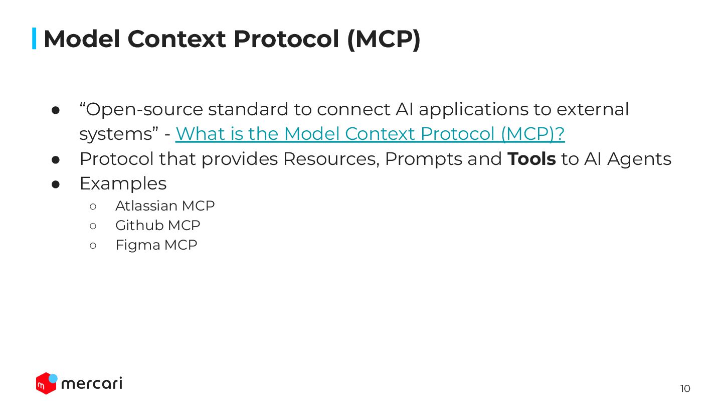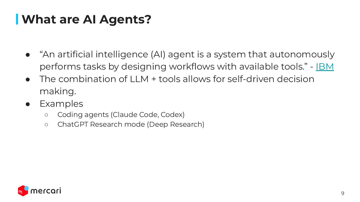 It also explains the definition of AI agents, which combine LLMs with tools to enable autonomous task execution, and the Model Context Protocol (MCP) for connecting AI applications to external systems.