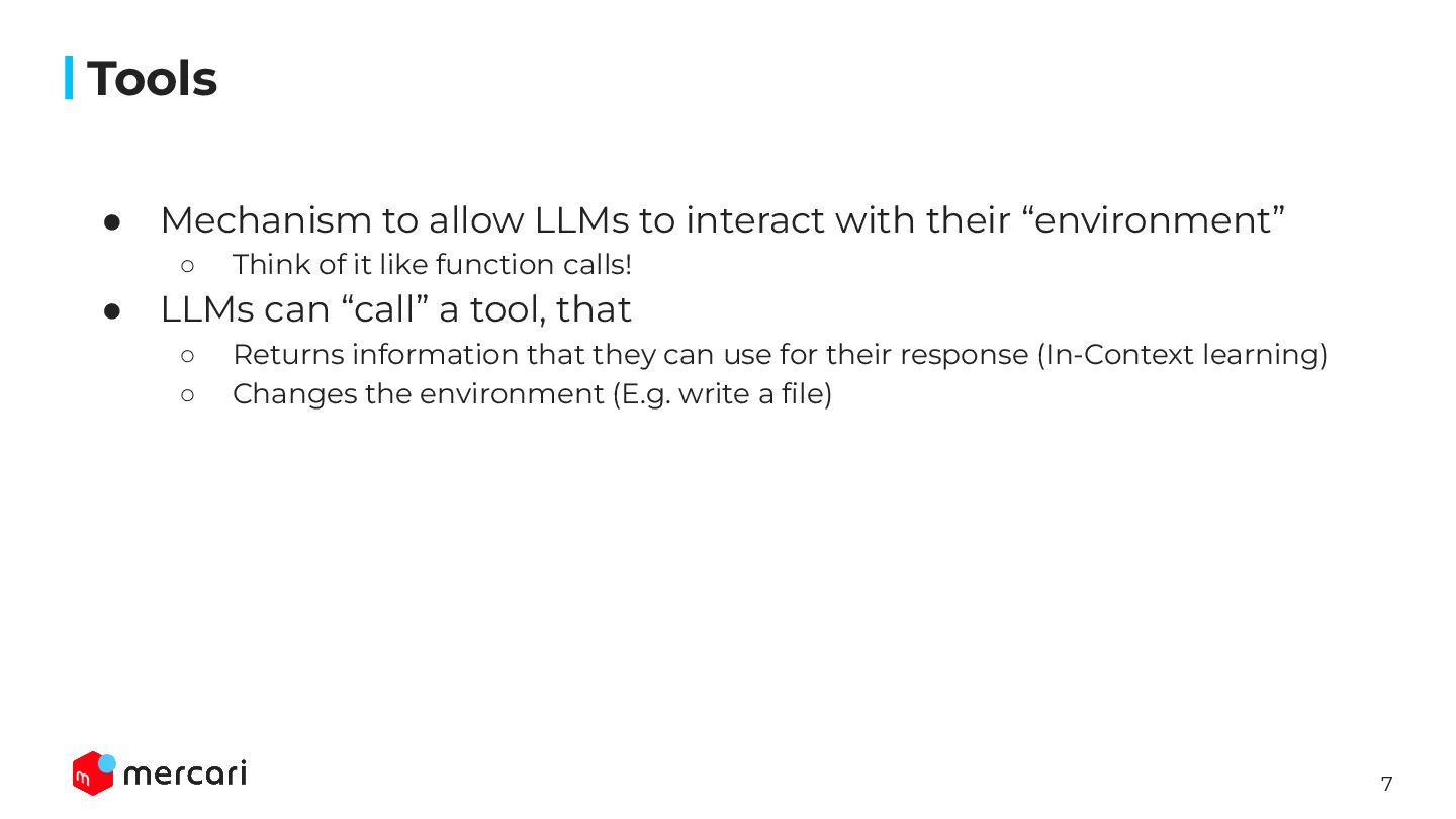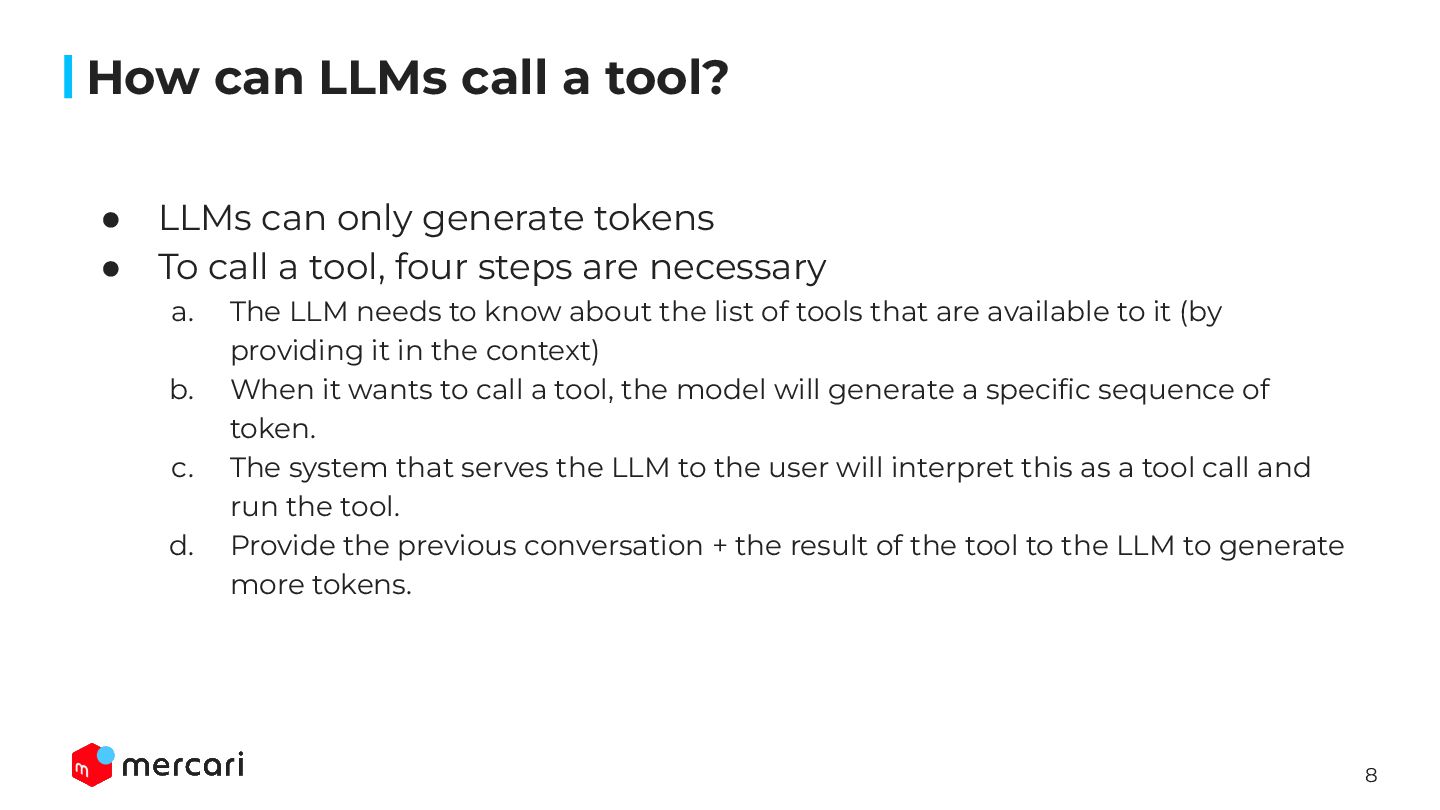 This slide introduces the principles of Large Language Models (LLMs) and the concepts of various tools that enable LLMs to interact with external environments.