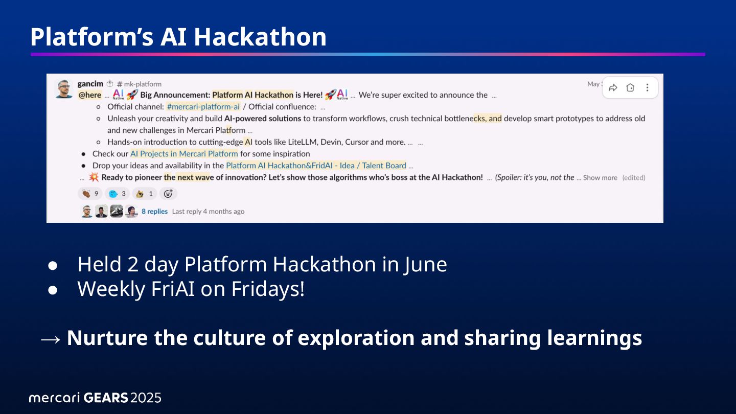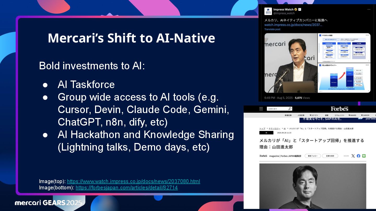 Taskforce • Group wide access to AI tools (e.g. Cursor, Devin, Claude Code, Gemini, ChatGPT, n8n, dify, etc) • AI Hackathon and Knowledge Sharing (Lightning talks, Demo days, etc) Image(top): https://www.watch.impress.co.jp/docs/news/2037080.html Image(bottom): https://forbesjapan.com/articles/detail/82714