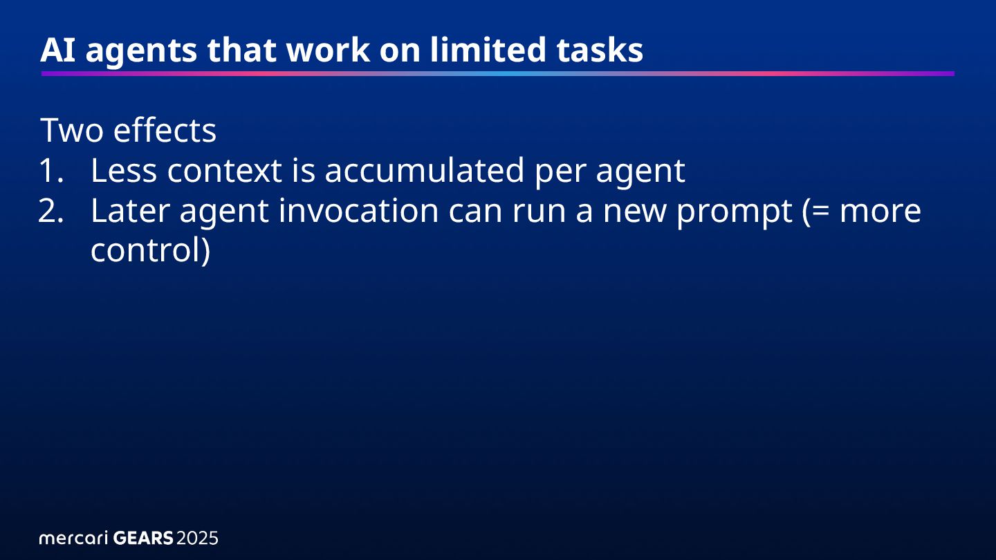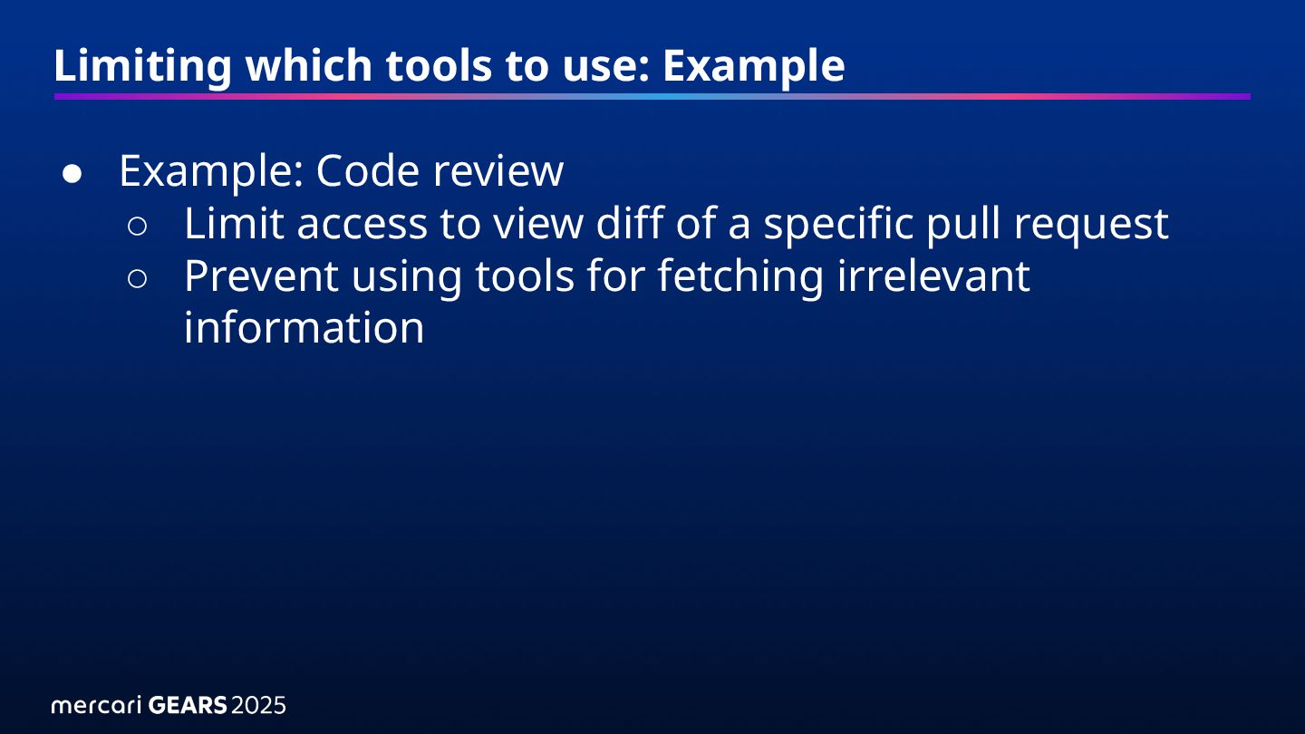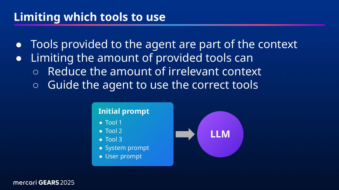 agent are part of the context • Limiting the amount of provided tools can ◦ Reduce the amount of irrelevant context ◦ Guide the agent to use the correct tools LLM Initial prompt • Tool 1 • Tool 2 • Tool 3 • System prompt • User prompt