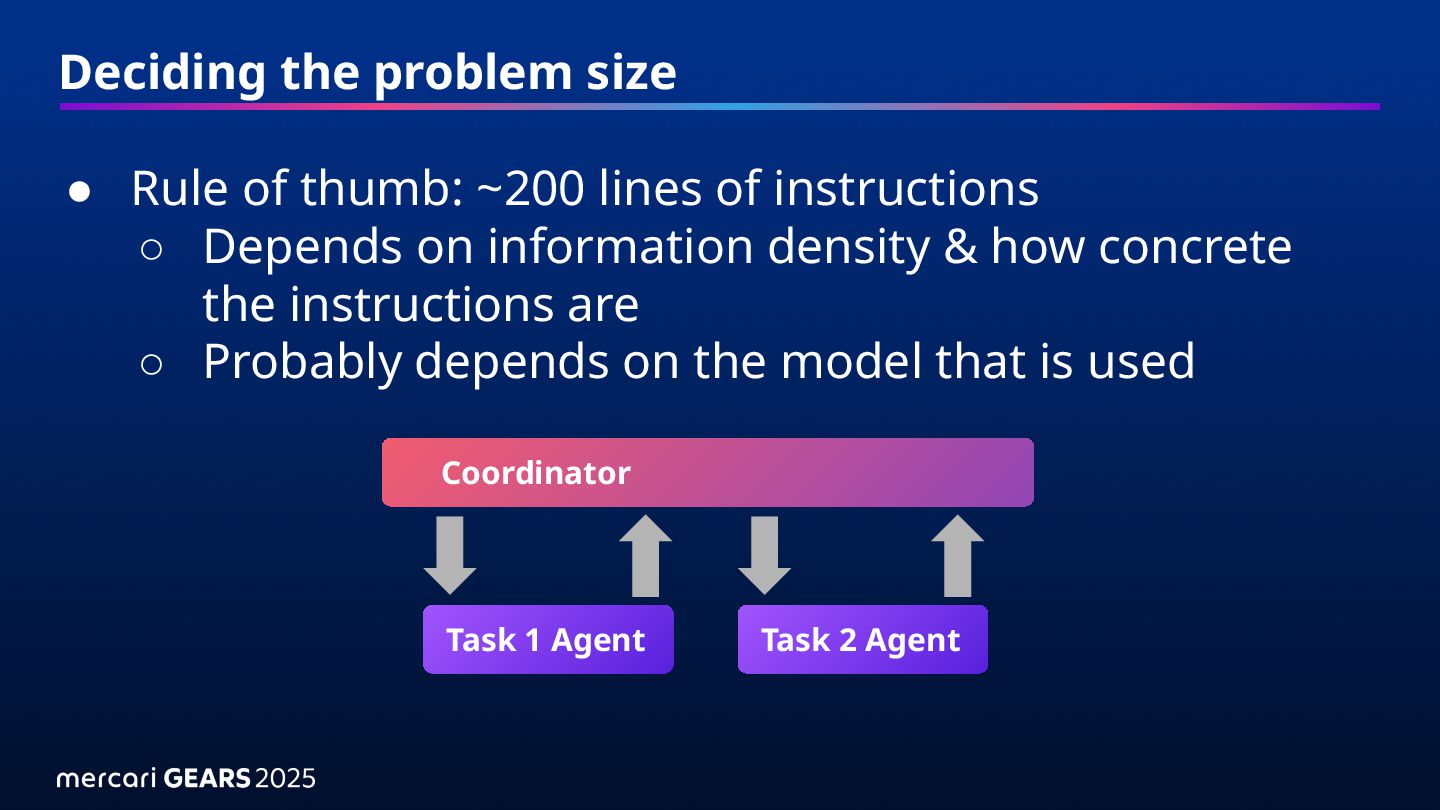 of instructions ◦ Depends on information density & how concrete the instructions are ◦ Probably depends on the model that is used Task 1 Agent Coordinator Task 2 Agent