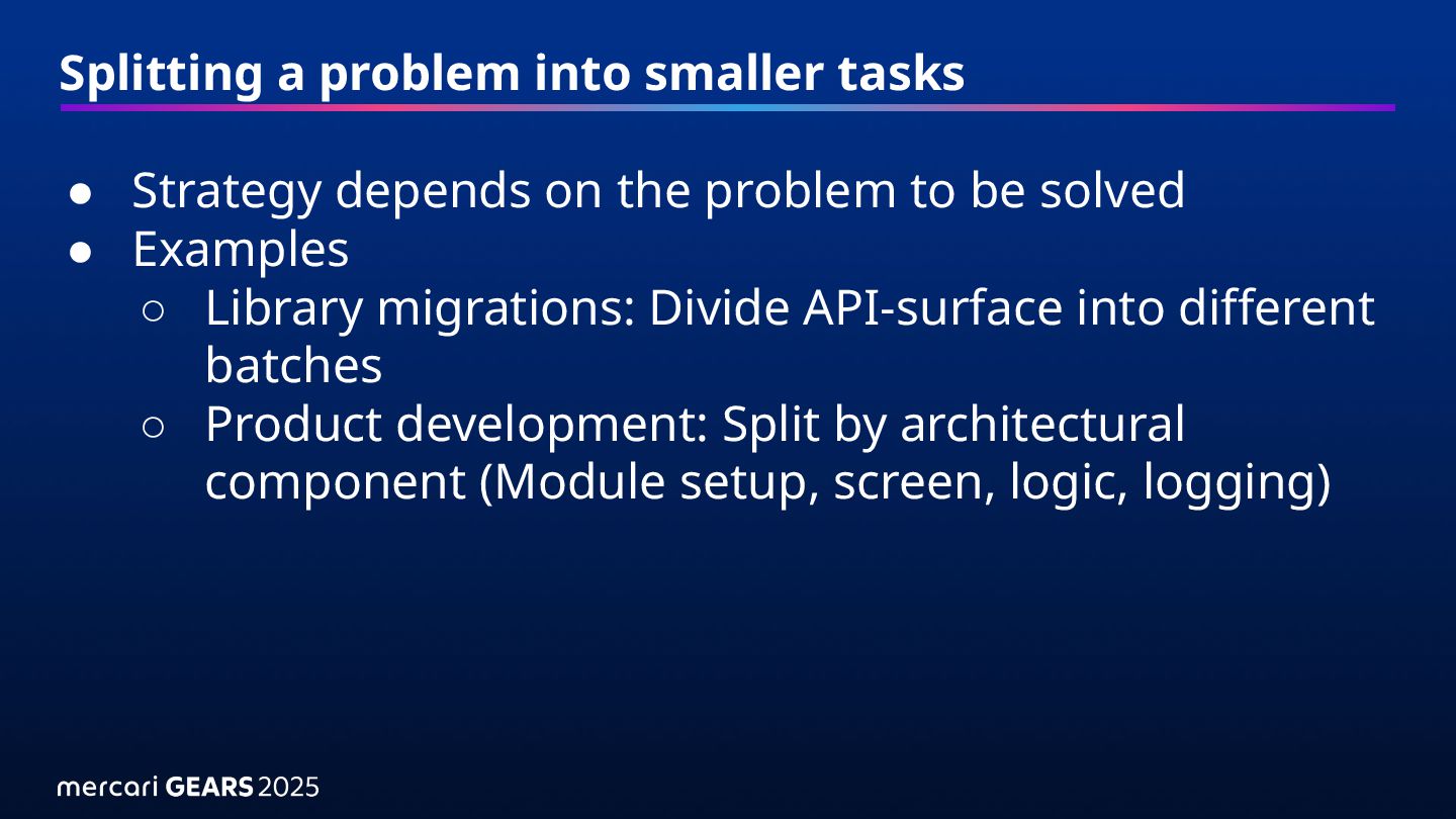 the problem to be solved • Examples ◦ Library migrations: Divide API-surface into different batches ◦ Product development: Split by architectural component (Module setup, screen, logic, logging)