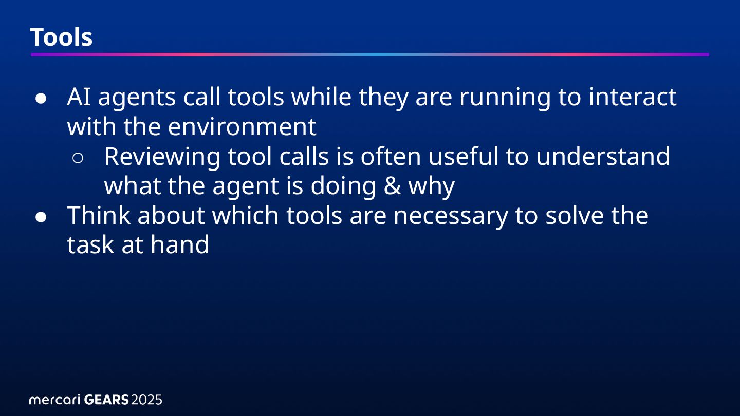 to interact with the environment ◦ Reviewing tool calls is often useful to understand what the agent is doing & why • Think about which tools are necessary to solve the task at hand