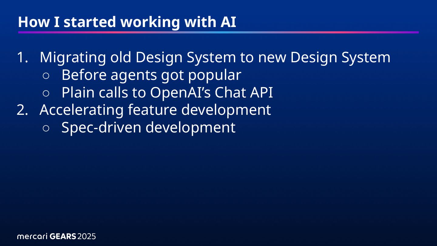 System to new Design System ◦ Before agents got popular ◦ Plain calls to OpenAI’s Chat API 2. Accelerating feature development ◦ Spec-driven development
