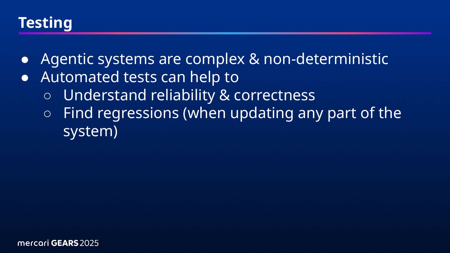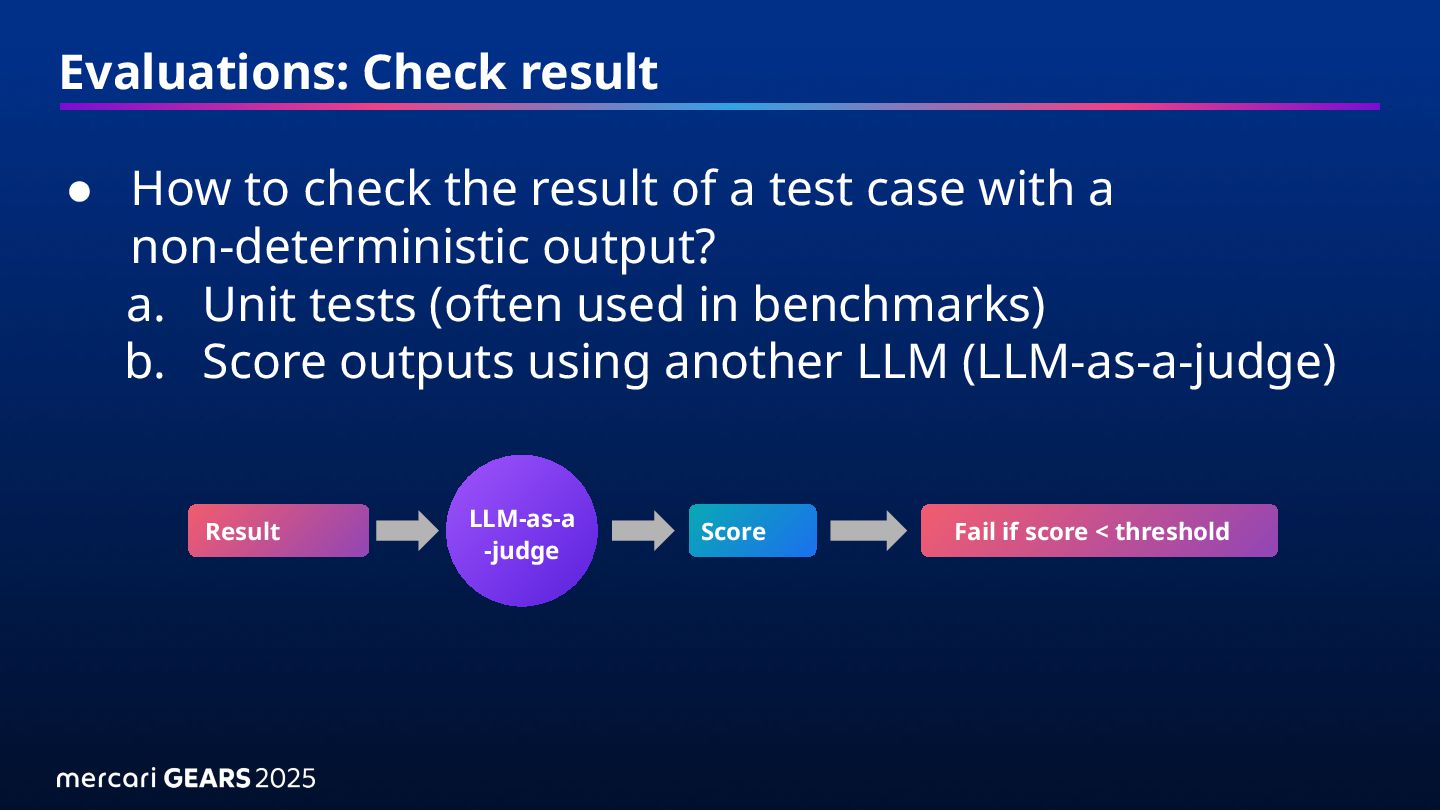 a test case with a non-deterministic output? a. Unit tests (often used in benchmarks) b. Score outputs using another LLM (LLM-as-a-judge) Result Score Fail if score < threshold LLM-as-a -judge