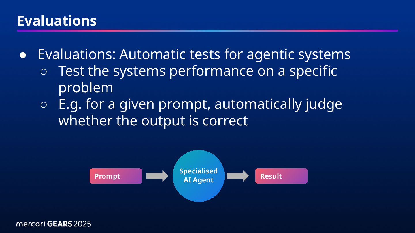 the systems performance on a specific problem ◦ E.g. for a given prompt, automatically judge whether the output is correct Specialised AI Agent Prompt Result