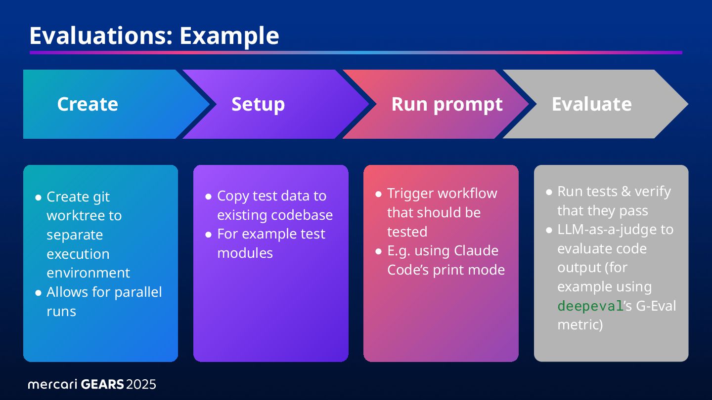 • Allows for parallel runs • Copy test data to existing codebase • For example test modules • Trigger workflow that should be tested • E.g. using Claude Code’s print mode • Run tests & verify that they pass • LLM-as-a-judge to evaluate code output (for example using deepeval’s G-Eval metric) Create Setup Run prompt Evaluate