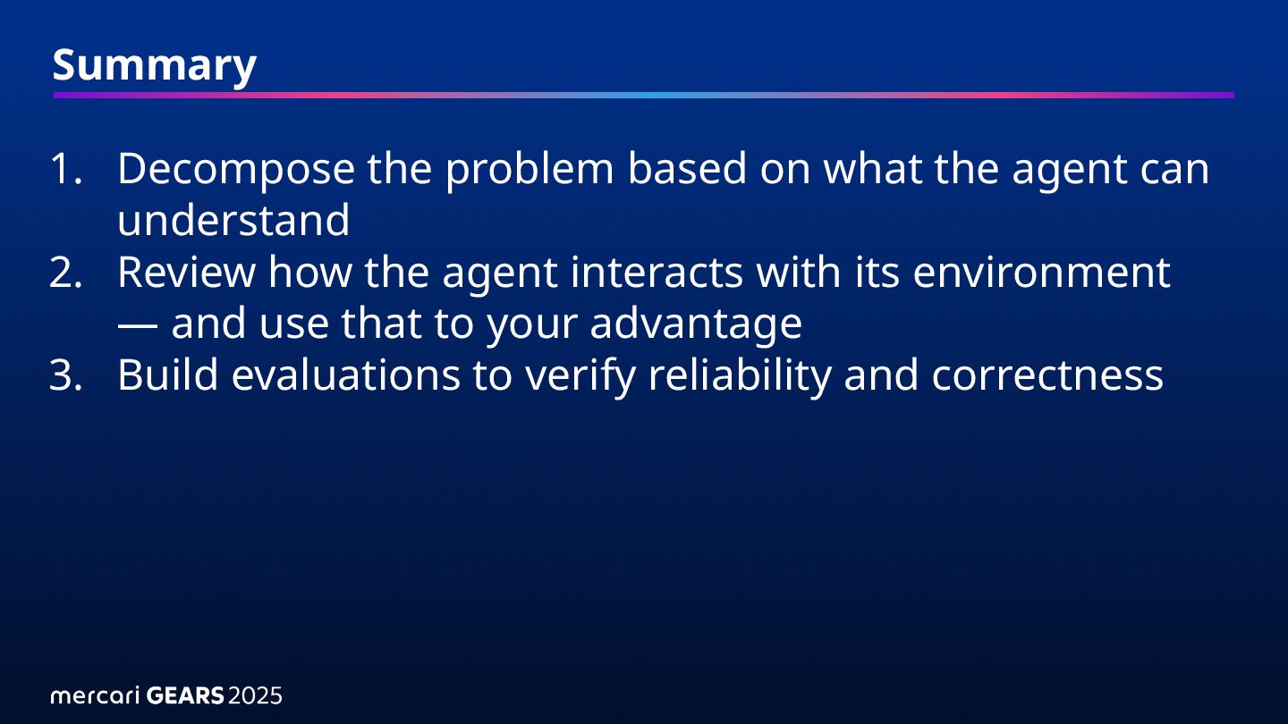 can understand 2. Review how the agent interacts with its environment — and use that to your advantage 3. Build evaluations to verify reliability and correctness