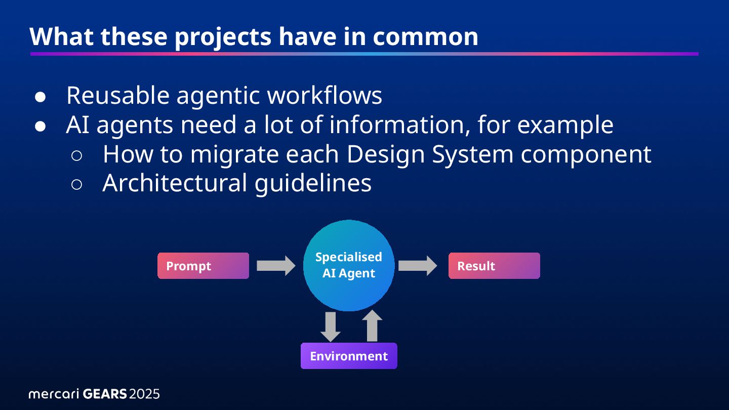 • AI agents need a lot of information, for example ◦ How to migrate each Design System component ◦ Architectural guidelines Specialised AI Agent Environment Prompt Result