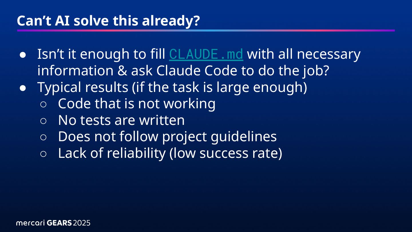 fill CLAUDE.md with all necessary information & ask Claude Code to do the job? • Typical results (if the task is large enough) ◦ Code that is not working ◦ No tests are written ◦ Does not follow project guidelines ◦ Lack of reliability (low success rate)