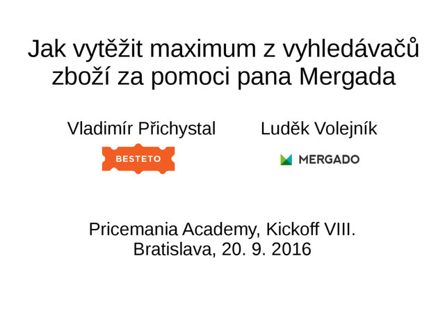 Prezentace z přednášky na Pricemania Academy Kickoff VIII. Témata: zbožové vyhledávače, Mergado, aplikace Bidding Fox, marketingový modul pro PrestaShop, vývoj aplikací pro Mergado, aj. Podrobnosti zde: http://www.mergado.cz/mergado-na-pricemania-academy-kickoff-viii