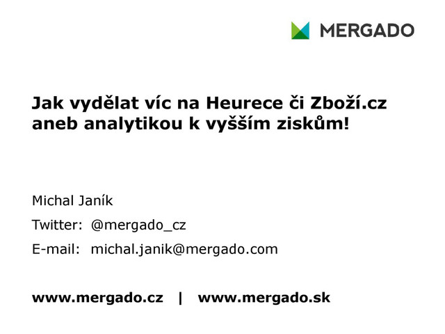 na Heureku a Google Analytics • Vyzkoušet bezplatný audit XML: app.mergado.com/audit • S dotazy se obracet na Michala: • [email protected] • +420 777 618 157