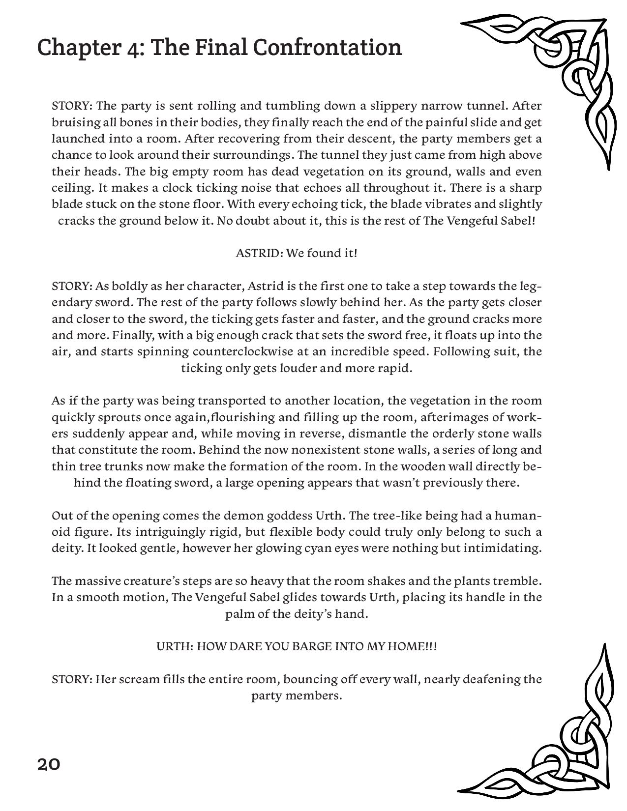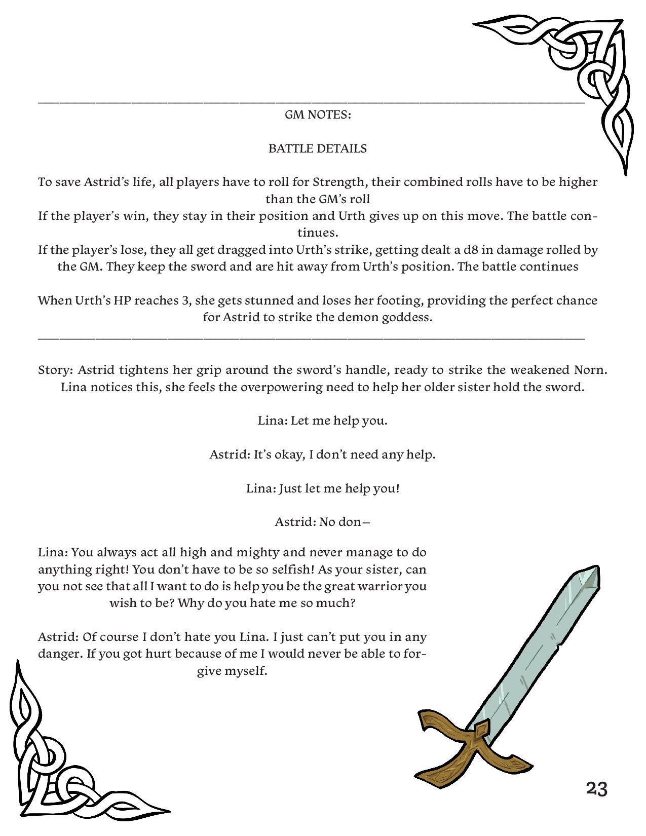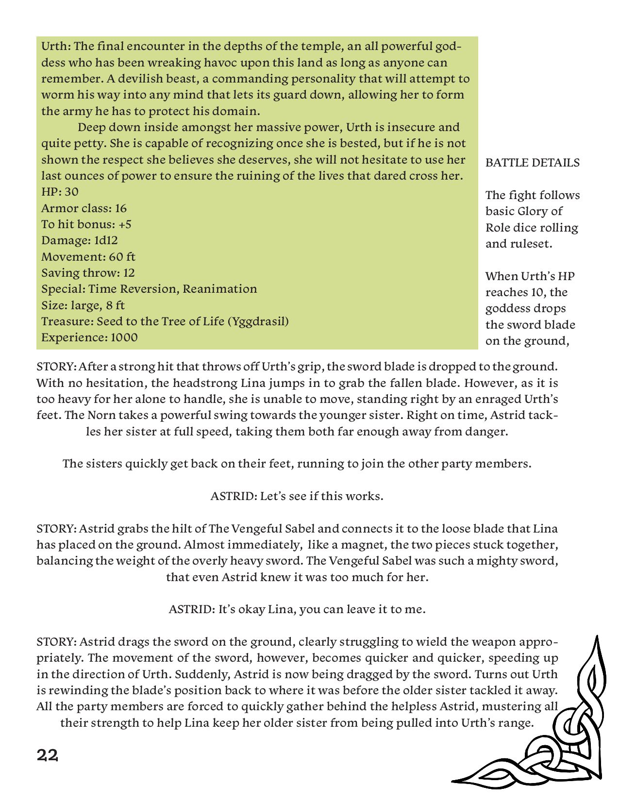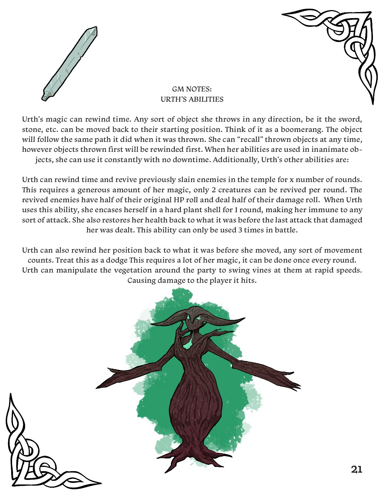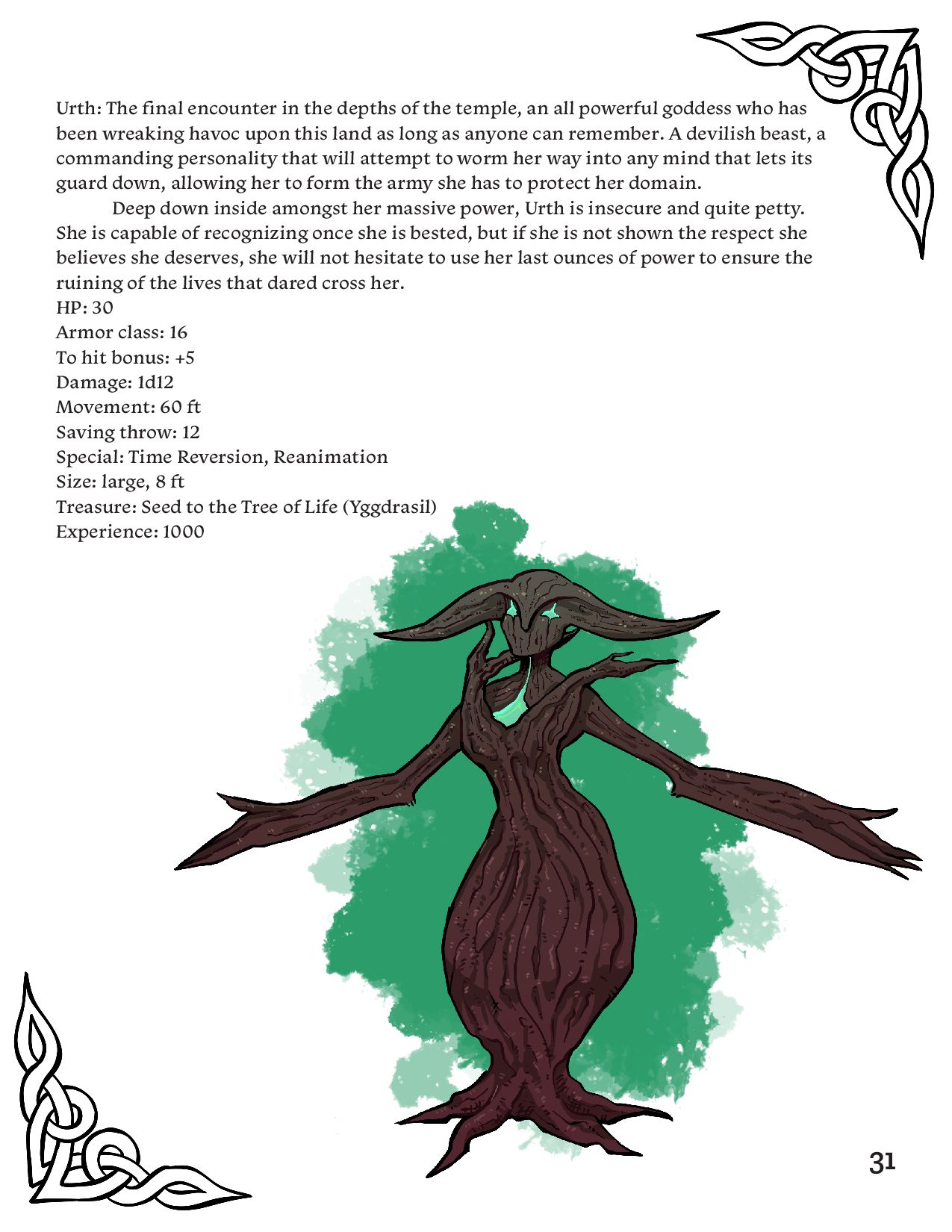 rolling and ruleset. When Urth’s HP reaches 10, the goddess drops the sword blade on the ground, Urth: The final encounter in the depths of the temple, an all powerful god- dess who has been wreaking havoc upon this land as long as anyone can remember. A devilish beast, a commanding personality that will attempt to worm his way into any mind that lets its guard down, allowing her to form the army he has to protect his domain. Deep down inside amongst her massive power, Urth is insecure and quite petty. She is capable of recognizing once she is bested, but if he is not shown the respect she believes she deserves, she will not hesitate to use her last ounces of power to ensure the ruining of the lives that dared cross her. HP: 30 Armor class: 16 To hit bonus: +5 Damage: 1d12 Movement: 60 ft Saving throw: 12 Special: Time Reversion, Reanimation Size: large, 8 ft Treasure: Seed to the Tree of Life (Yggdrasil) Experience: 1000 STORY: After a strong hit that throws off Urth’s grip, the sword blade is dropped to the ground. With no hesitation, the headstrong Lina jumps in to grab the fallen blade. However, as it is too heavy for her alone to handle, she is unable to move, standing right by an enraged Urth’s feet. The Norn takes a powerful swing towards the younger sister. Right on time, Astrid tack- les her sister at full speed, taking them both far enough away from danger. The sisters quickly get back on their feet, running to join the other party members. ASTRID: Let’s see if this works. STORY: Astrid grabs the hilt of The Vengeful Sabel and connects it to the loose blade that Lina has placed on the ground. Almost immediately, like a magnet, the two pieces stuck together, balancing the weight of the overly heavy sword. The Vengeful Sabel was such a mighty sword, that even Astrid knew it was too much for her. ASTRID: It’s okay Lina, you can leave it to me. STORY: Astrid drags the sword on the ground, clearly struggling to wield the weapon appro- priately. The movement of the sword, however, becomes quicker and quicker, speeding up in the direction of Urth. Suddenly, Astrid is now being dragged by the sword. Turns out Urth is rewinding the blade’s position back to where it was before the older sister tackled it away. All the party members are forced to quickly gather behind the helpless Astrid, mustering all their strength to help Lina keep her older sister from being pulled into Urth’s range. 22