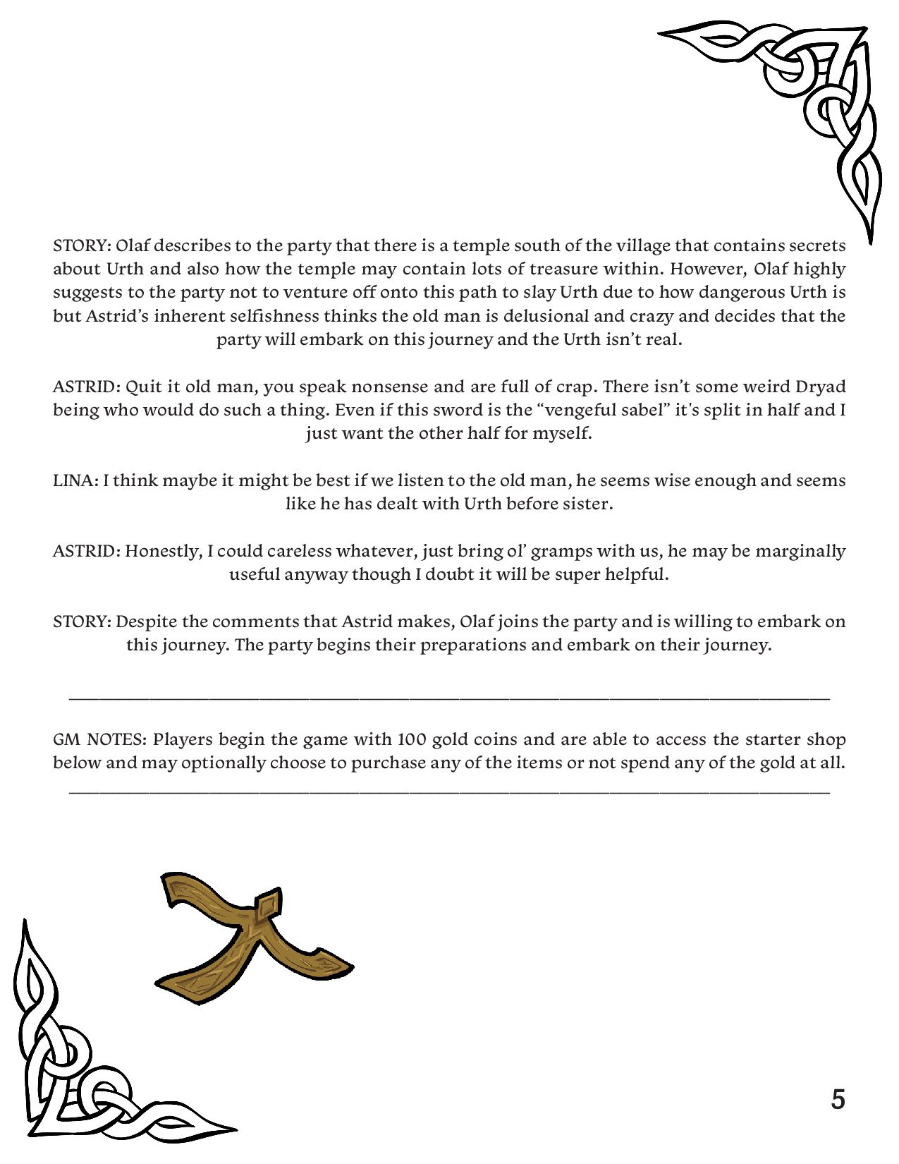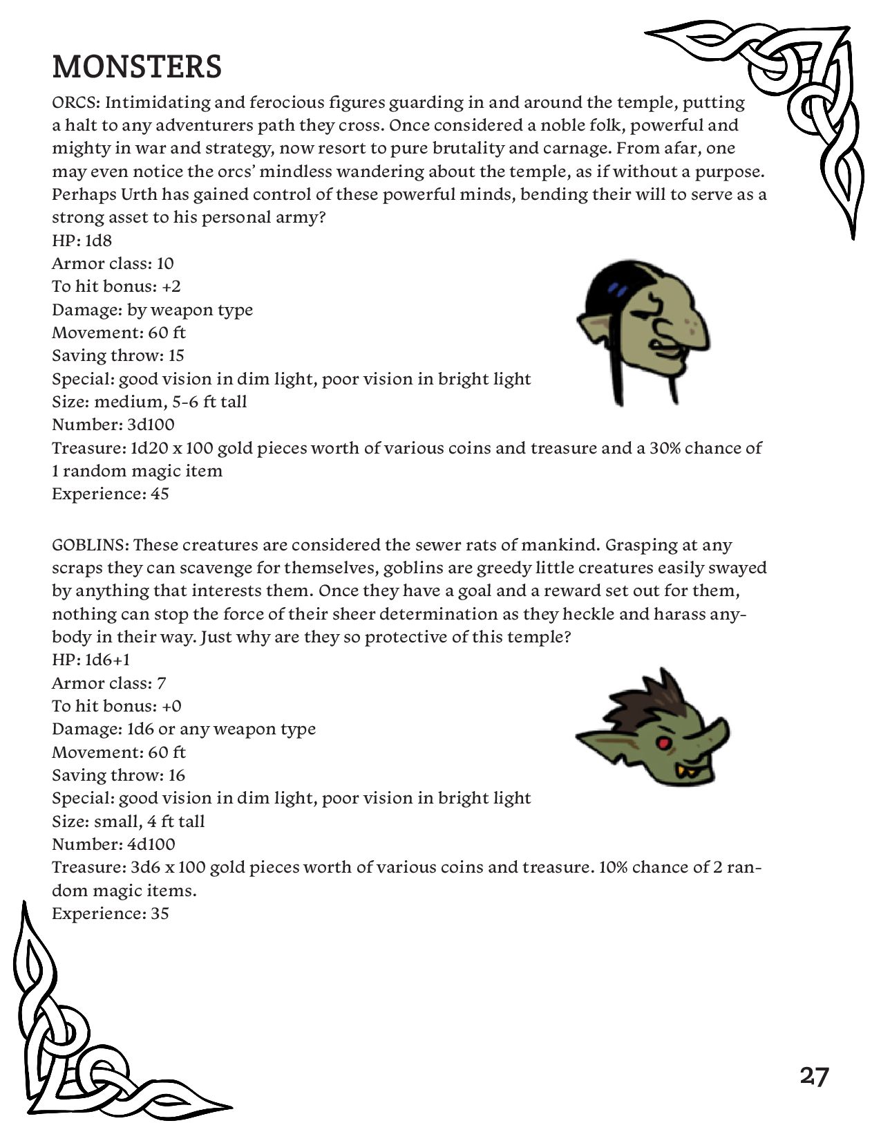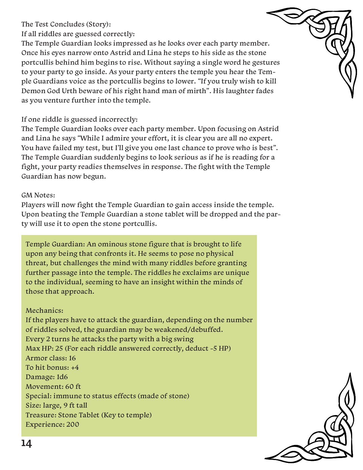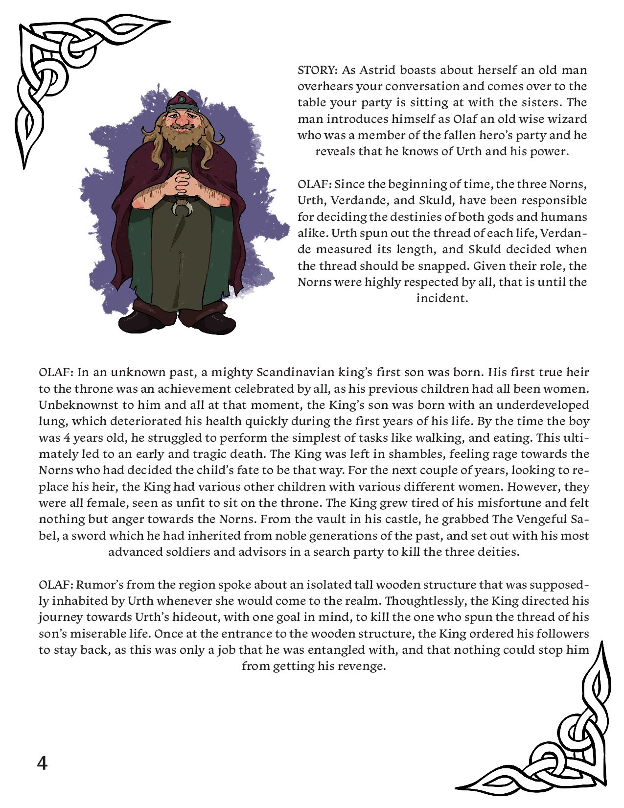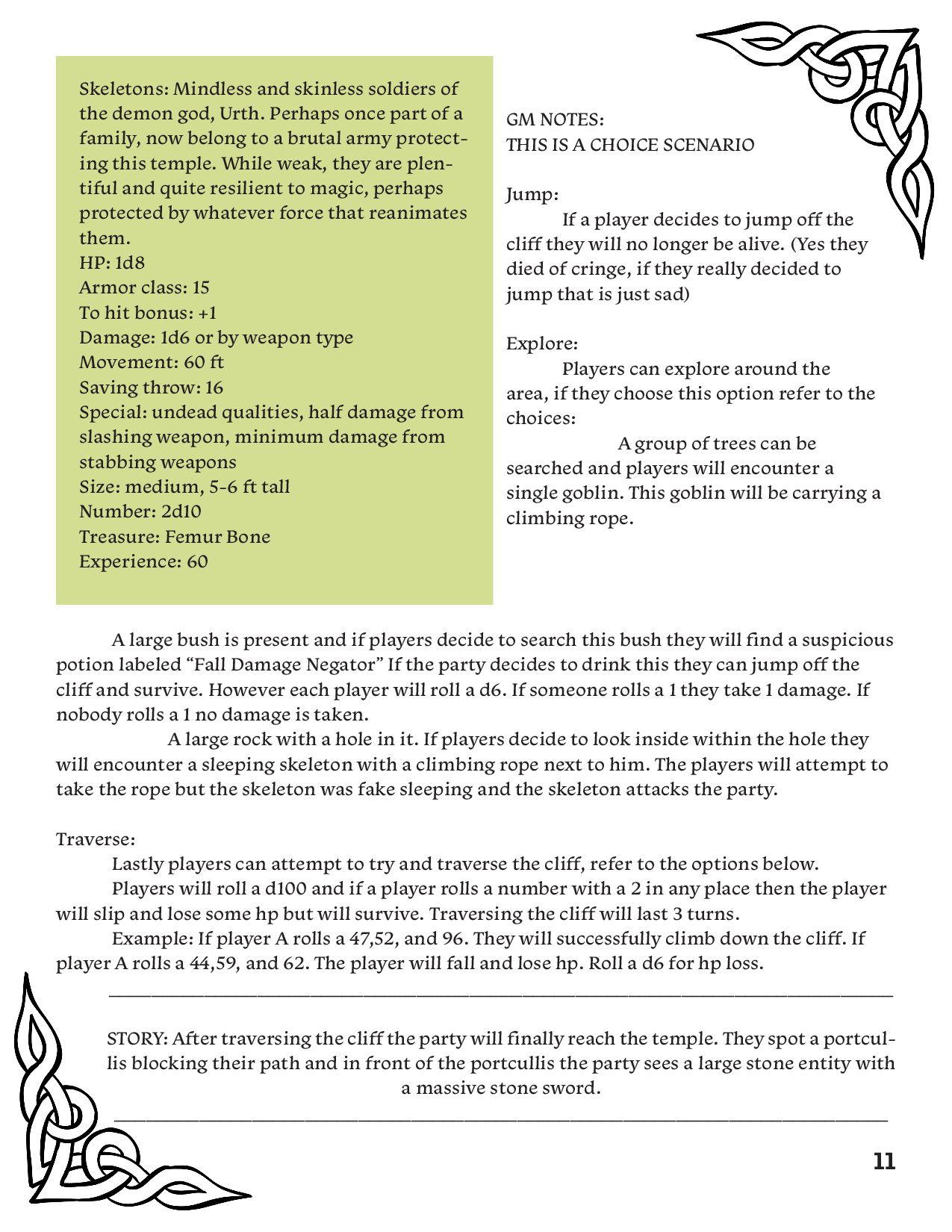 rolling and ruleset. When Urth’s HP reaches 10, the goddess drops the sword blade on the ground, Urth: The final encounter in the depths of the temple, an all powerful god- dess who has been wreaking havoc upon this land as long as anyone can remember. A devilish beast, a commanding personality that will attempt to worm his way into any mind that lets its guard down, allowing her to form the army he has to protect his domain. Deep down inside amongst her massive power, Urth is insecure and quite petty. She is capable of recognizing once she is bested, but if he is not shown the respect she believes she deserves, she will not hesitate to use her last ounces of power to ensure the ruining of the lives that dared cross her. HP: 30 Armor class: 16 To hit bonus: +5 Damage: 1d12 Movement: 60 ft Saving throw: 12 Special: Time Reversion, Reanimation Size: large, 8 ft Treasure: Seed to the Tree of Life (Yggdrasil) Experience: 1000 STORY: After a strong hit that throws off Urth’s grip, the sword blade is dropped to the ground. With no hesitation, the headstrong Lina jumps in to grab the fallen blade. However, as it is too heavy for her alone to handle, she is unable to move, standing right by an enraged Urth’s feet. The Norn takes a powerful swing towards the younger sister. Right on time, Astrid tack- les her sister at full speed, taking them both far enough away from danger. The sisters quickly get back on their feet, running to join the other party members. ASTRID: Let’s see if this works. STORY: Astrid grabs the hilt of The Vengeful Sabel and connects it to the loose blade that Lina has placed on the ground. Almost immediately, like a magnet, the two pieces stuck together, balancing the weight of the overly heavy sword. The Vengeful Sabel was such a mighty sword, that even Astrid knew it was too much for her. ASTRID: It’s okay Lina, you can leave it to me. STORY: Astrid drags the sword on the ground, clearly struggling to wield the weapon appro- priately. The movement of the sword, however, becomes quicker and quicker, speeding up in the direction of Urth. Suddenly, Astrid is now being dragged by the sword. Turns out Urth is rewinding the blade’s position back to where it was before the older sister tackled it away. All the party members are forced to quickly gather behind the helpless Astrid, mustering all their strength to help Lina keep her older sister from being pulled into Urth’s range. 22